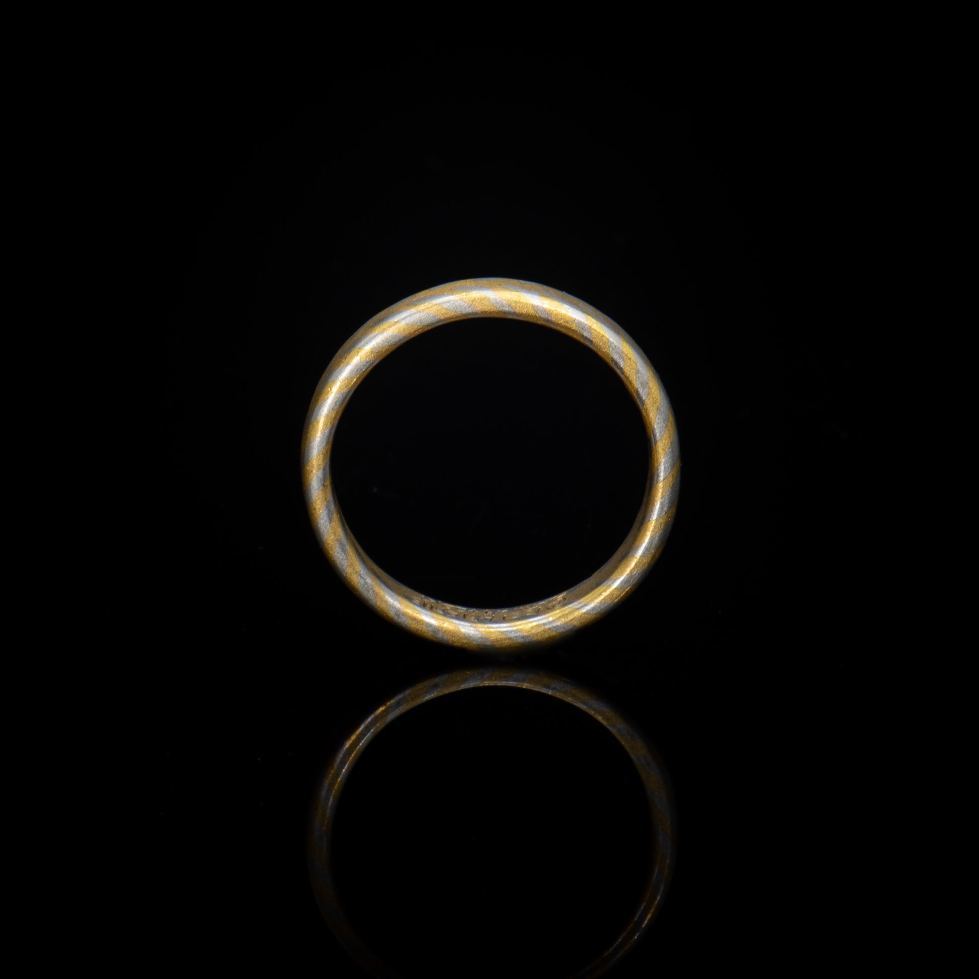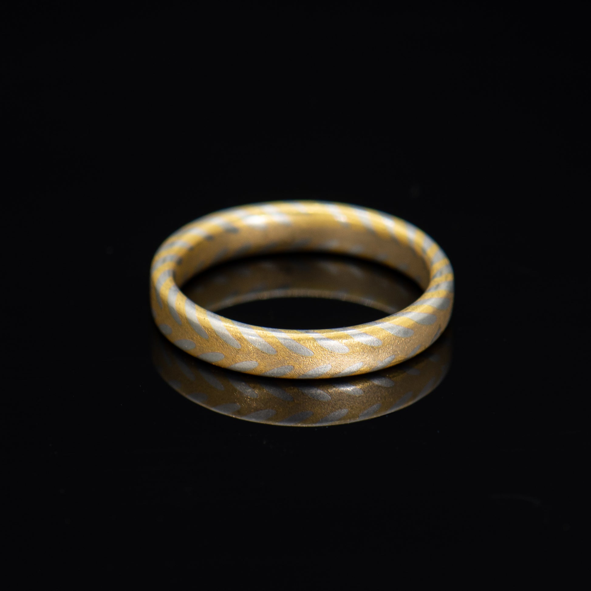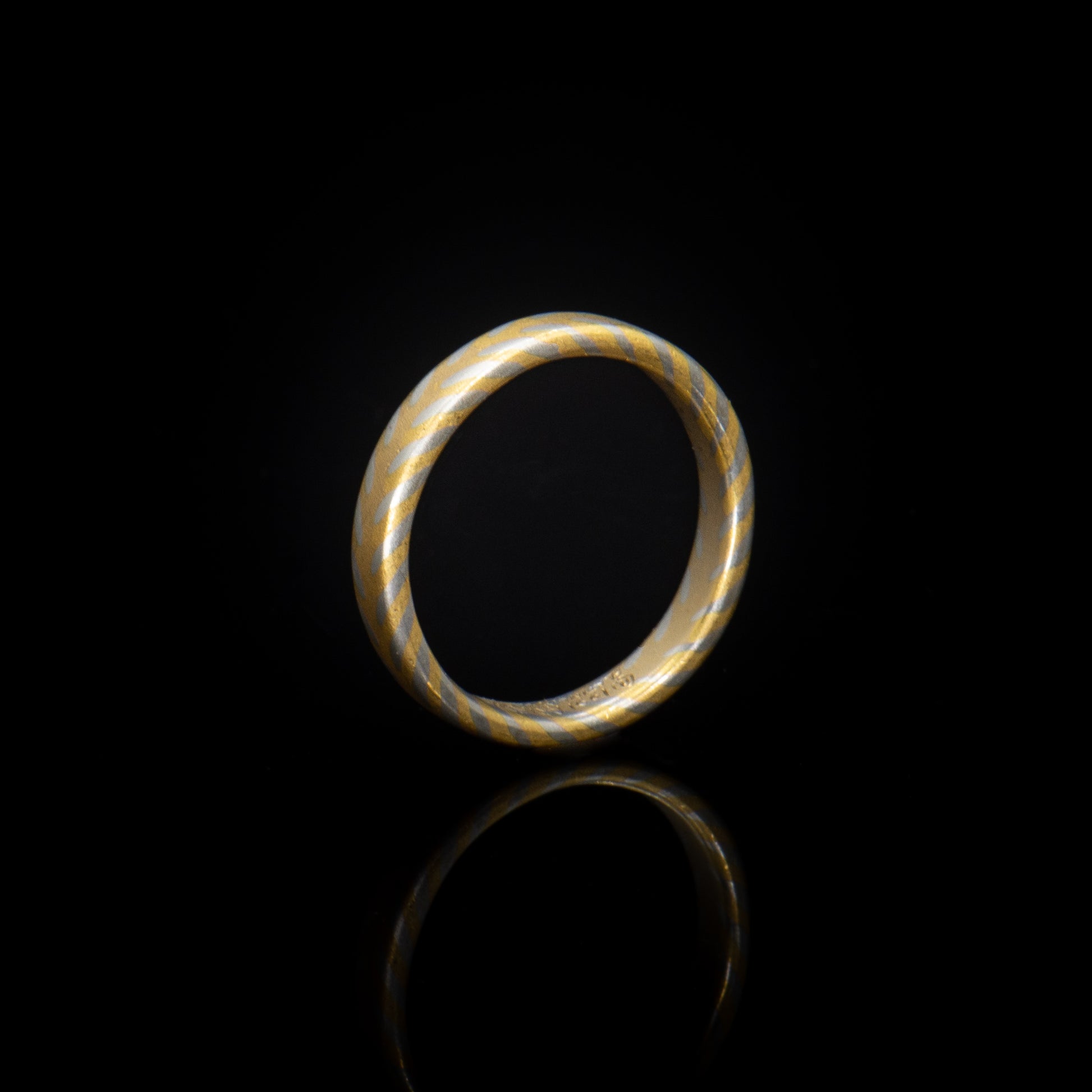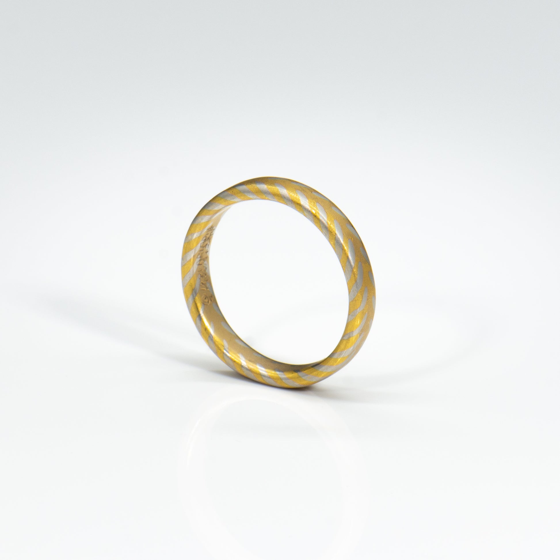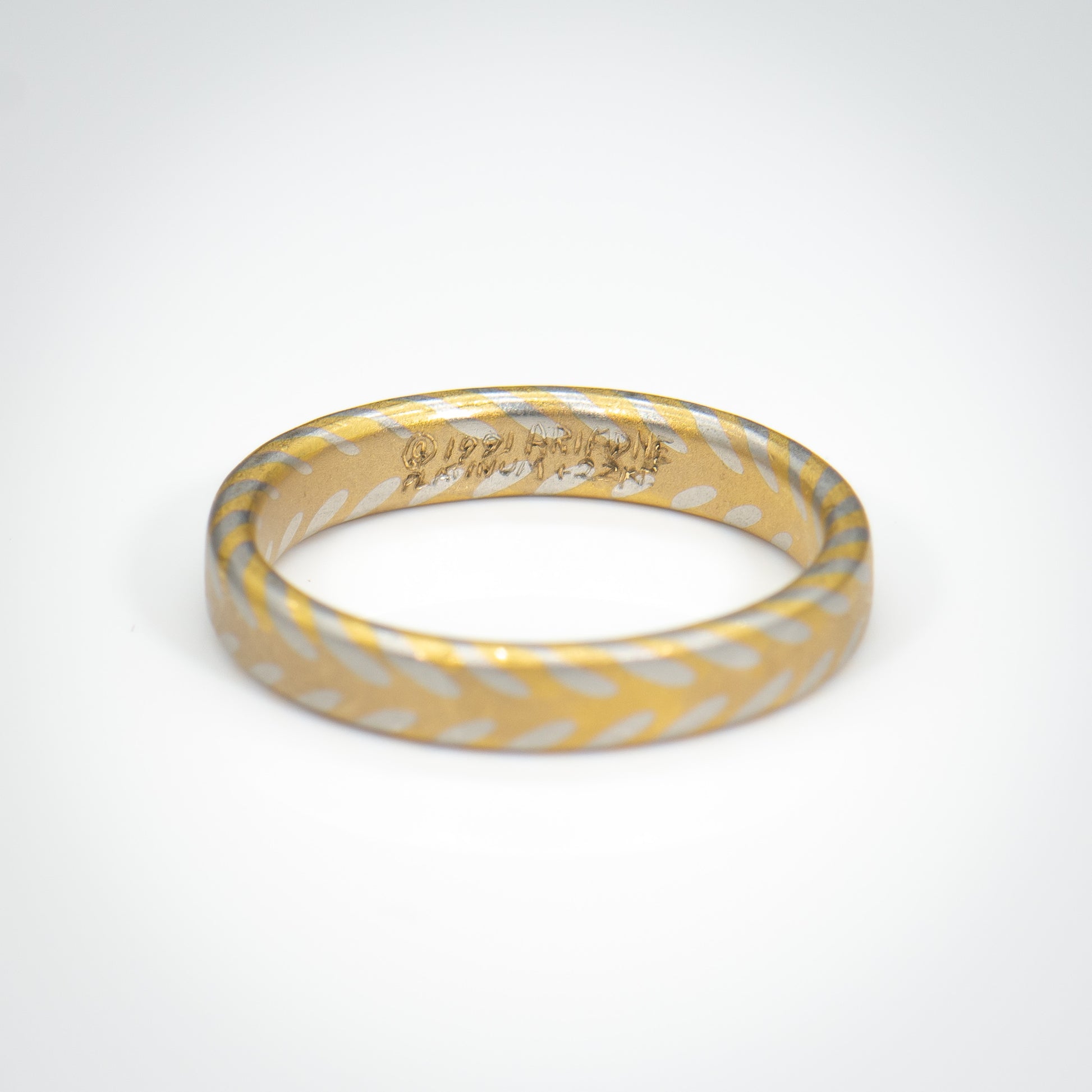 Este extraordinario anillo está elaborado en platino adornado con oro de 22k con un sutil motivo de volutas. Un anillo cautivador que es ideal para hombres o mujeres y es perfecto para usar solo o junto con tus favoritos.