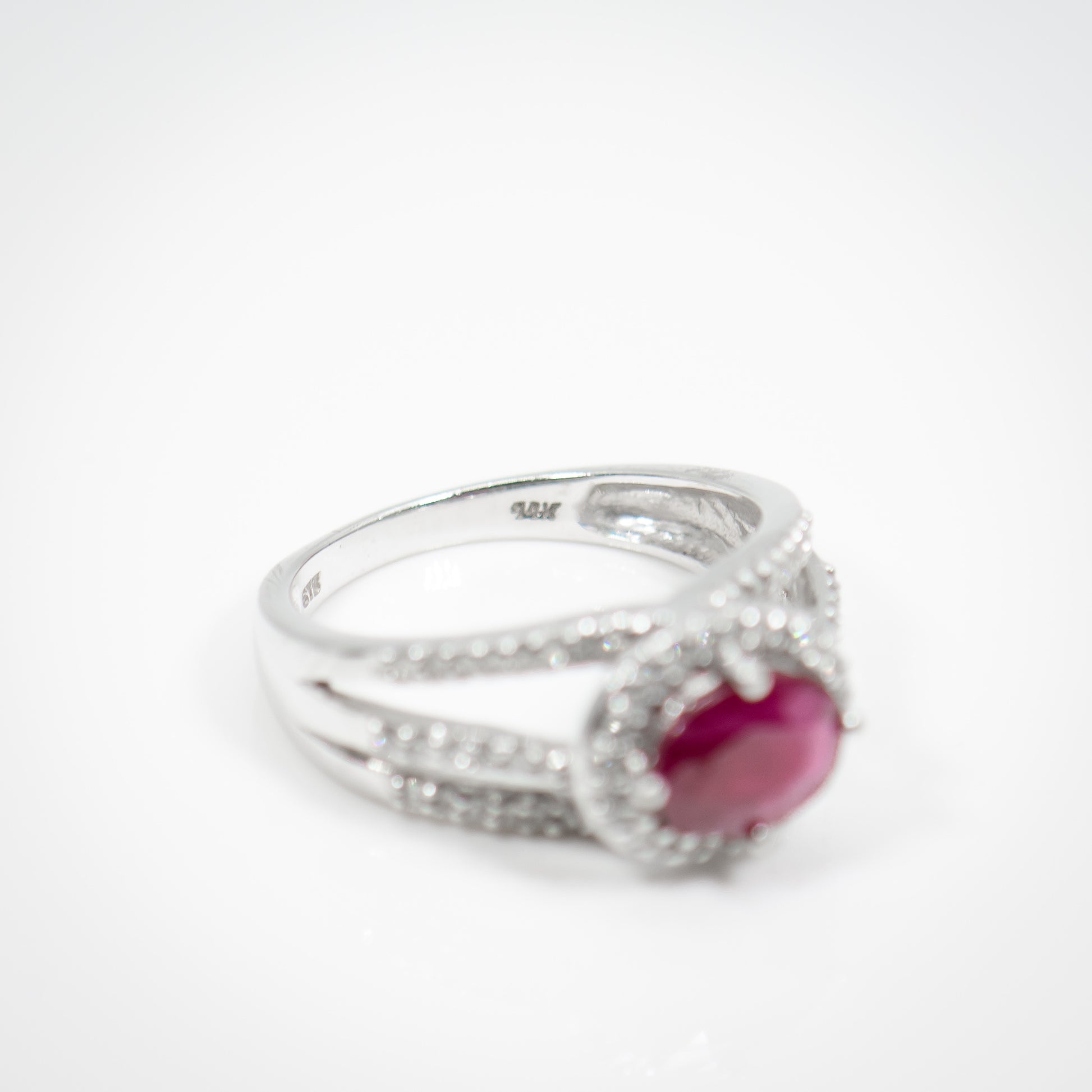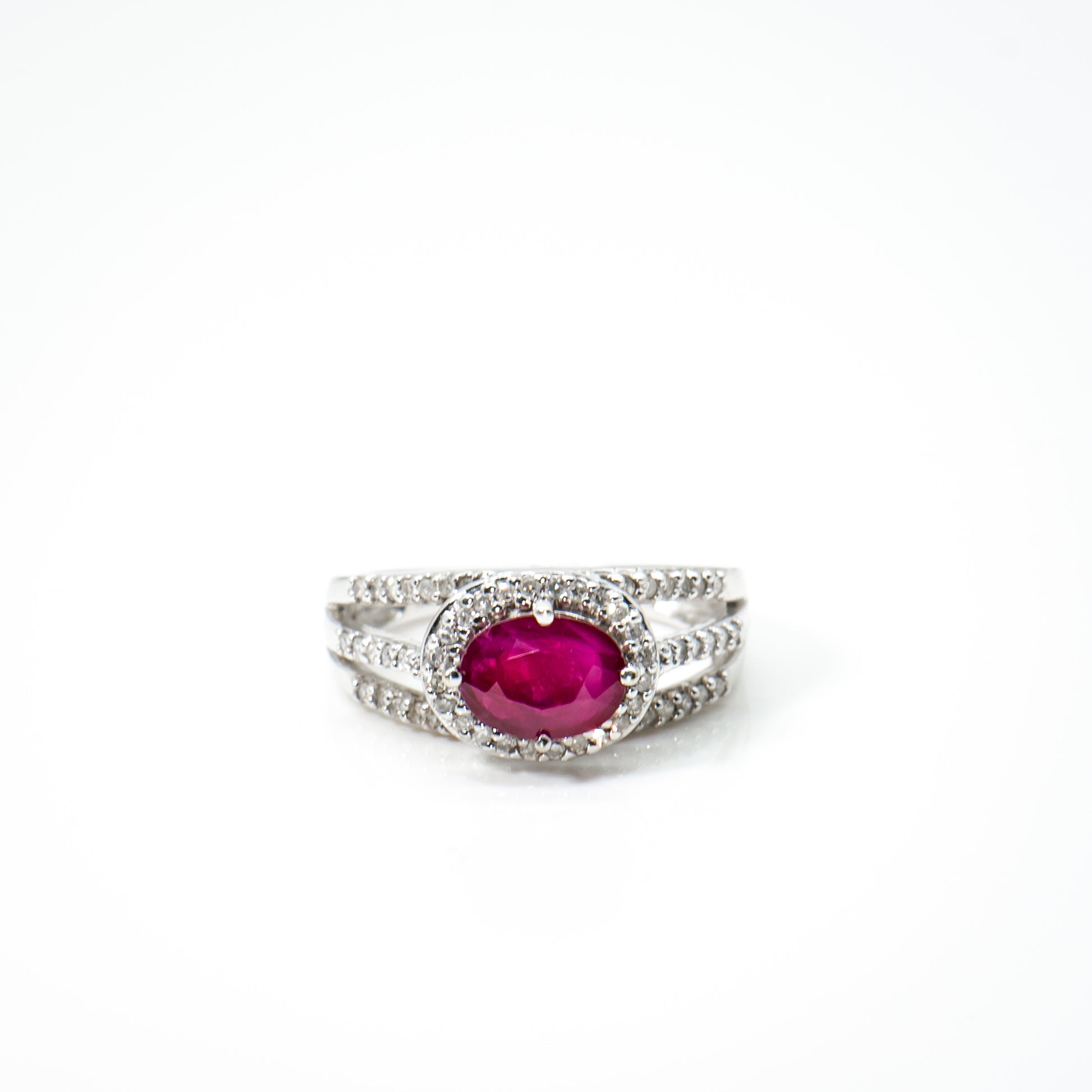 Este excitante anillo se compone de un rubí facetado de forma ovalada con un total de aproximadamente 1,10 quilates y diamantes con un total de aproximadamente 0,30 quilates. El hermoso diseño está engastado en oro blanco de 14k. Este tesoro es un anillo de compromiso ideal y es un regalo perfecto de aniversario, boda o vacaciones.