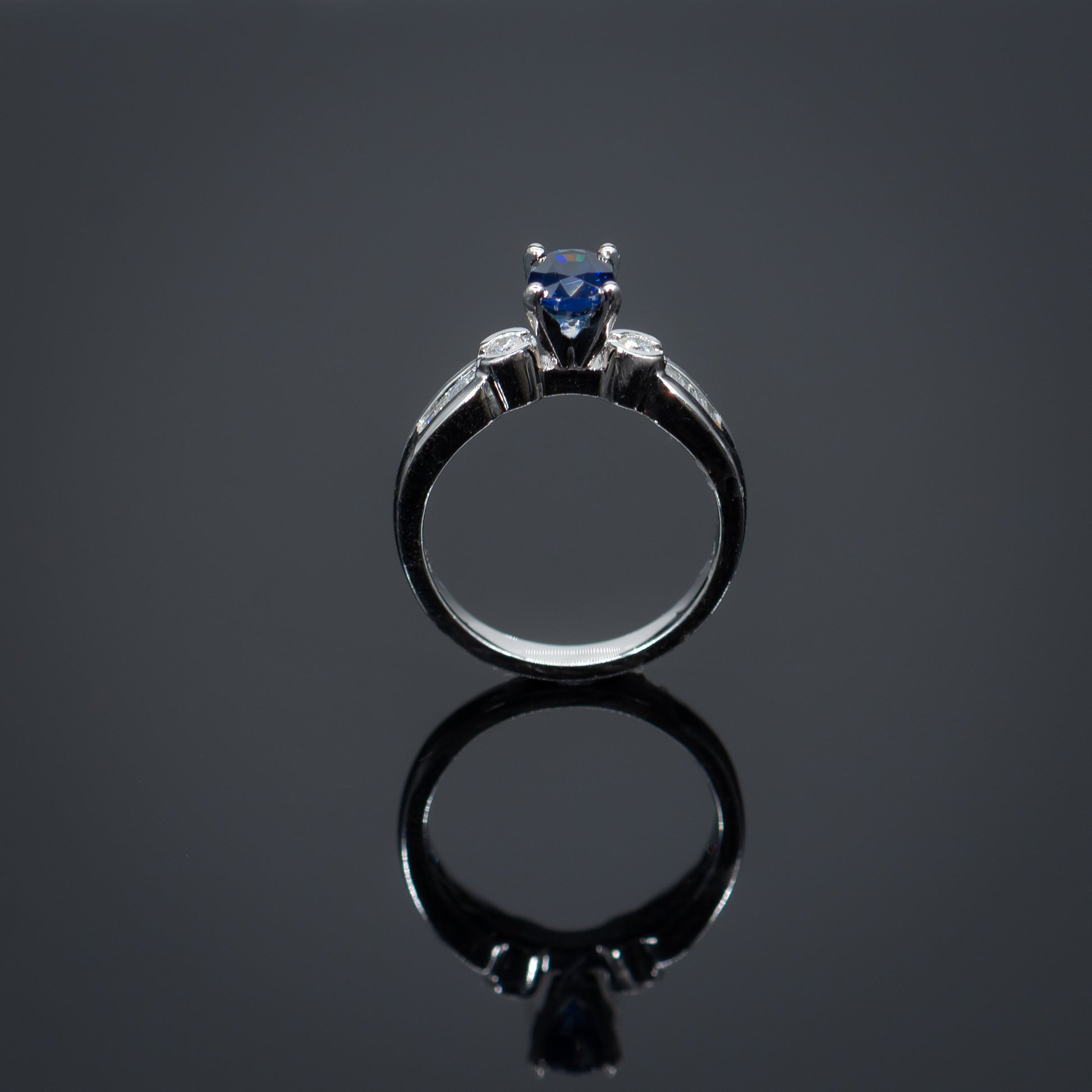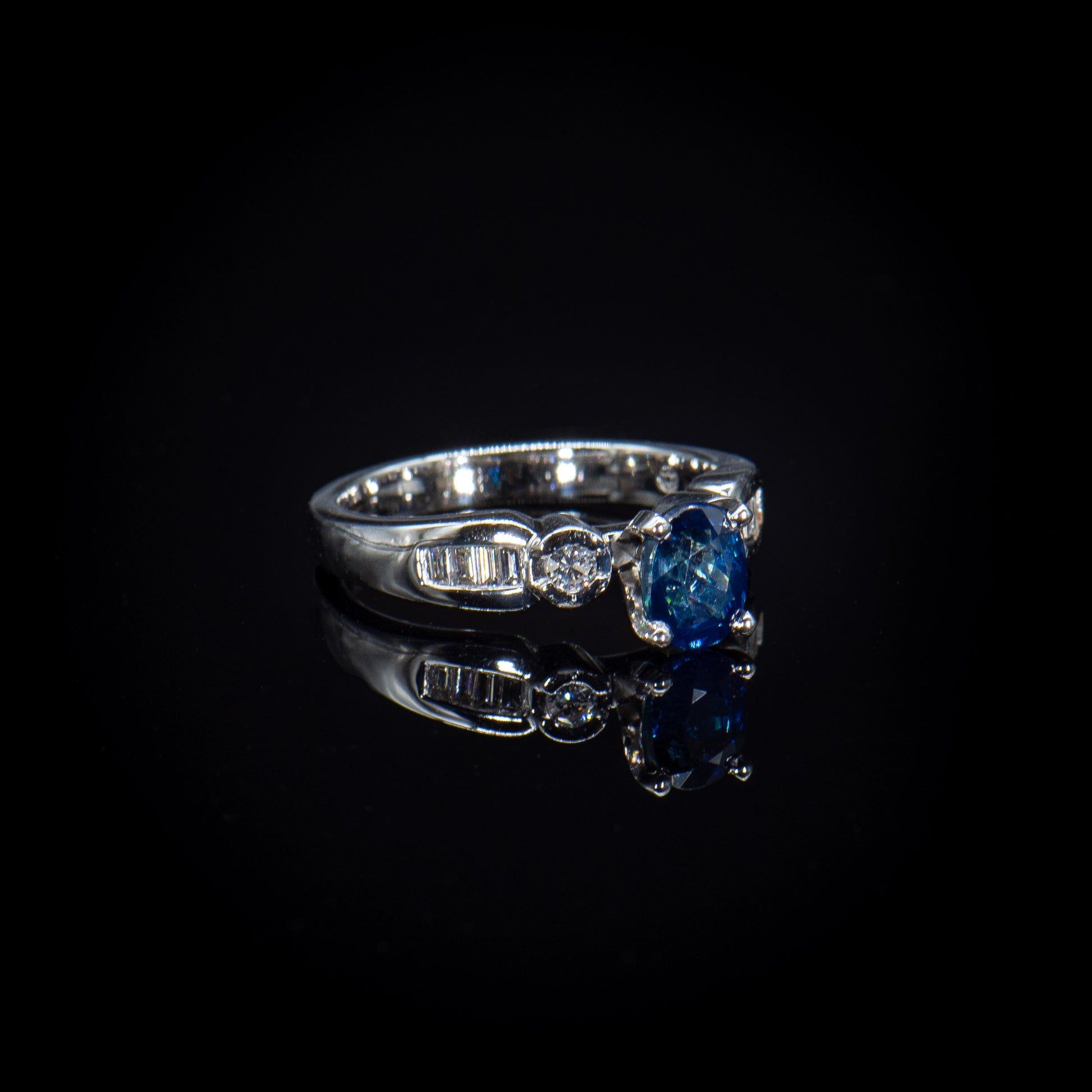 This captivating ring is designed with a centered, faceted oval blue sapphire, weighing 1.13 carats, bordered by round and baguette shape natural diamonds, weighing approximately 0.35 carats, set in 14k white gold. Current size is 5.75, and is sizable.
