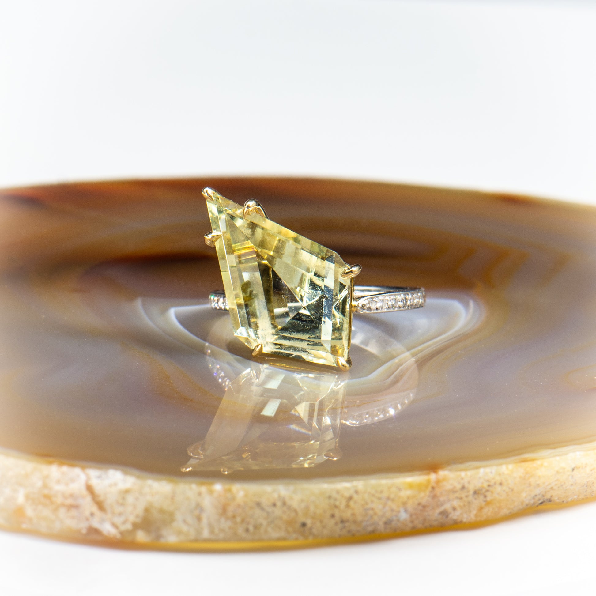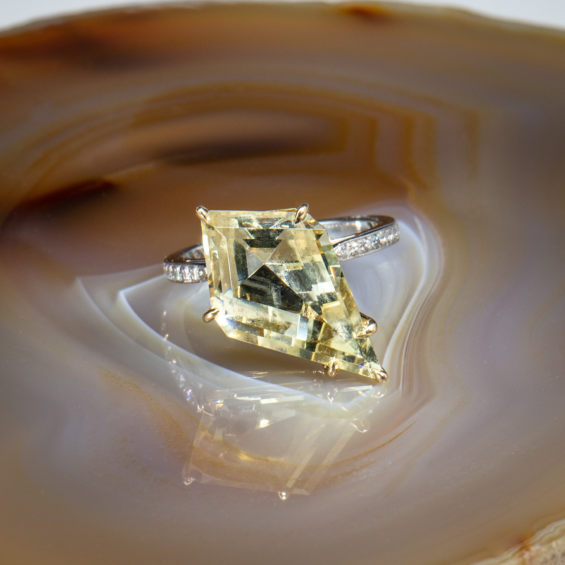 The Praseolite gemstone is the color of sea foam; the unique shape and projected setting brings to mind dramatic cliffs along the shore.