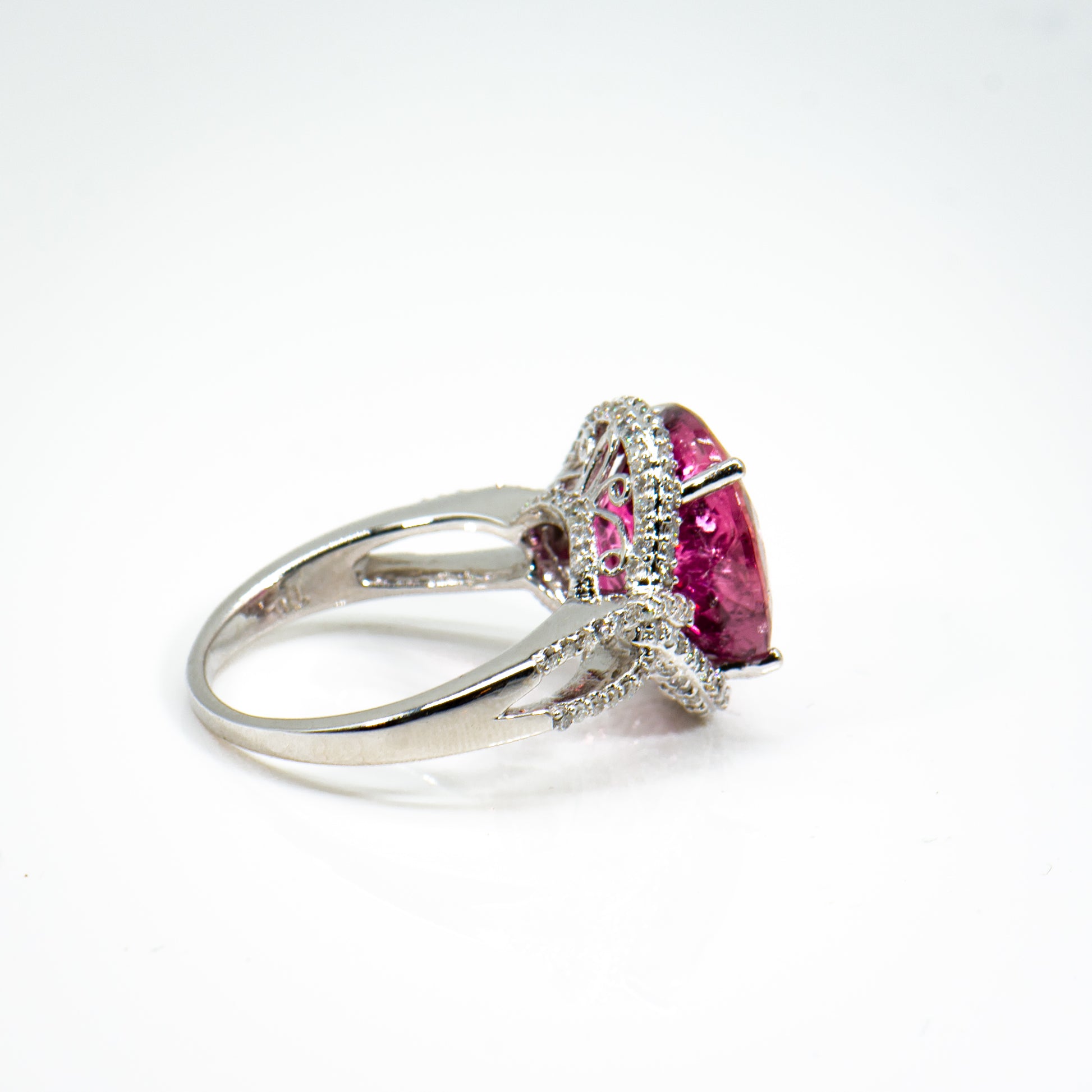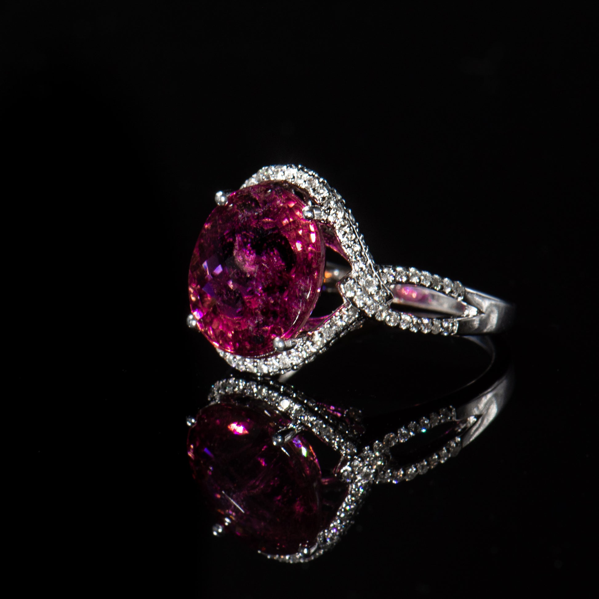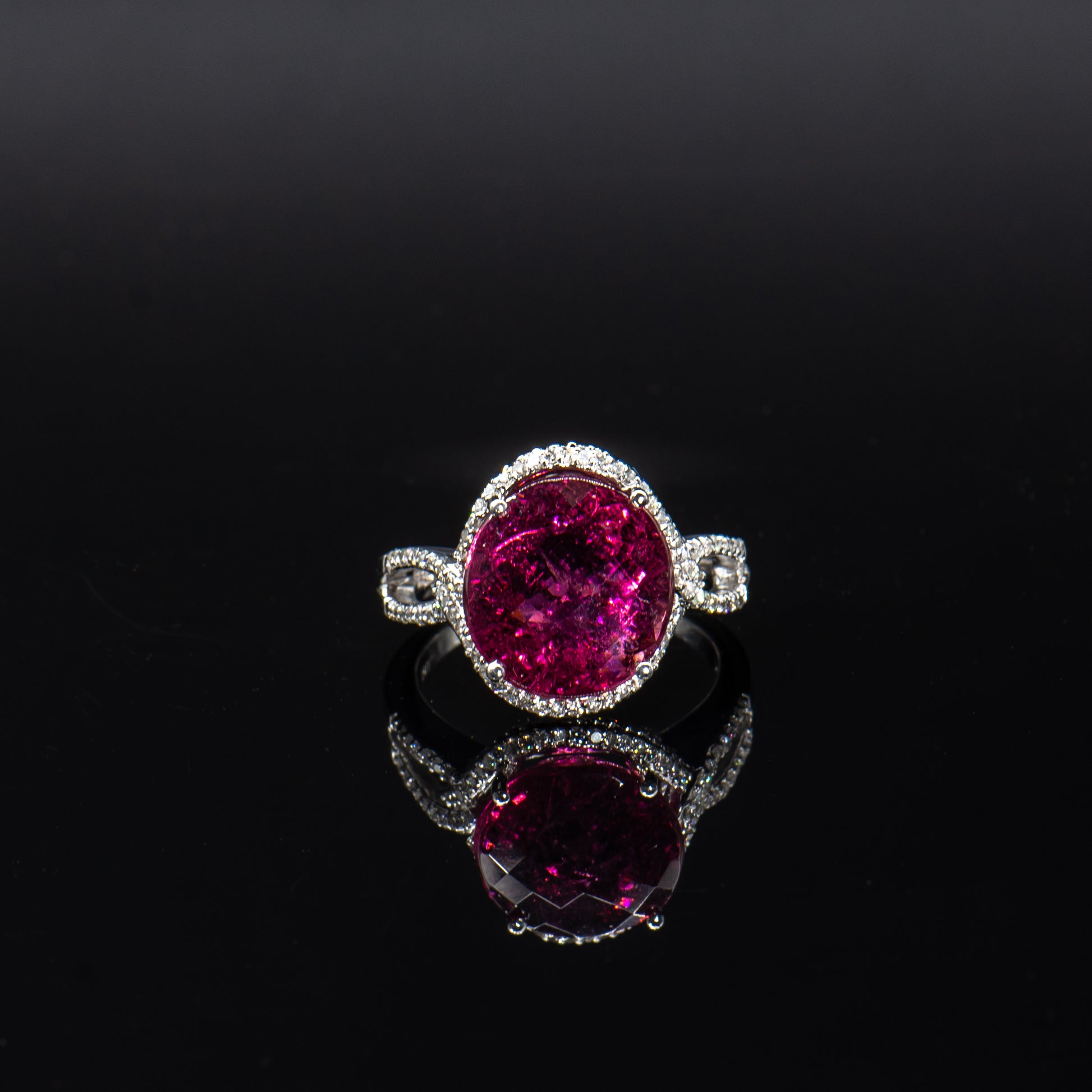 Este impresionante anillo centra una gran turmalina rosa vívida facetada ovalada (aproximadamente 11.00 quilates) y brillantes diamantes blancos redondos (aproximadamente .50 quilates de color G-H, claridad VS2 / SI1) en un llamativo engaste de halo de oro blanco. Los diamantes de acento adicionales brillan a lo largo de la banda. Este exquisito anillo es perfecto para cualquier amante de las joyas.