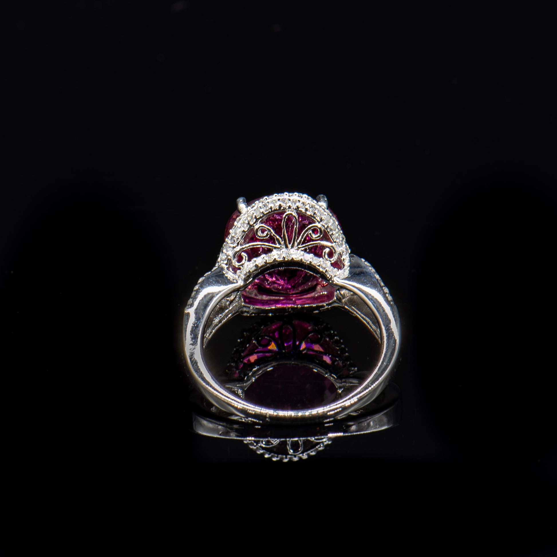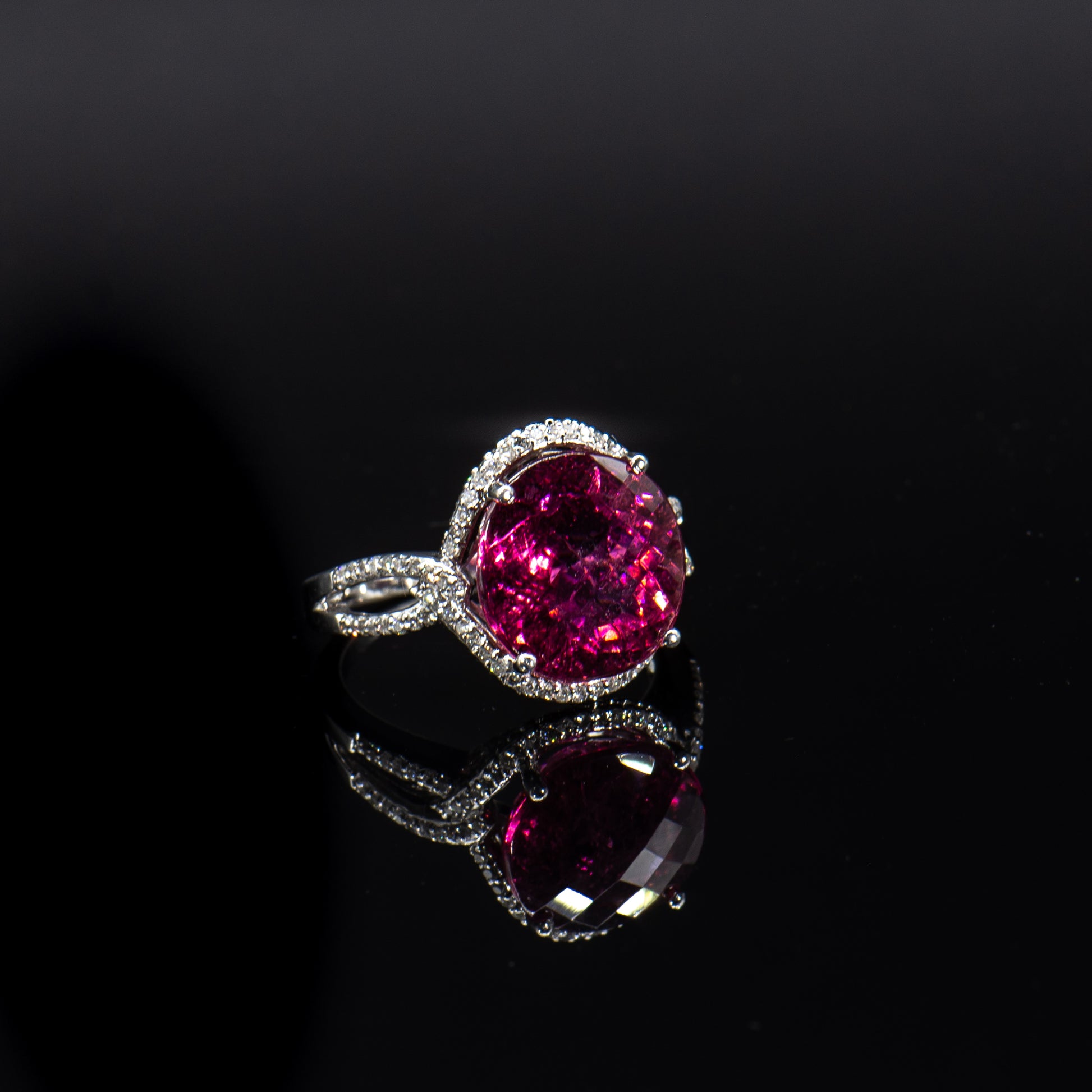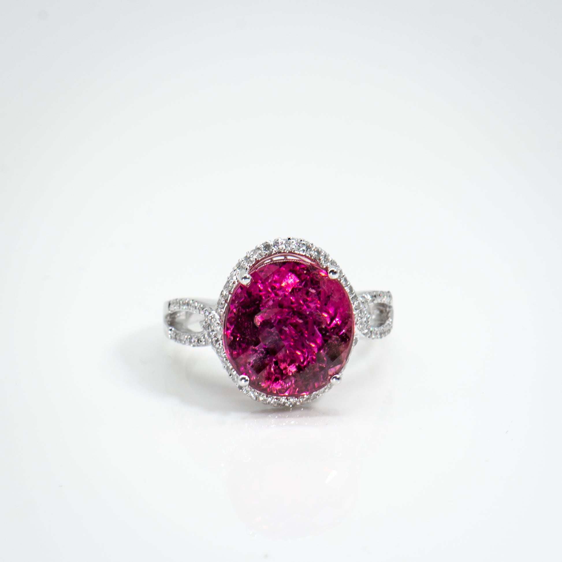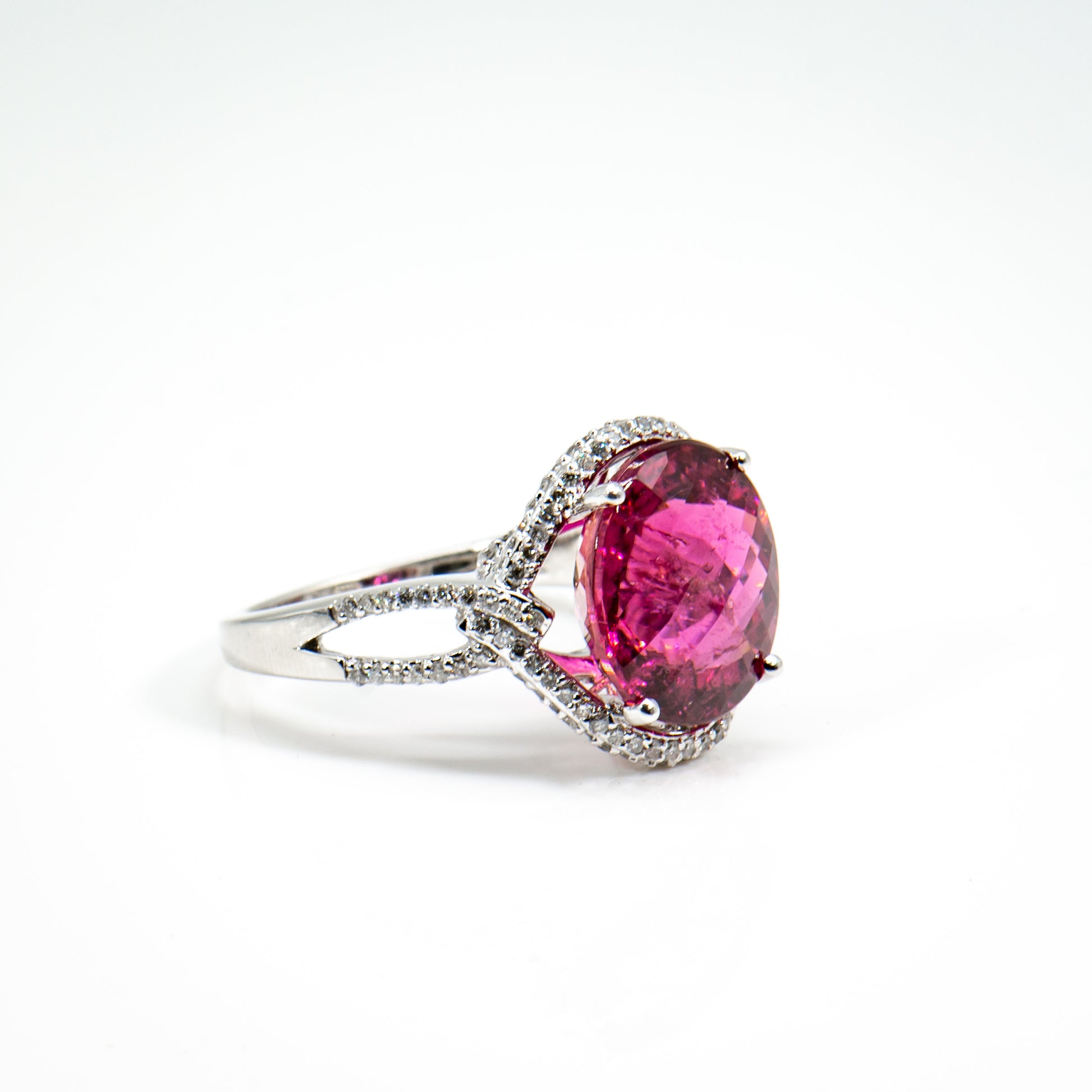 Este impresionante anillo centra una gran turmalina rosa vívida facetada ovalada (aproximadamente 11.00 quilates) y brillantes diamantes blancos redondos (aproximadamente .50 quilates de color G-H, claridad VS2 / SI1) en un llamativo engaste de halo de oro blanco. Los diamantes de acento adicionales brillan a lo largo de la banda. Este exquisito anillo es perfecto para cualquier amante de las joyas.