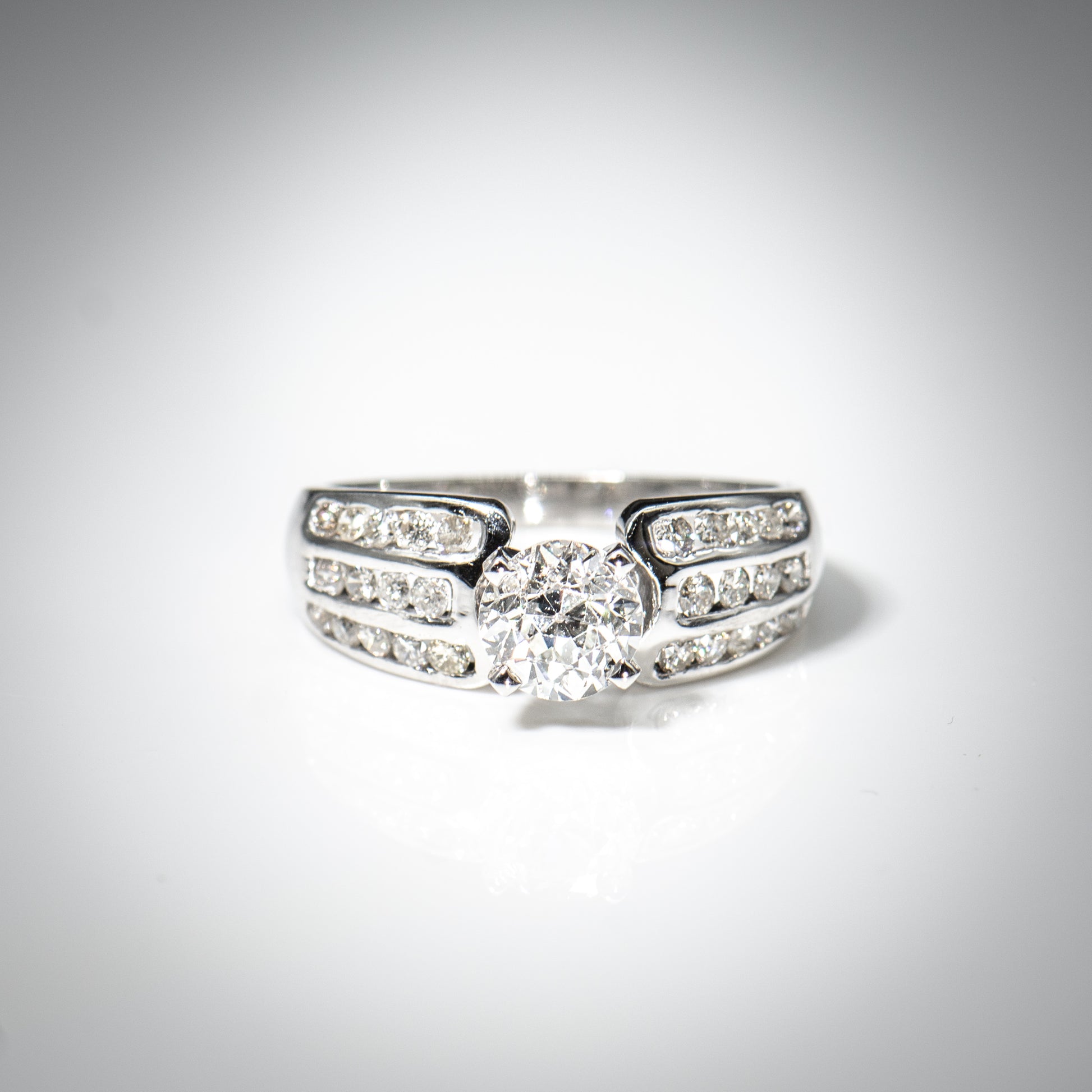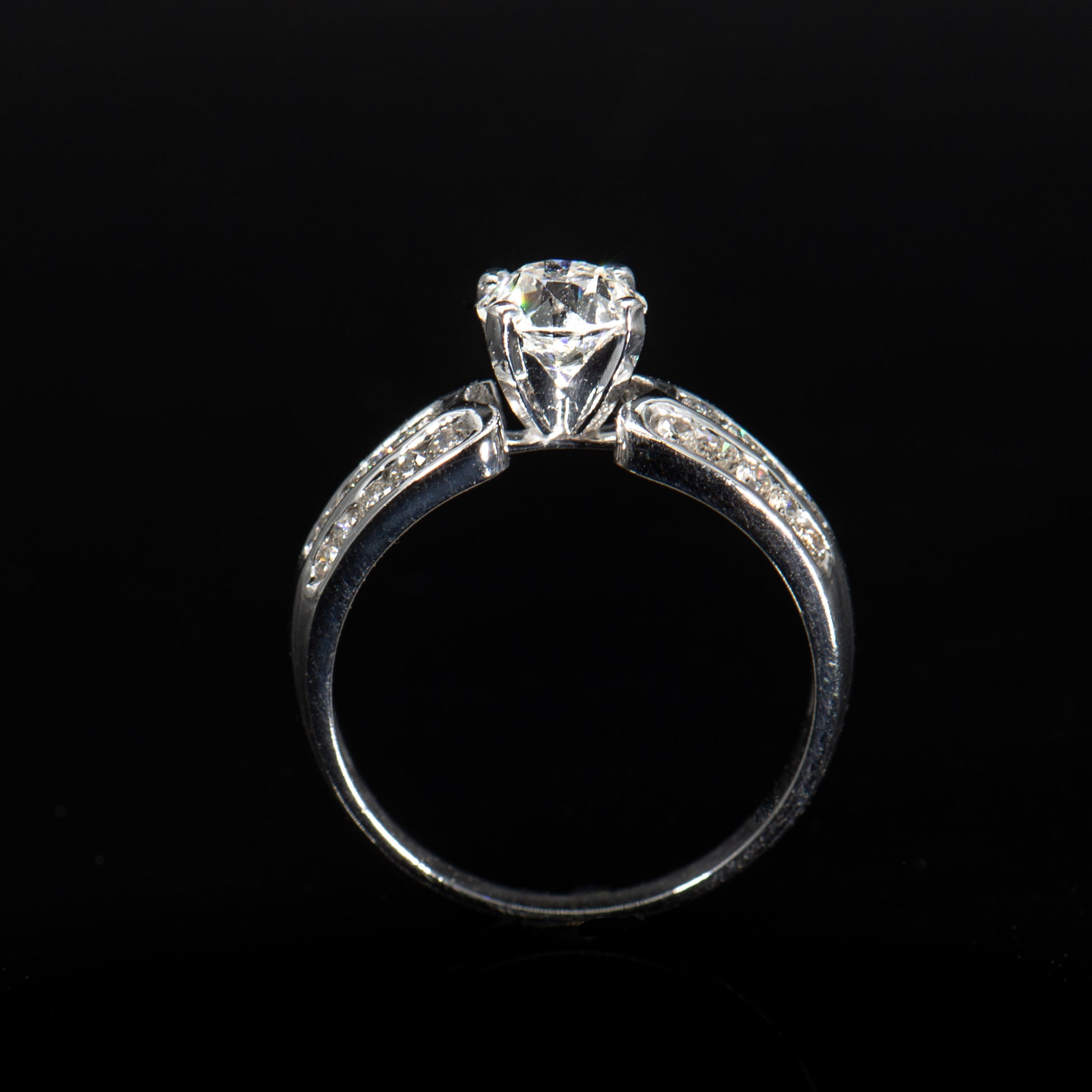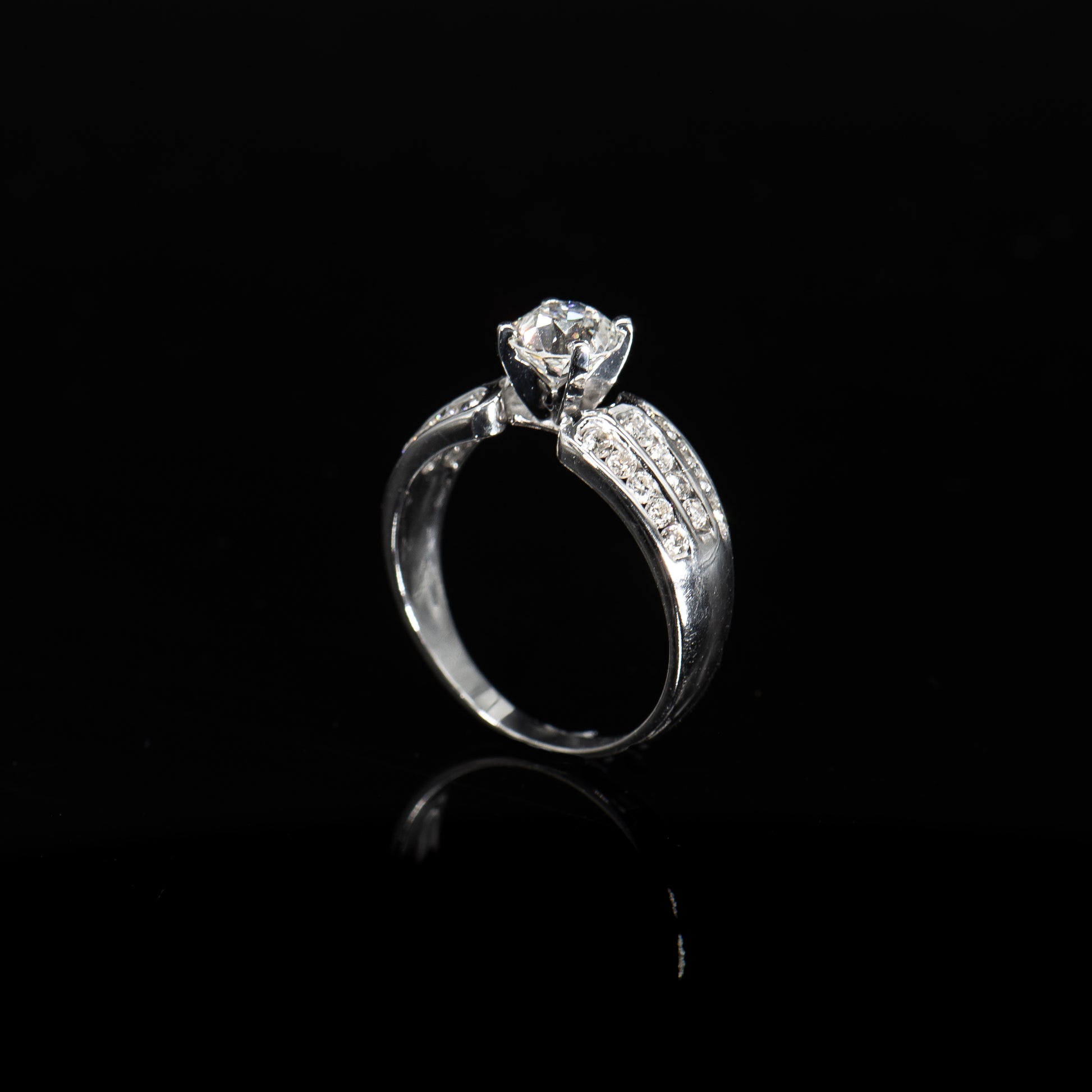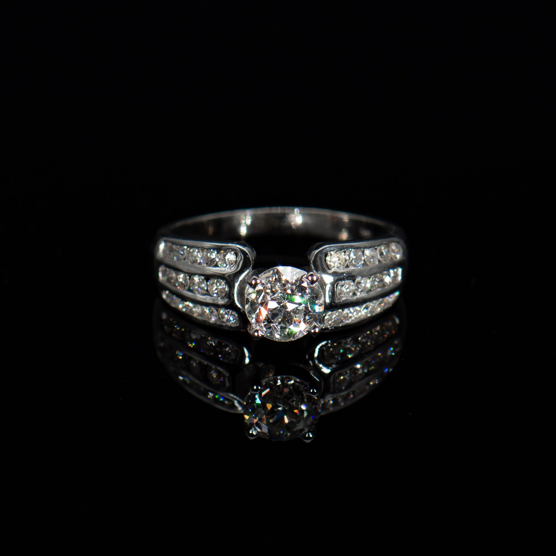 This beautiful engagement ring is designed with a centered Old European Brilliant Earth diamond weighing 1.05 carats. Three rows of channel set full-cut round white diamonds on the shoulders add dazzling sparkle.