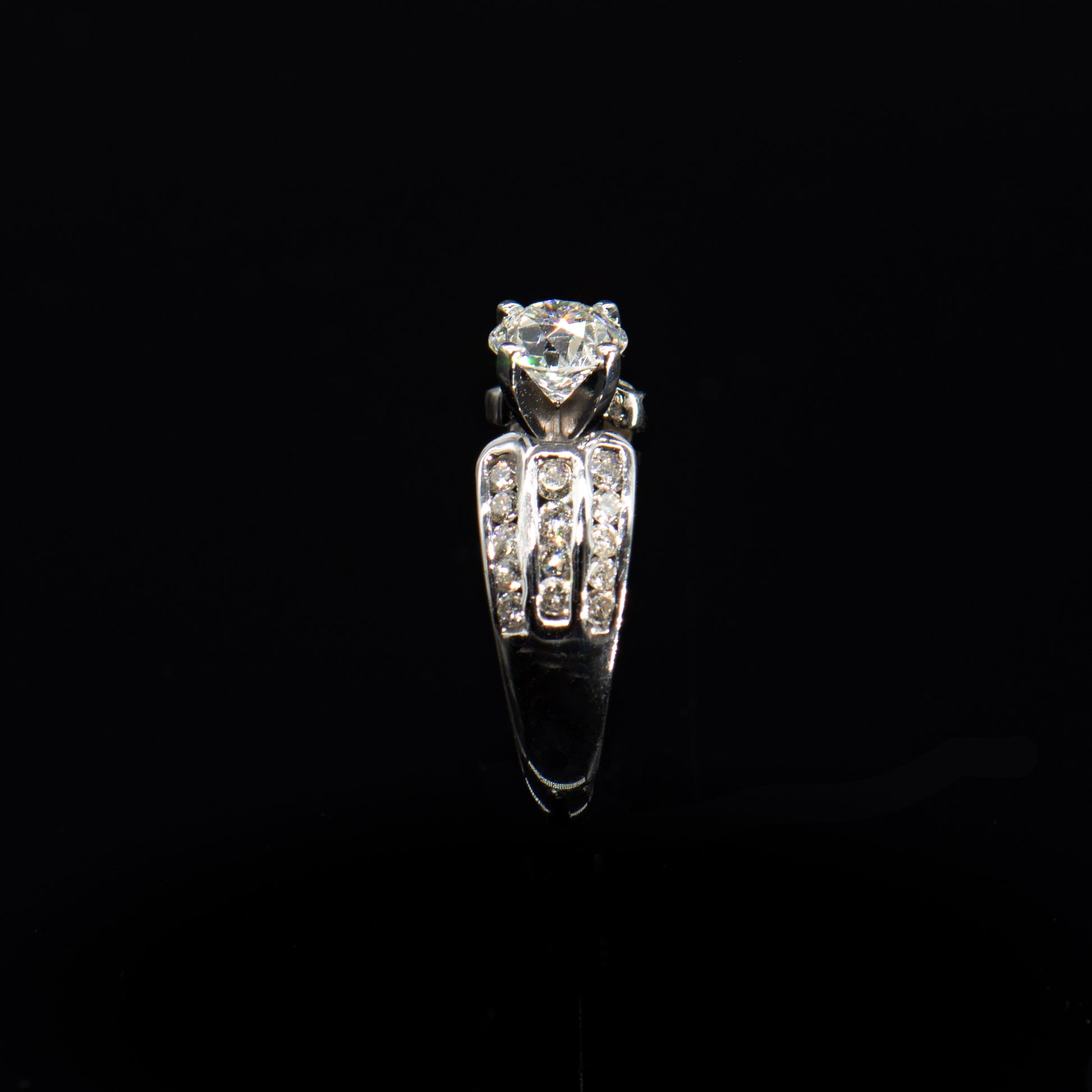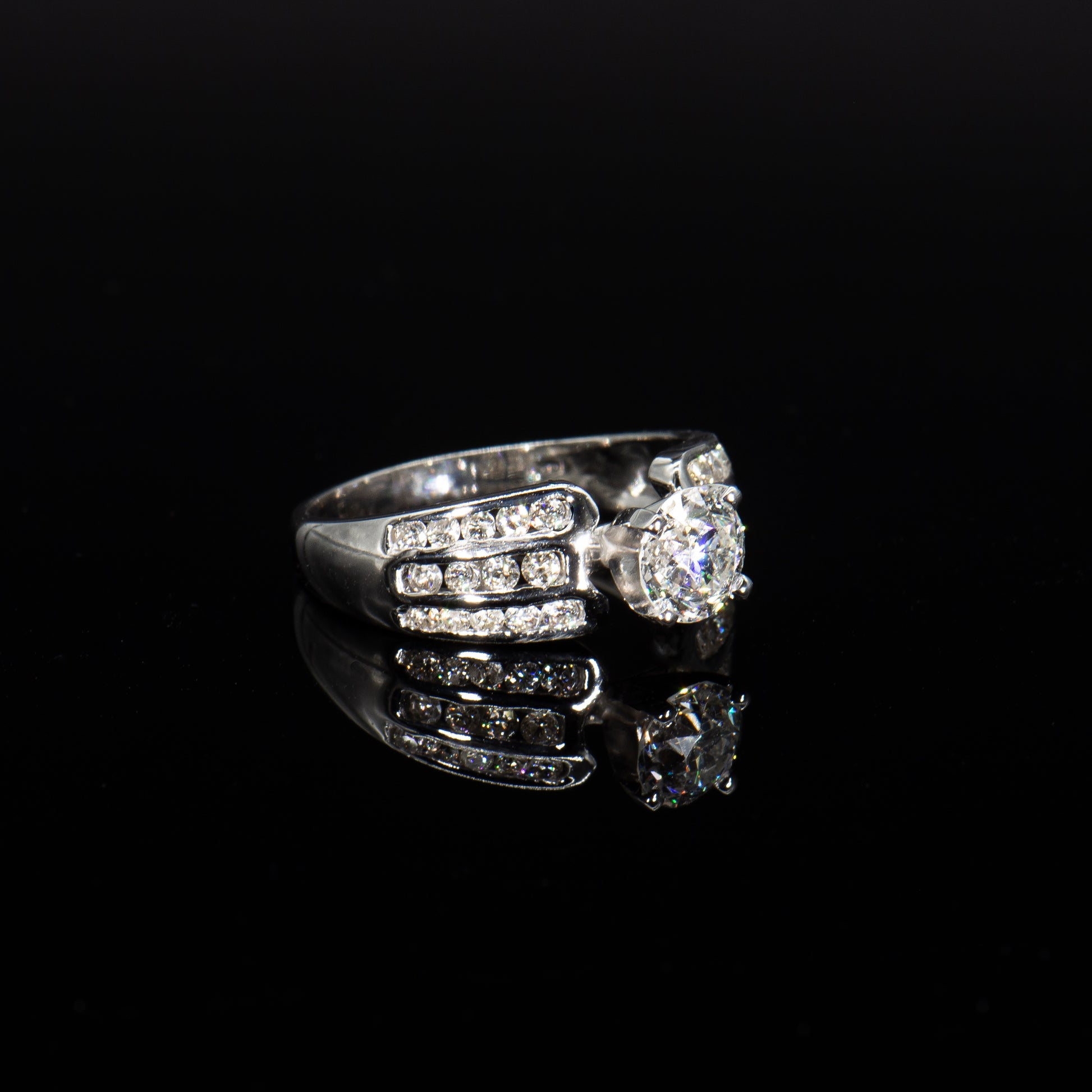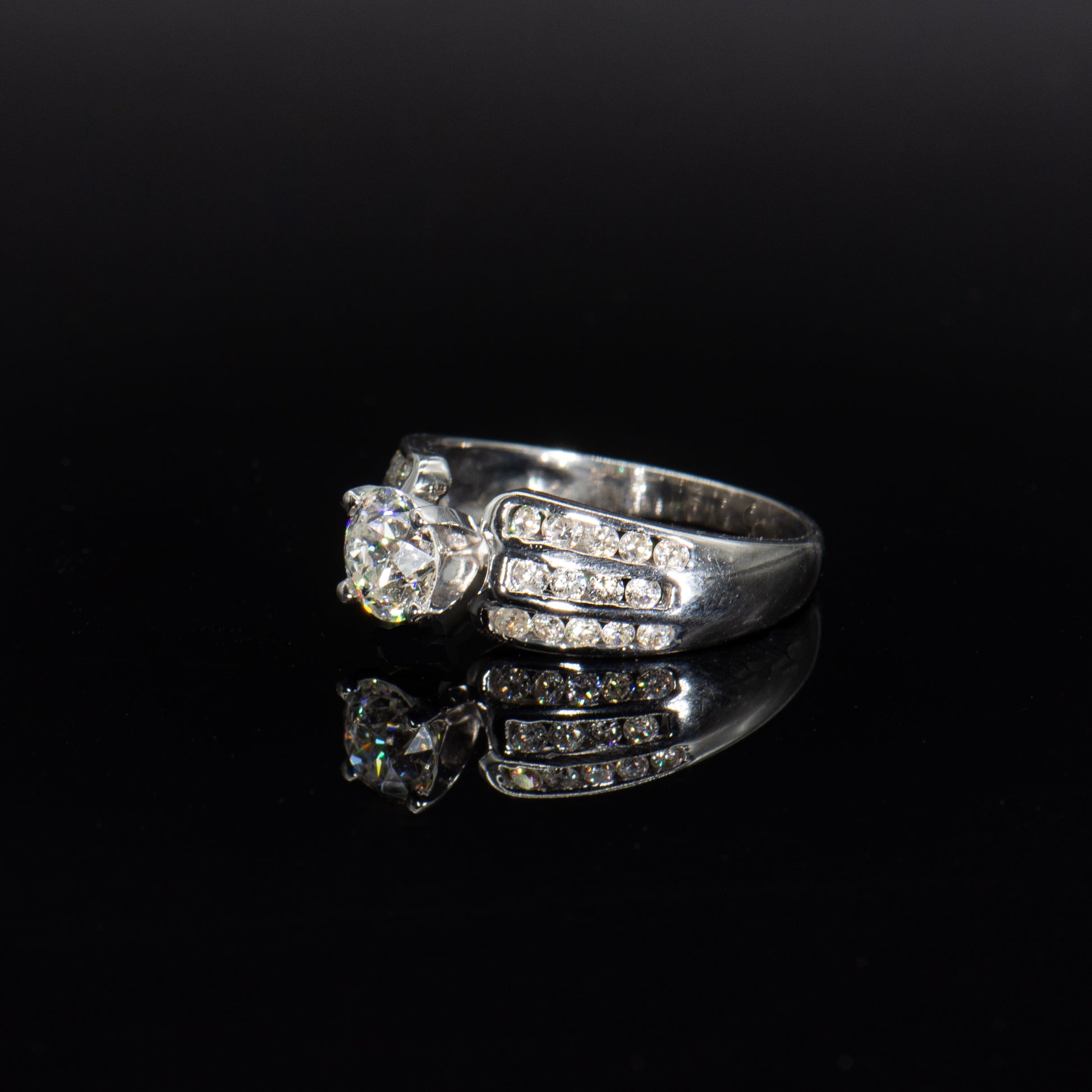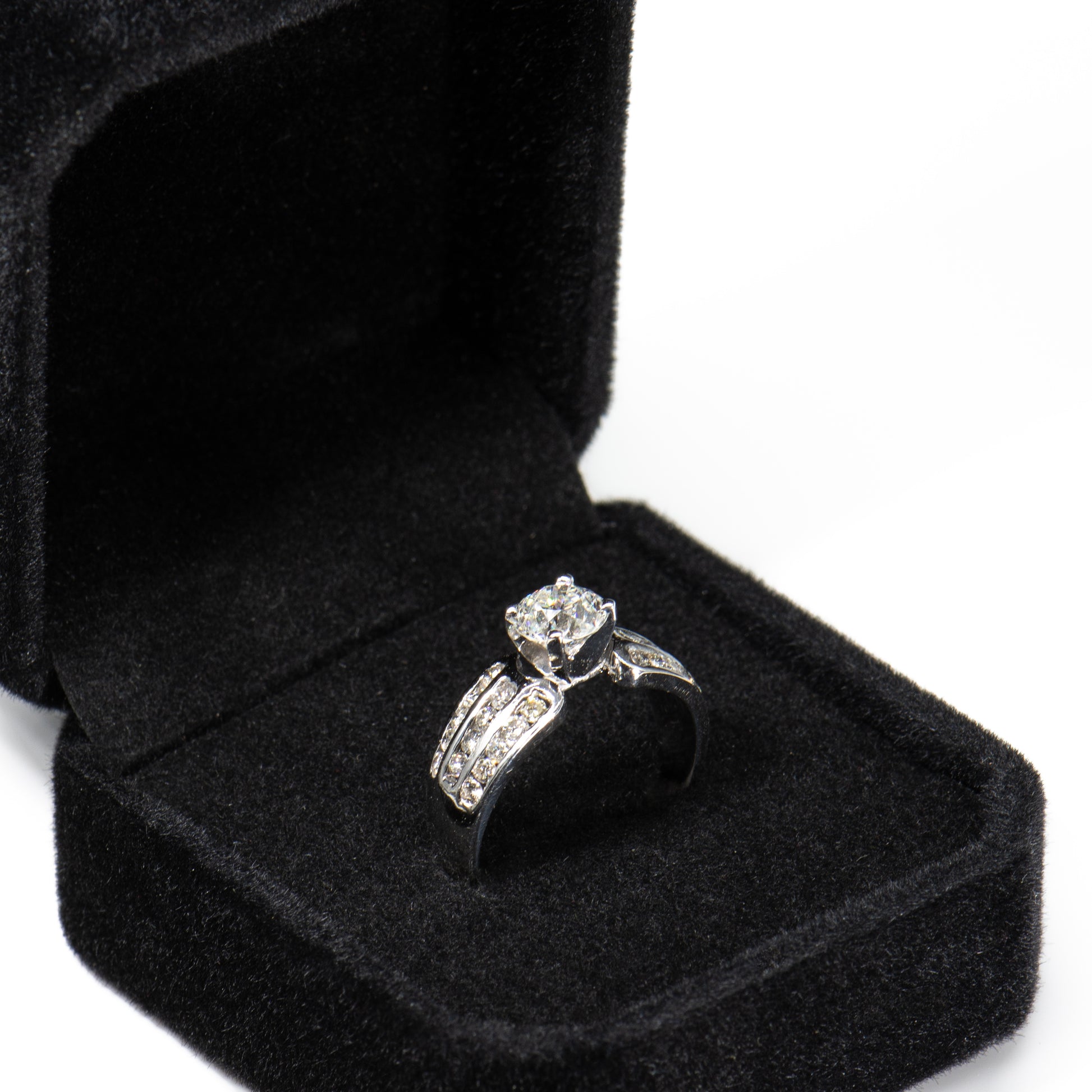 This beautiful engagement ring is designed with a centered Old European Brilliant Earth diamond weighing 1.05 carats. Three rows of channel set full-cut round white diamonds on the shoulders add dazzling sparkle.