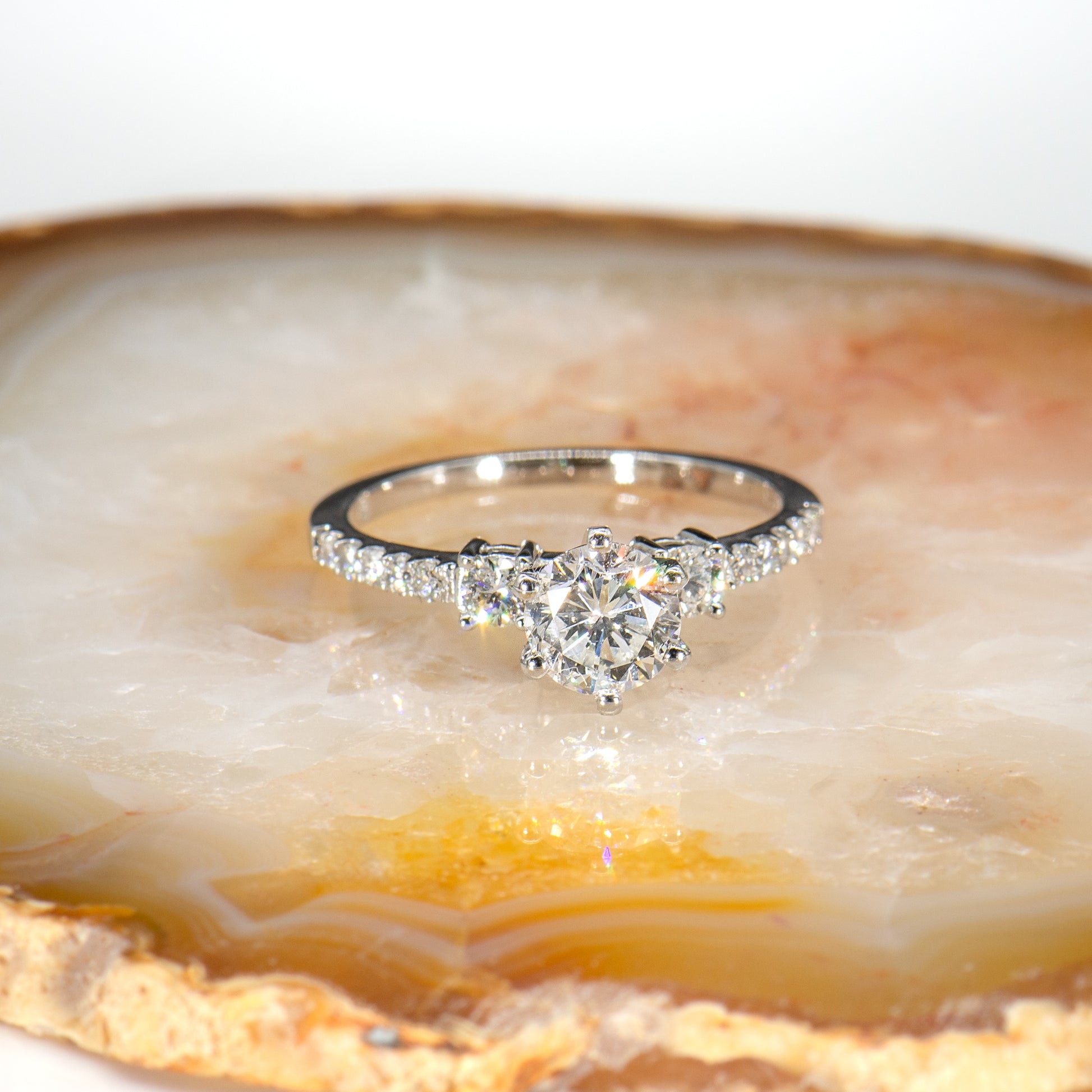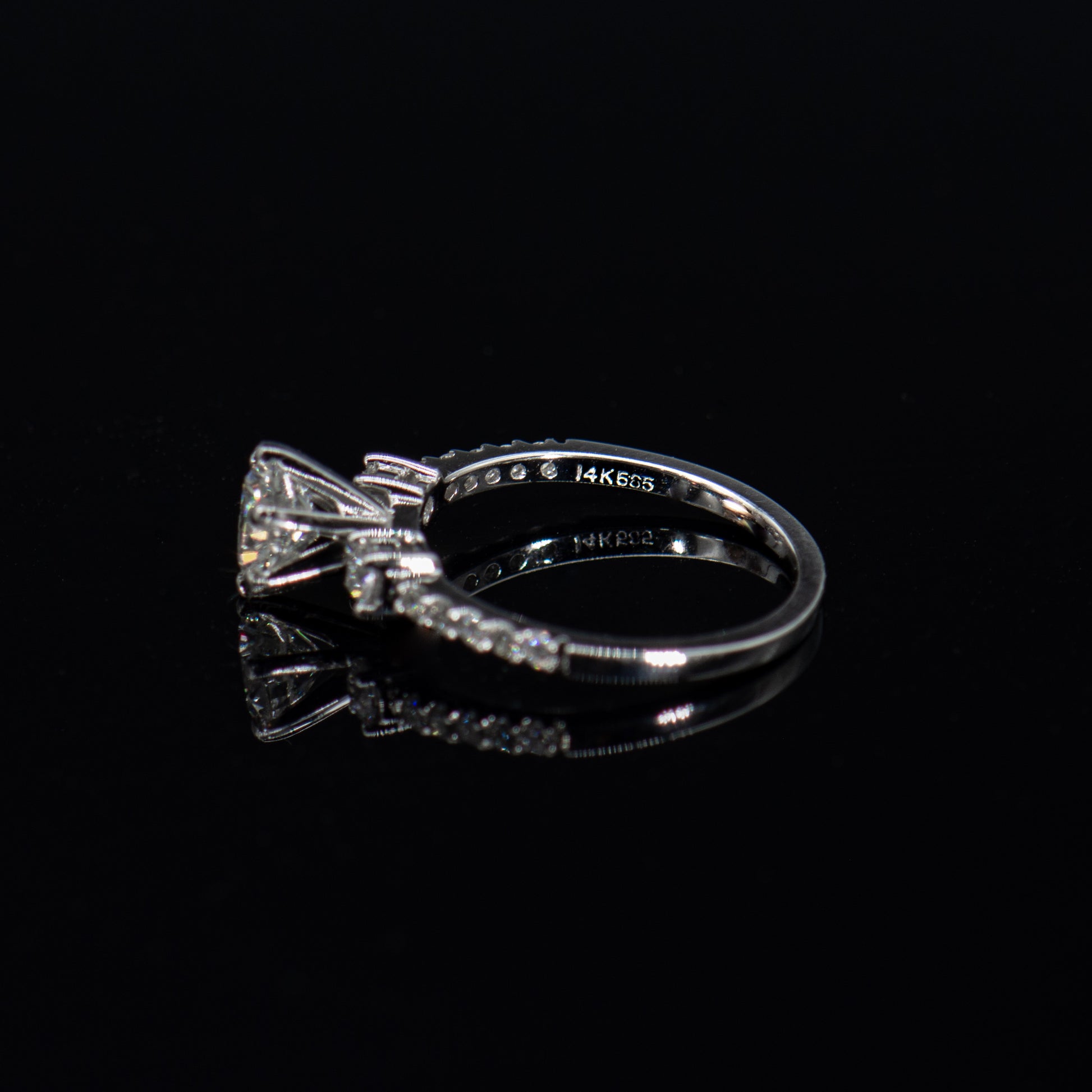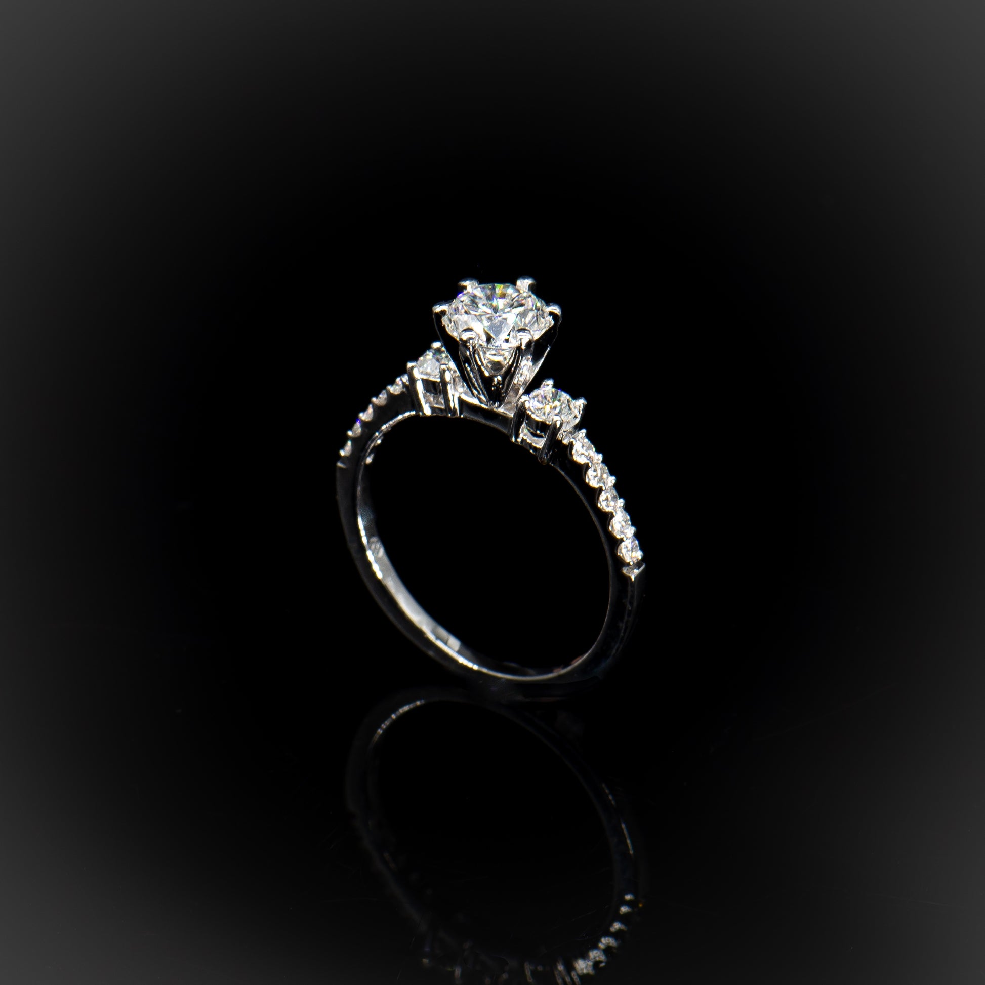 This exquisite diamond engagement ring strikes the perfect balance between romantic beauty and timeless elegance. The design features a centered round brilliant Earth mined natural diamond bordered by a shimmering array of full cut round diamonds on the shank, set in high polish 14 karat white gold.