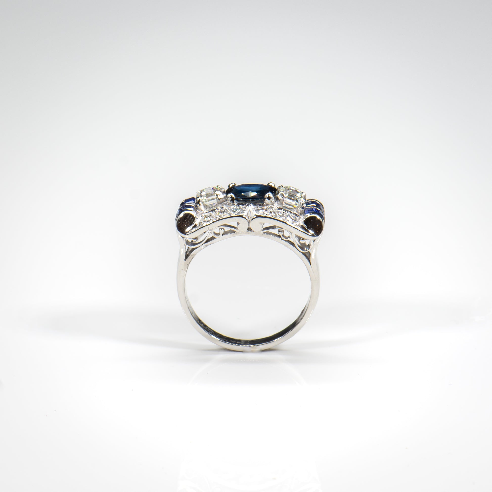 This exquisite ring is comprised of a centered Earth mined natural blue sapphire, weighing approximately .60 carat surrounded by rows of sparkling Asscher, round and calibre cut white diamonds, set in platinum.