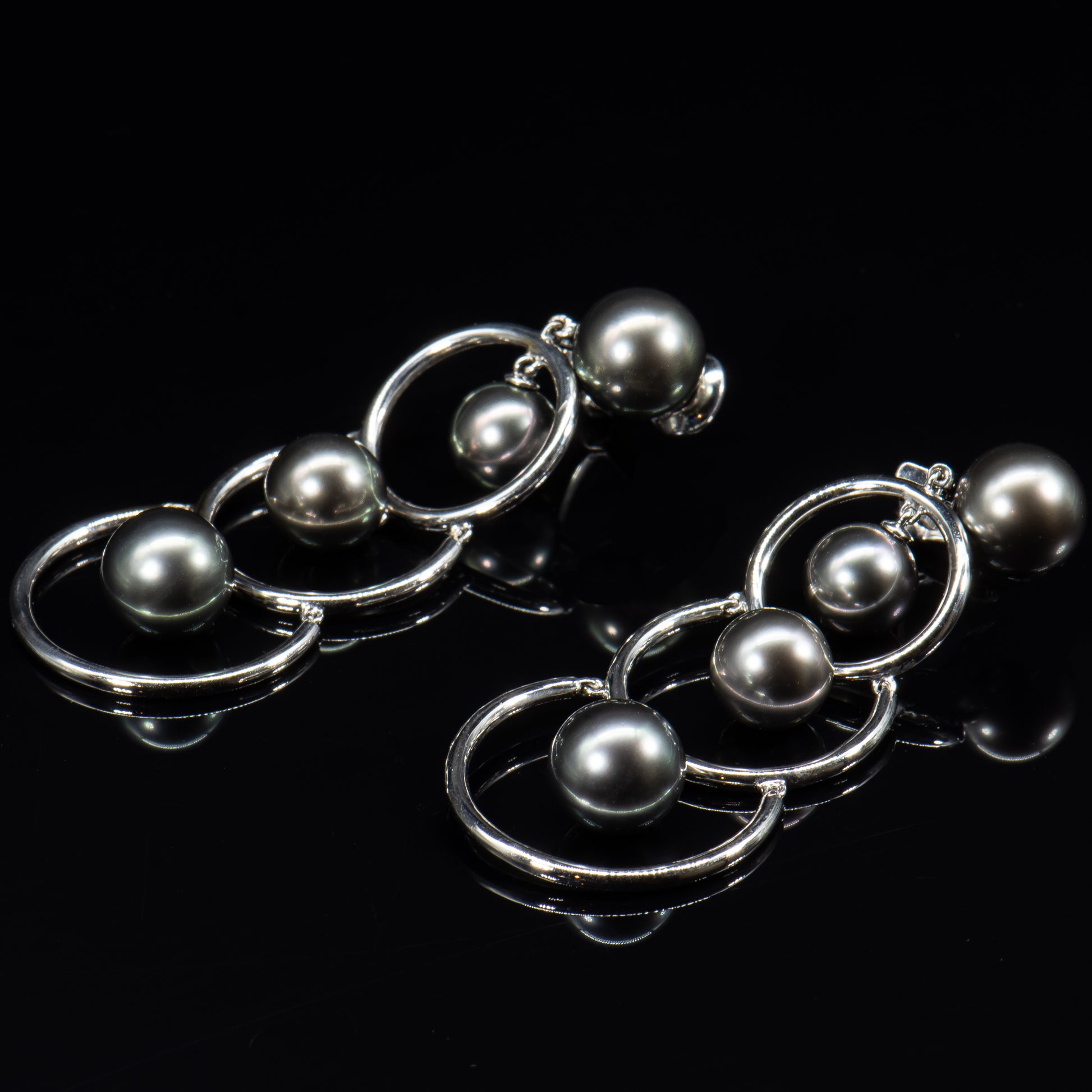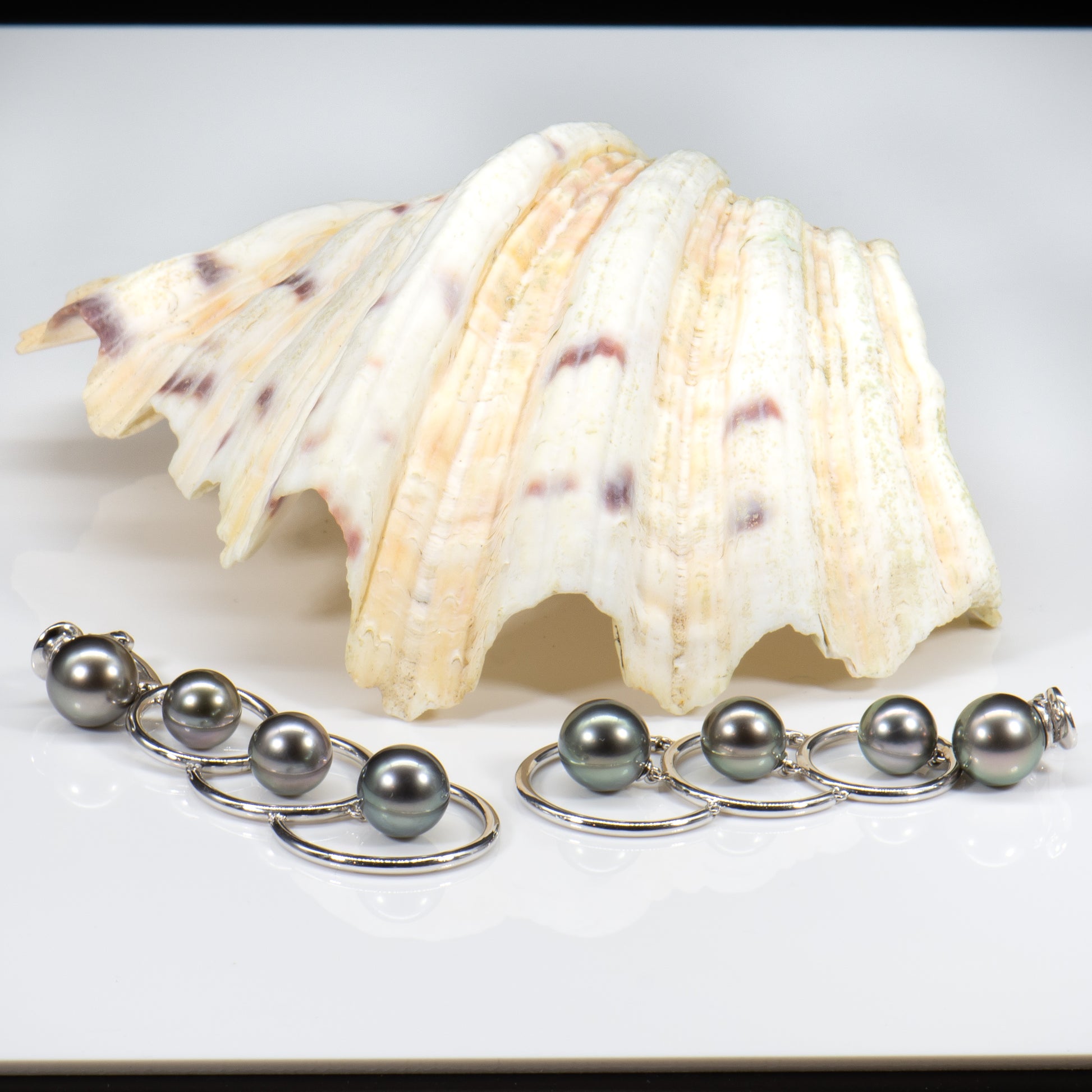 These exquisite earrings feature lustrous silver gray Tahitian pearls in sleek 18k white gold graduated hoops. This sophisticated classic features pearls that range in size from 8.5 to 10.0 mm. Each pearl is gracefully centered in one of three gleaming white gold hoops. Perfect to wear day to evening and for every occasion, these cool and sexy pearl earrings are the hottest look this season and are a great addition to your jewelry collection.