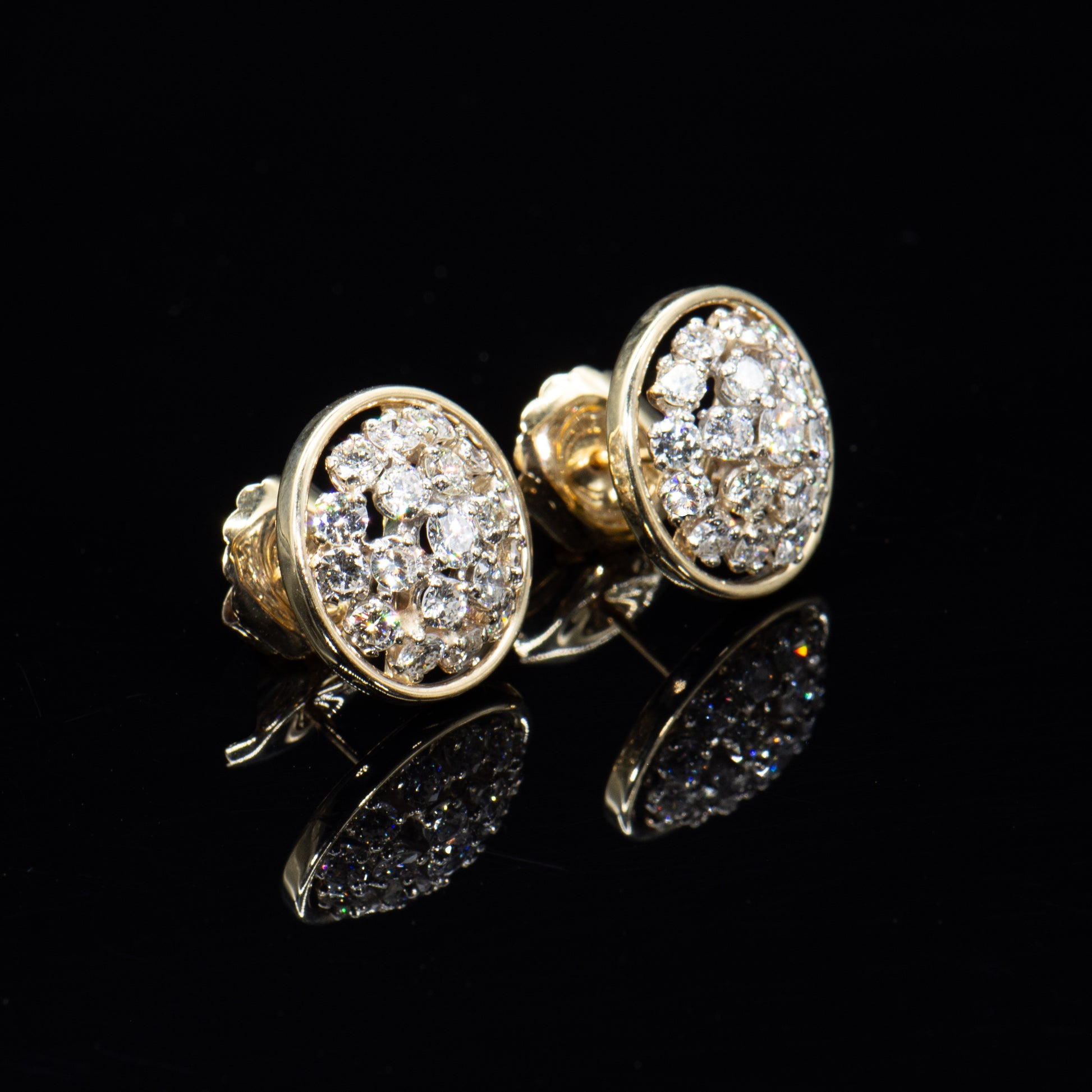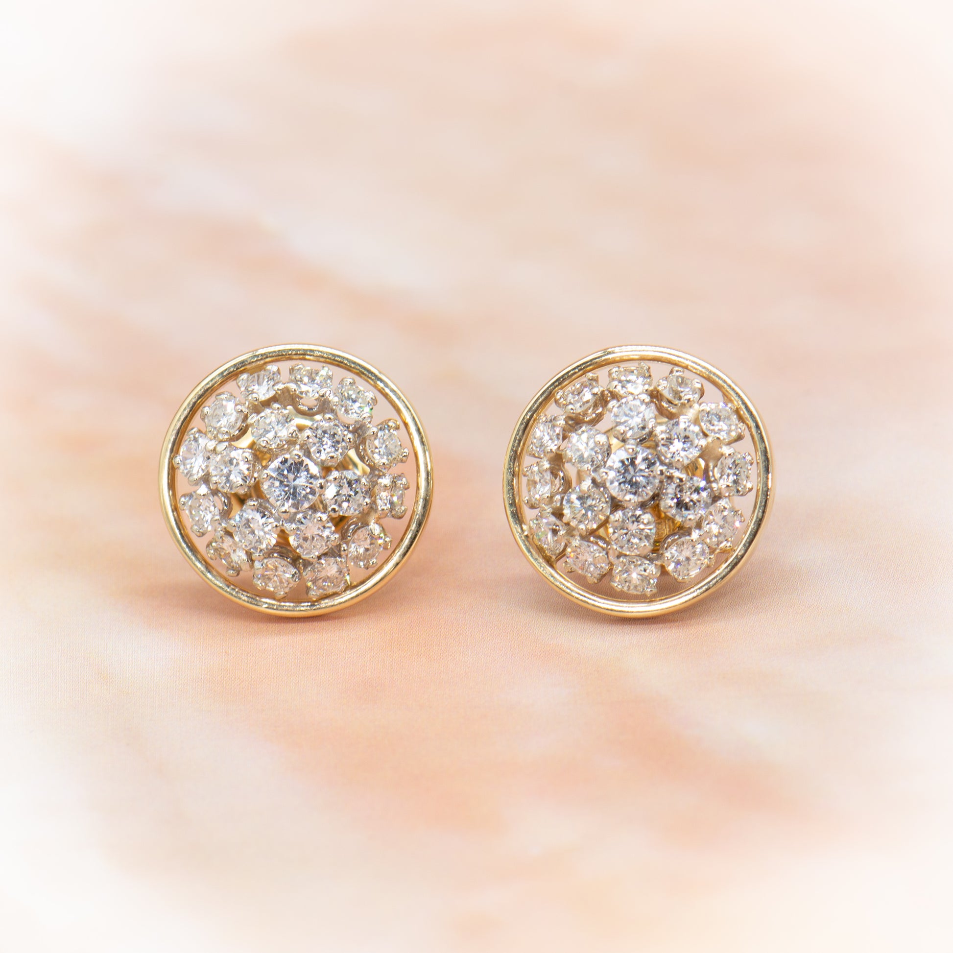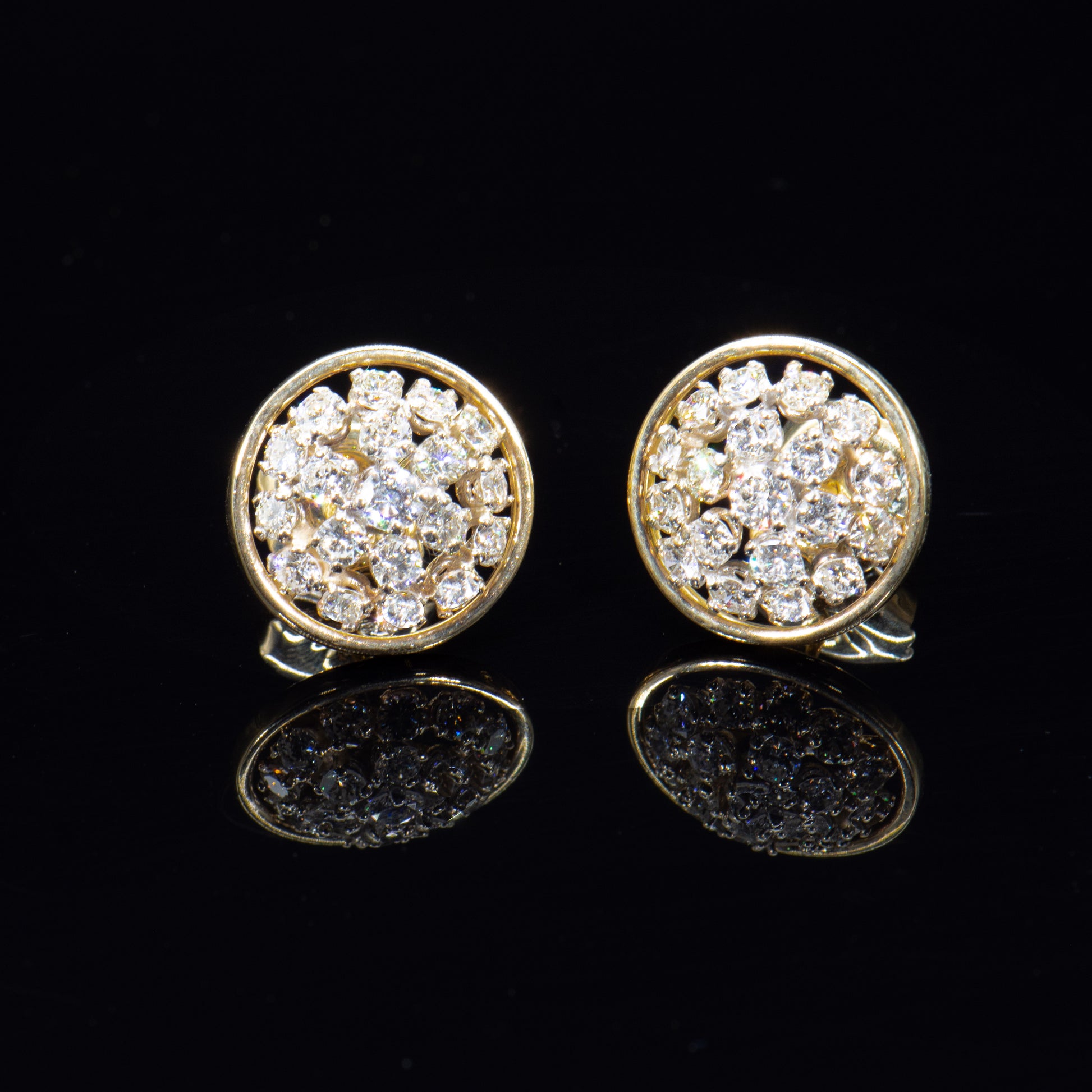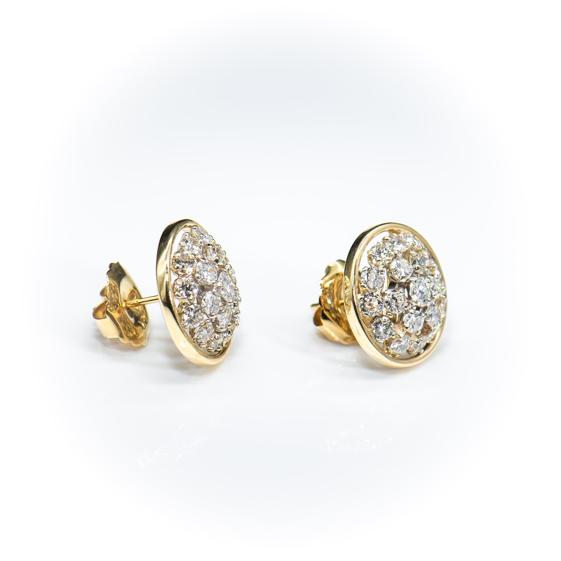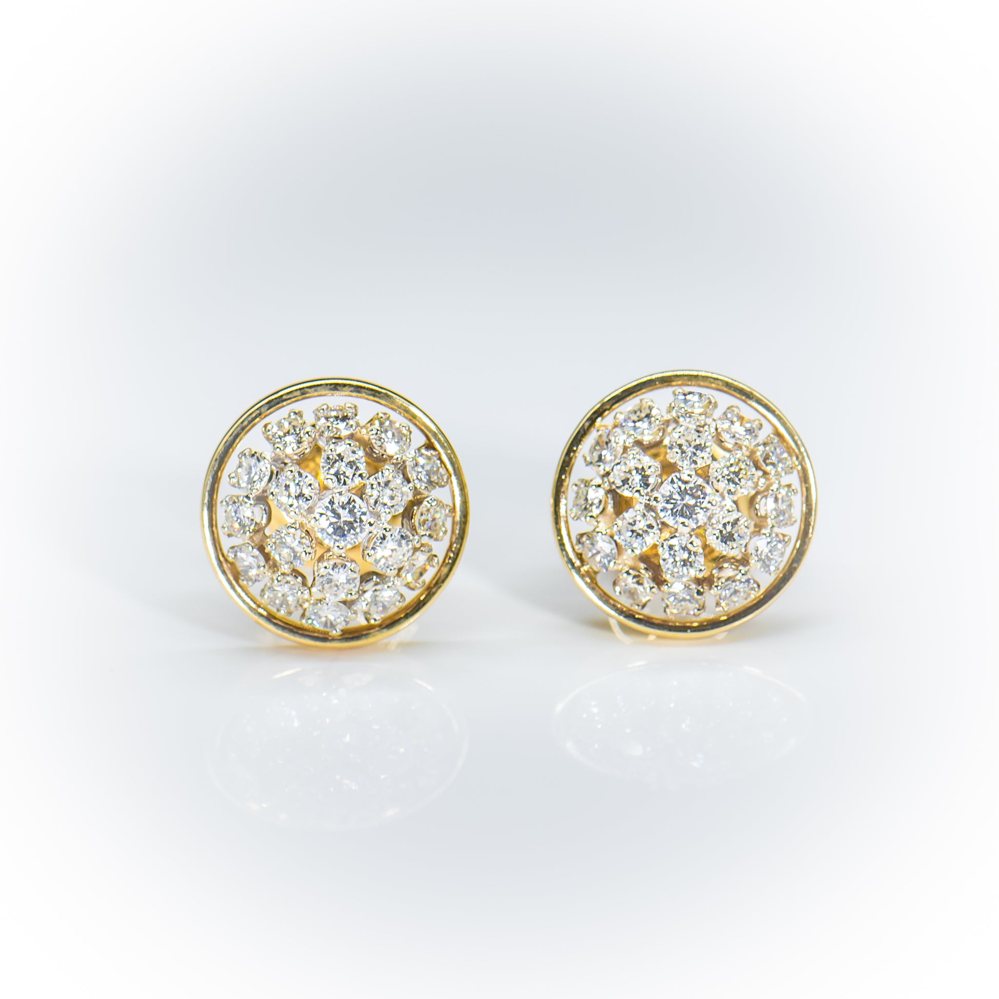 We fell in love with these amazing earrings the moment we saw their sparkling style. Full cut round Earth mined natural white diamonds, totaling approximately 2.00 carats, glitter in a mesmerizing cluster within a simple circle of high polish yellow gold.