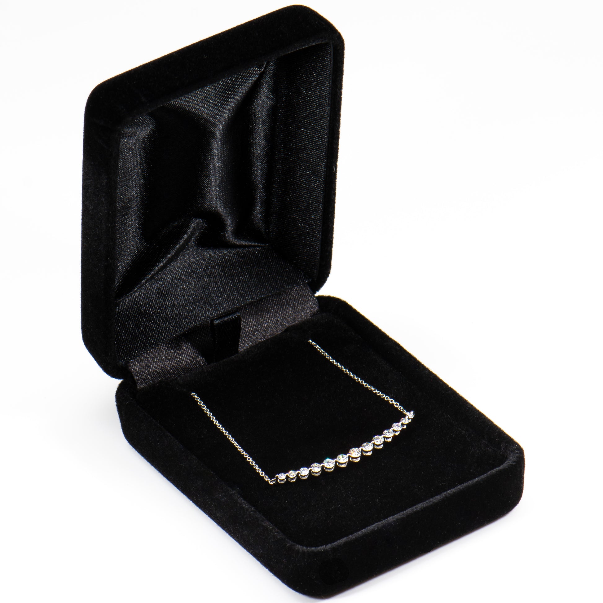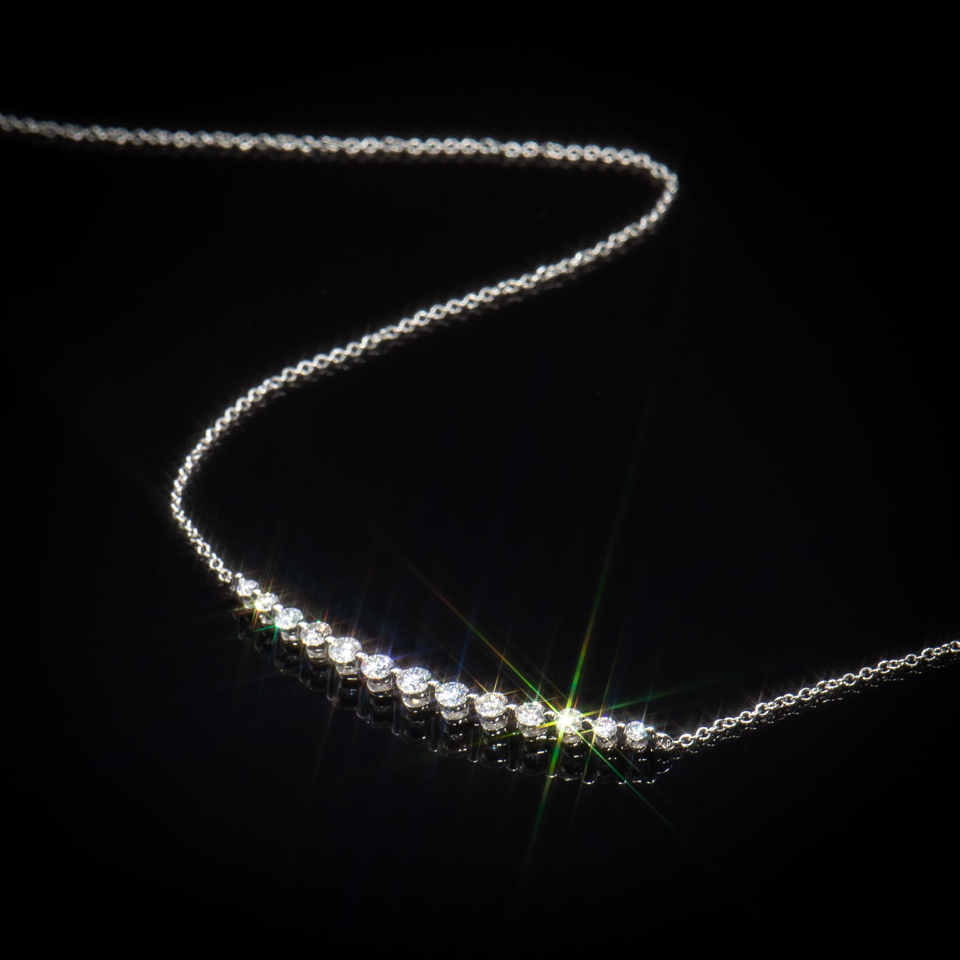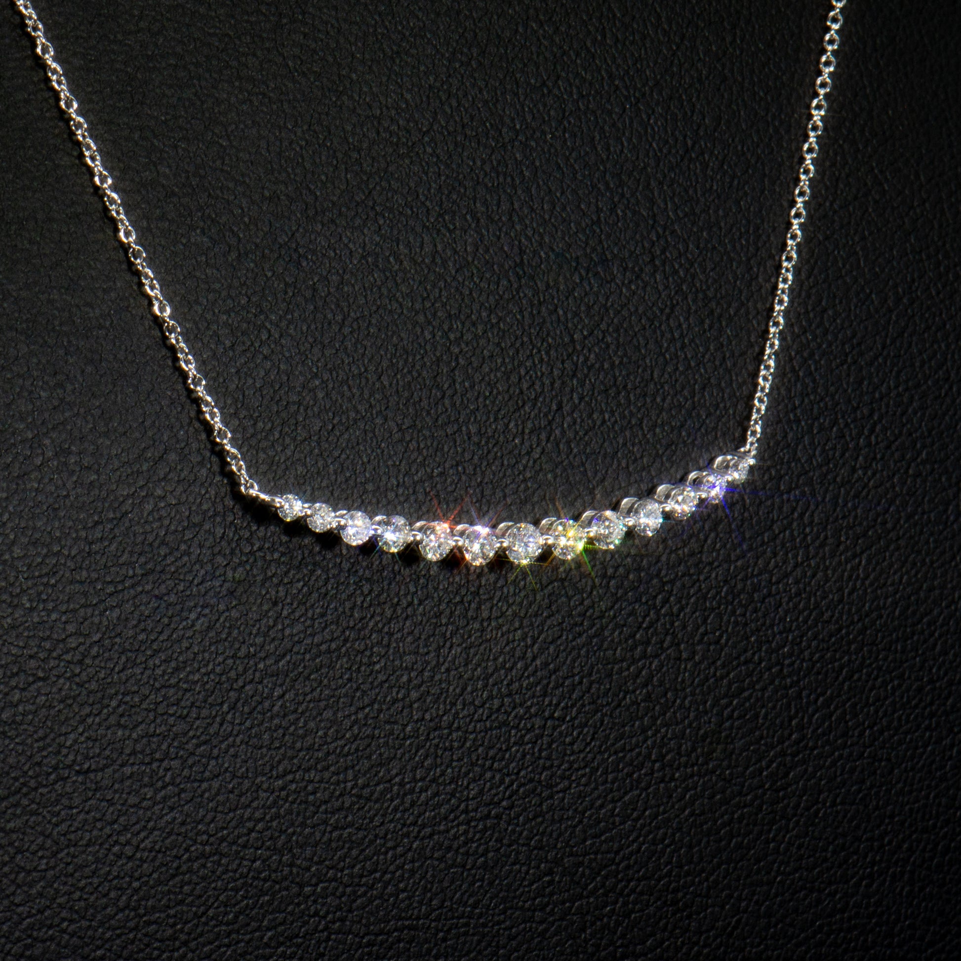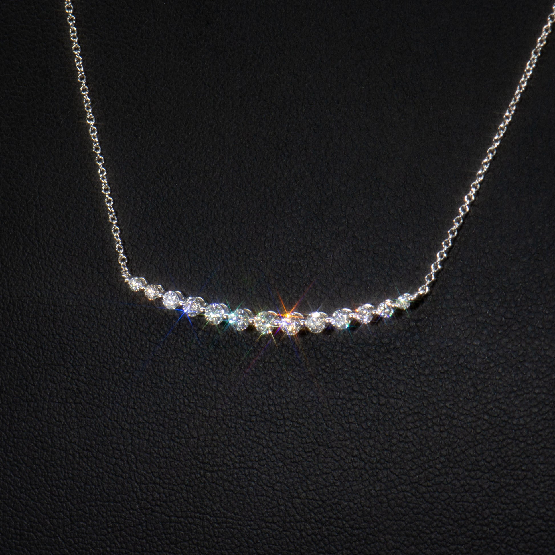 This striking necklace sparkles with approximately 1.00 carat of full-cut round, Earth mined natural Diamonds in a sophisticated curved style set in 18 karat white gold.