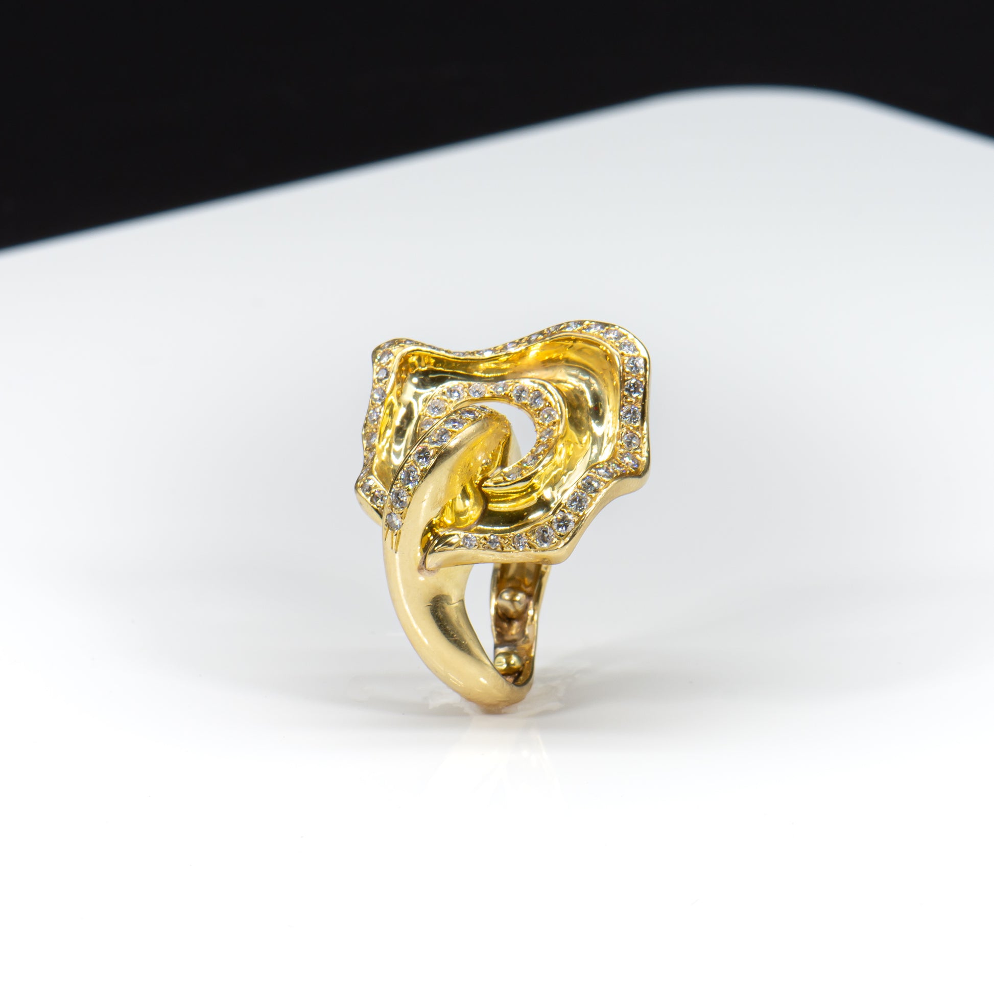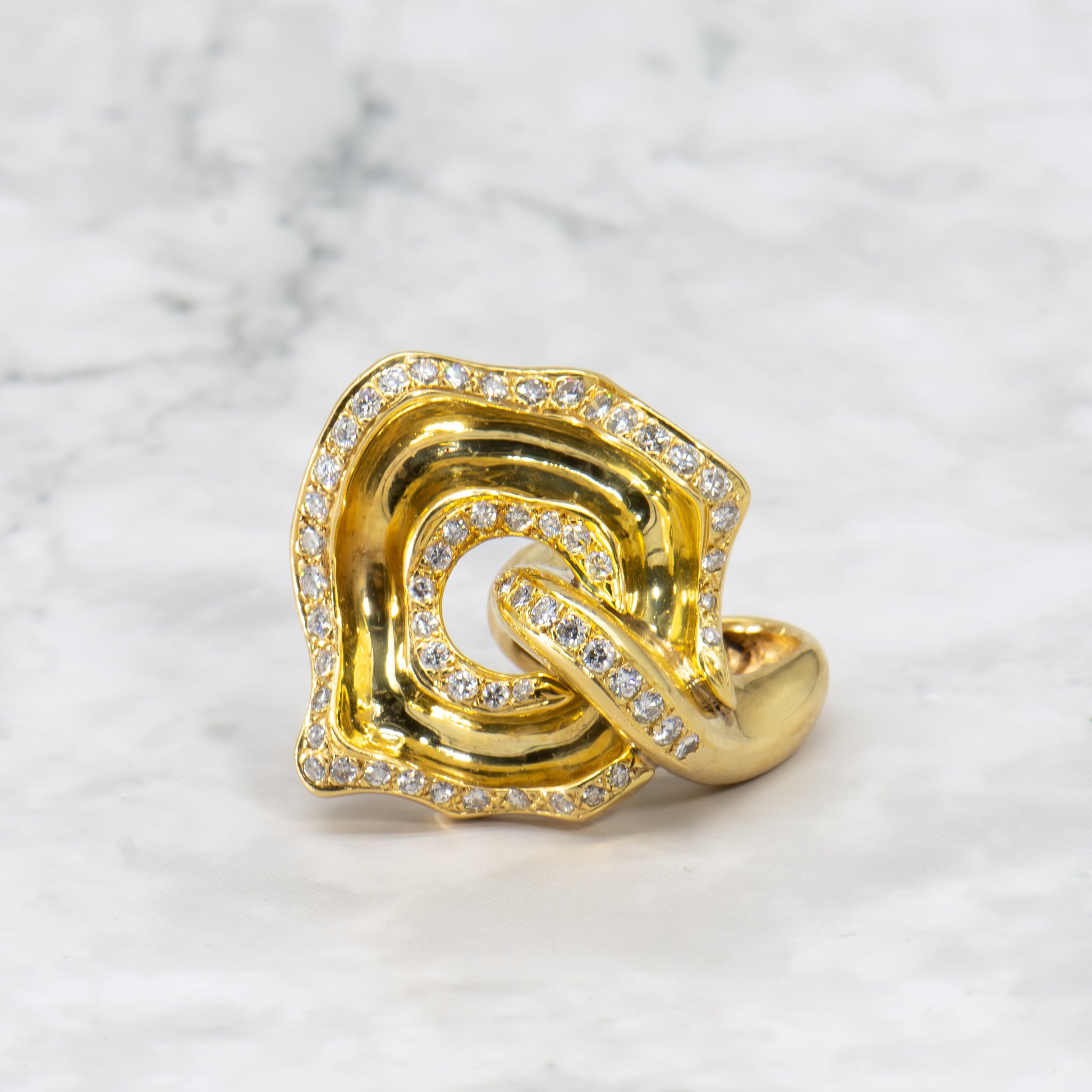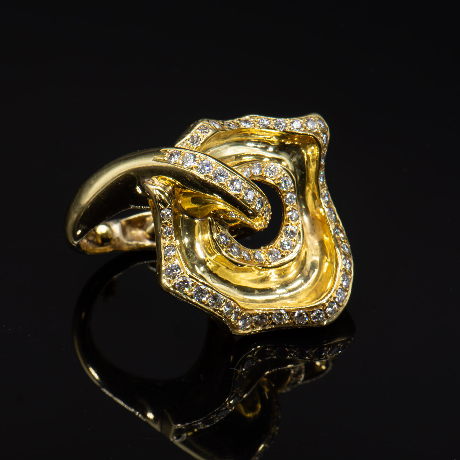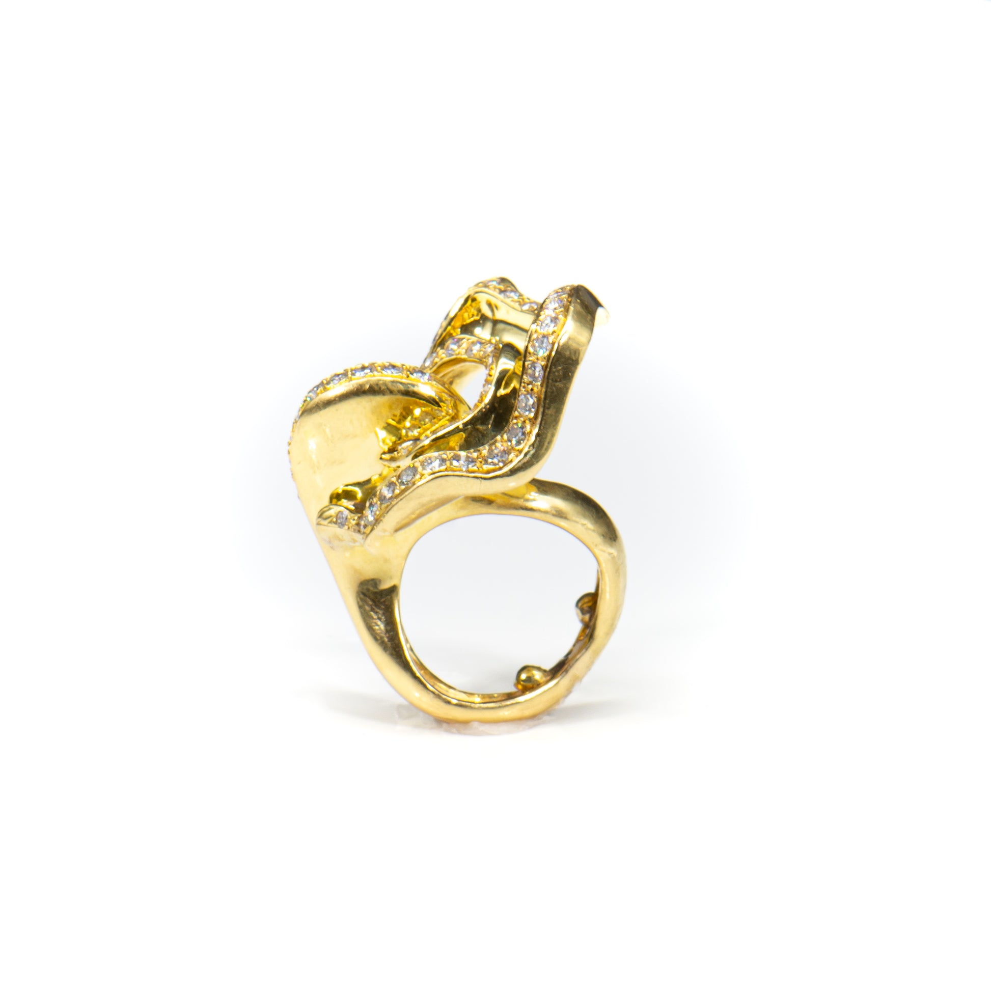 Wearable art. This one of a kind ring is the fantastic result of a truly gifted jewel smith and visionary designer. Handcrafted of high purity 18k solid gold and Earth mined colorless white diamonds this stunning ring appears to undulate in graceful curvilinear motion.