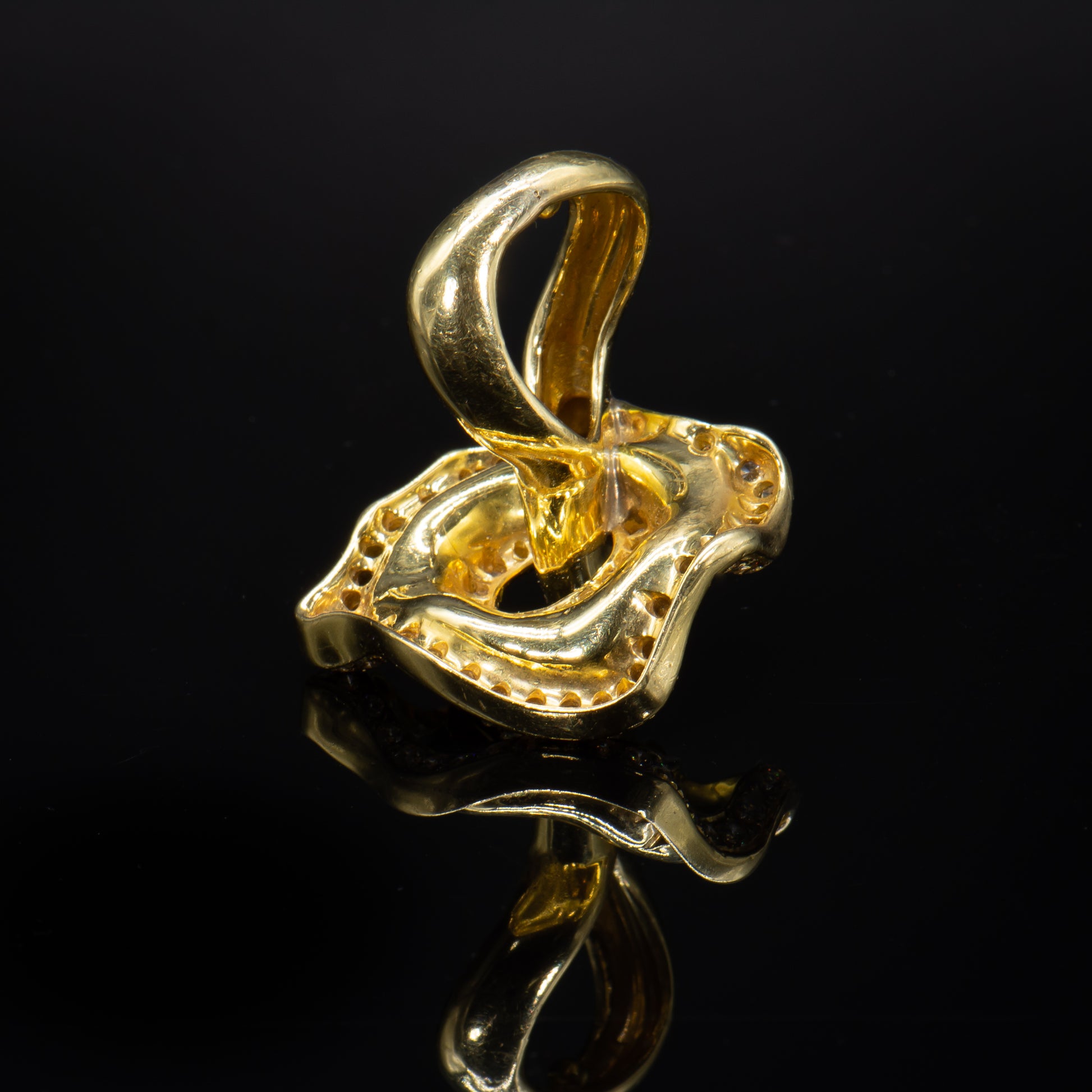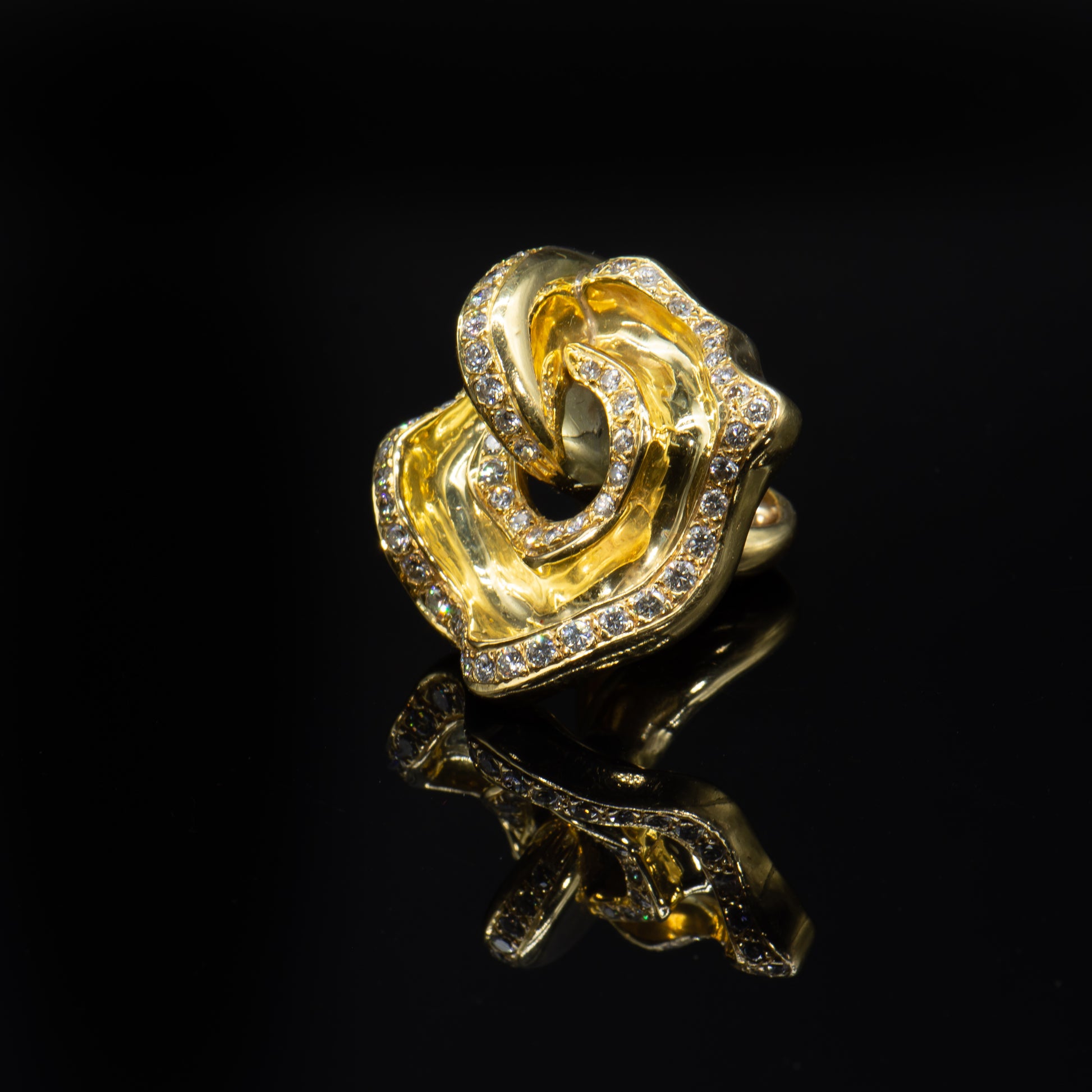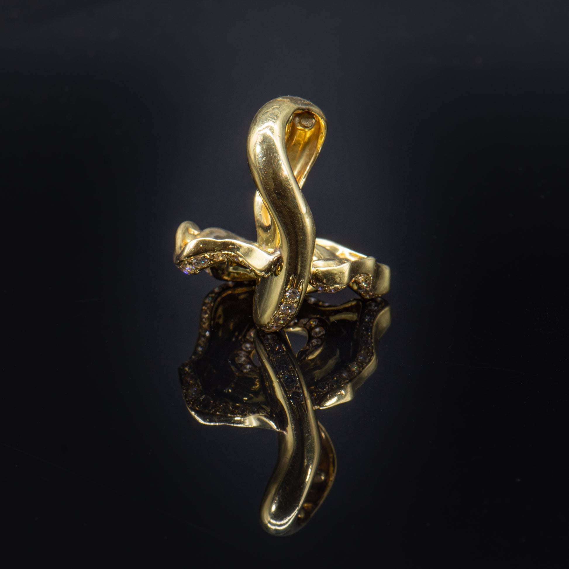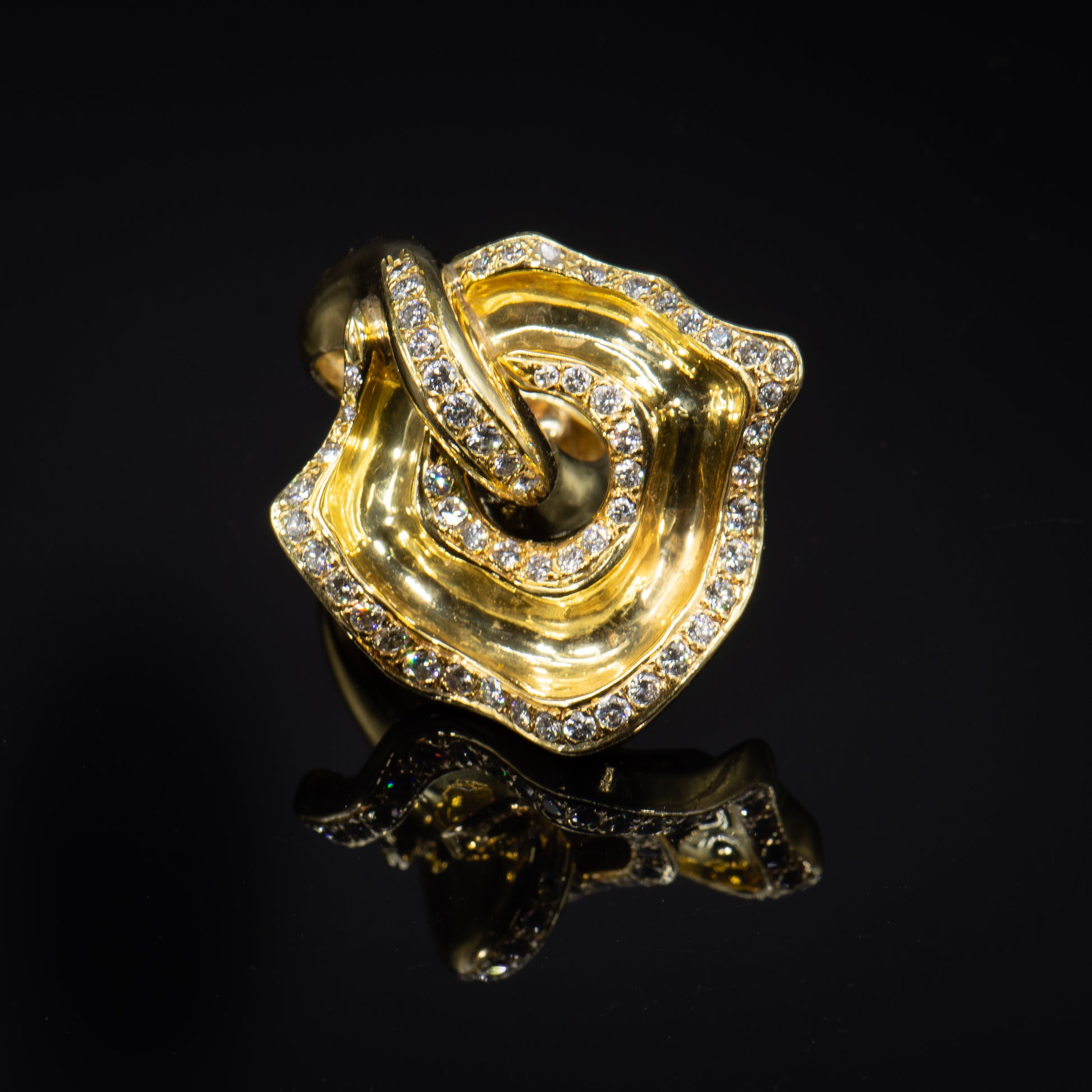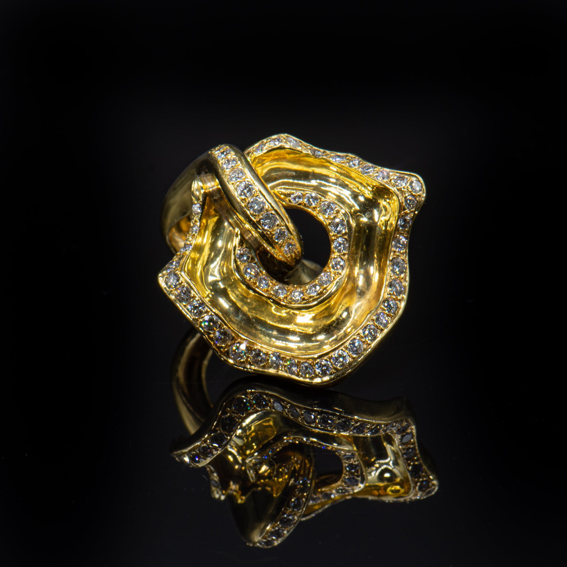 Wearable art. This one of a kind ring is the fantastic result of a truly gifted jewel smith and visionary designer. Handcrafted of high purity 18k solid gold and Earth mined colorless white diamonds this stunning ring appears to undulate in graceful curvilinear motion.