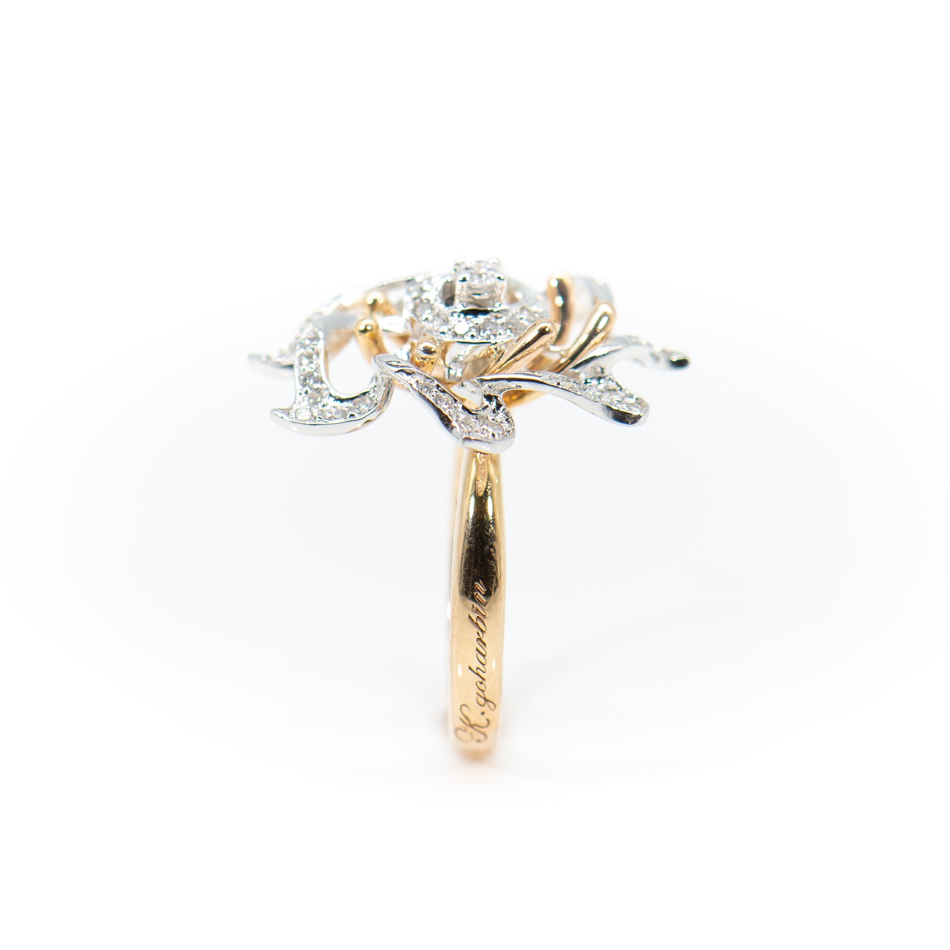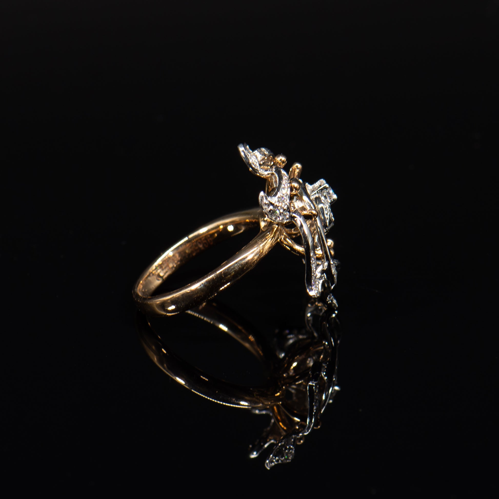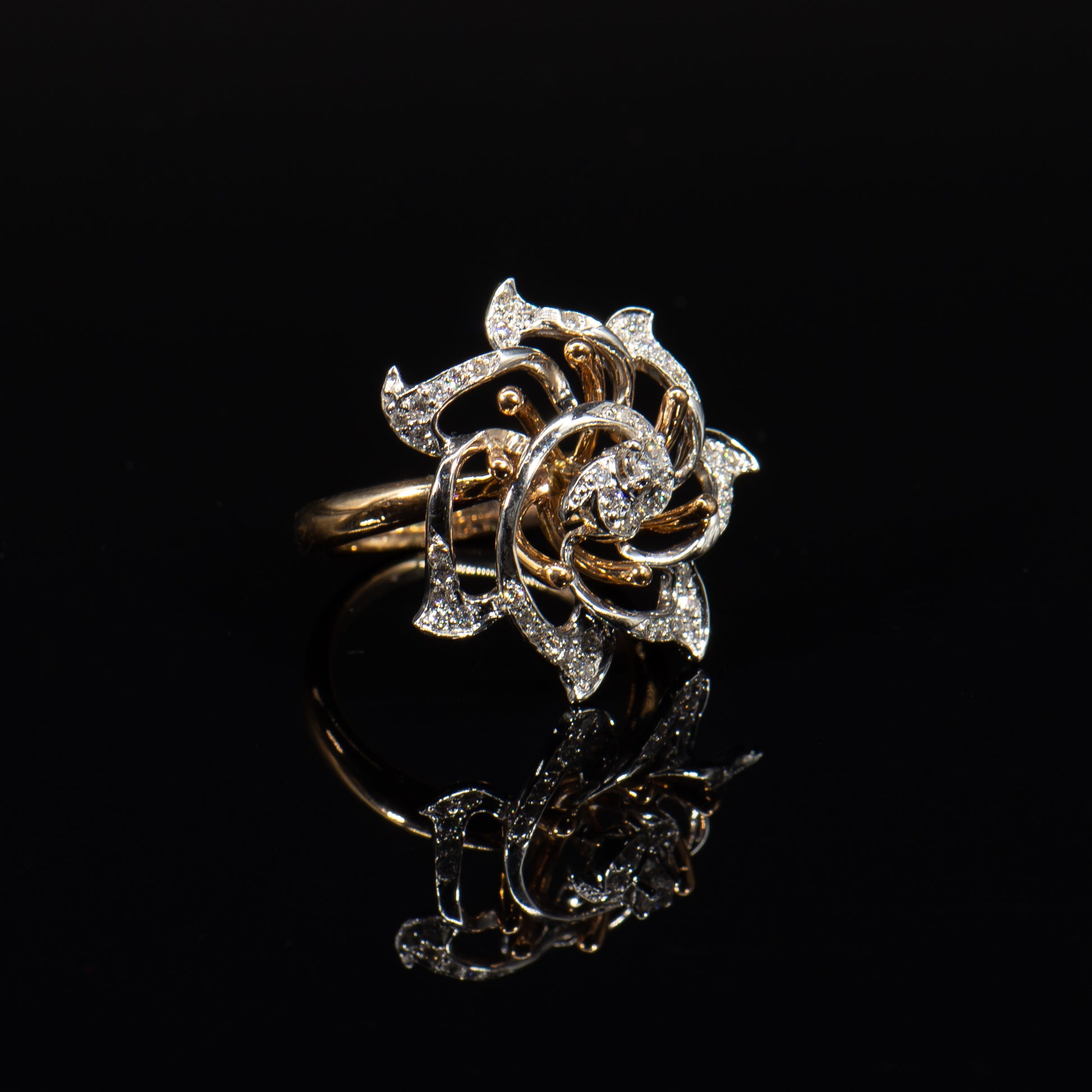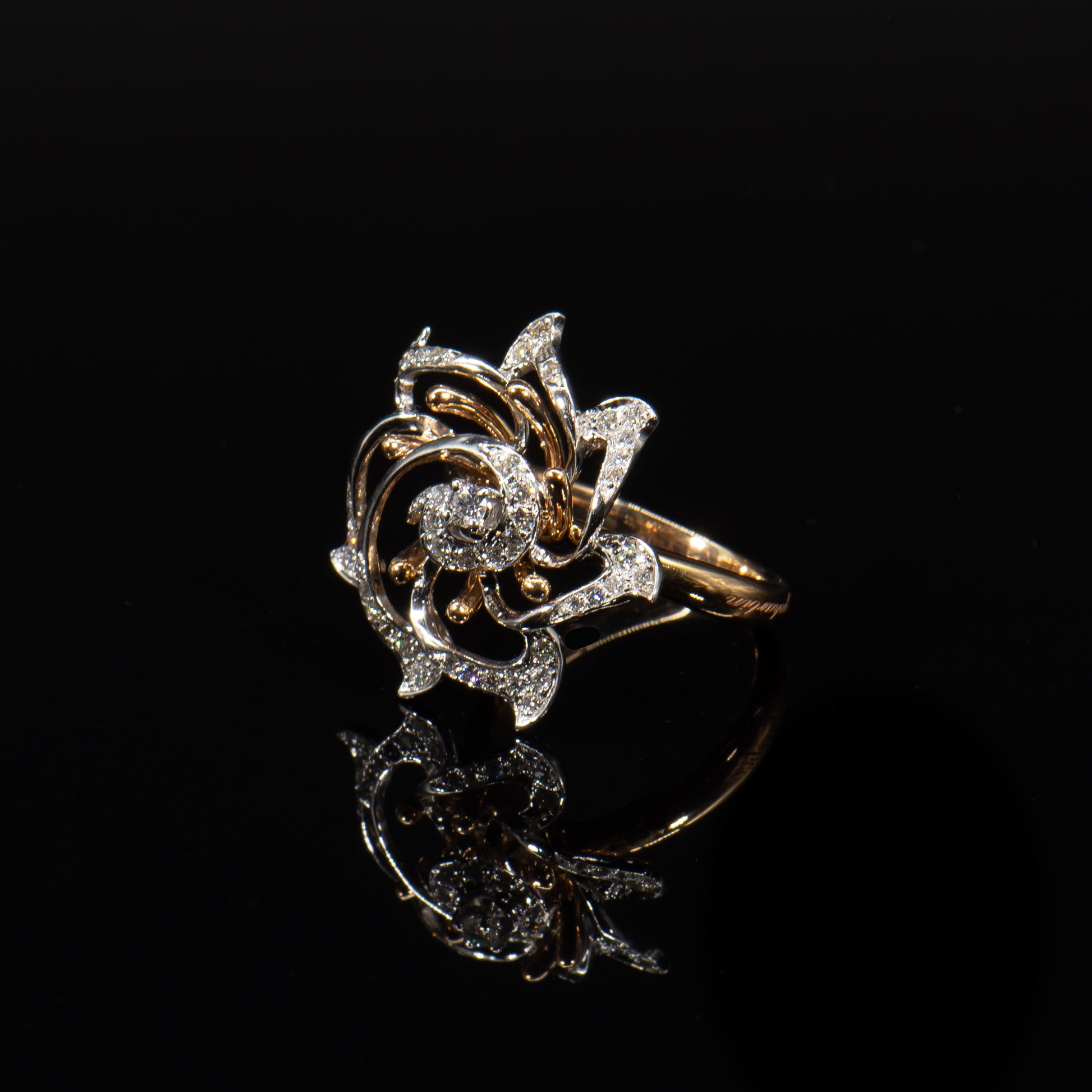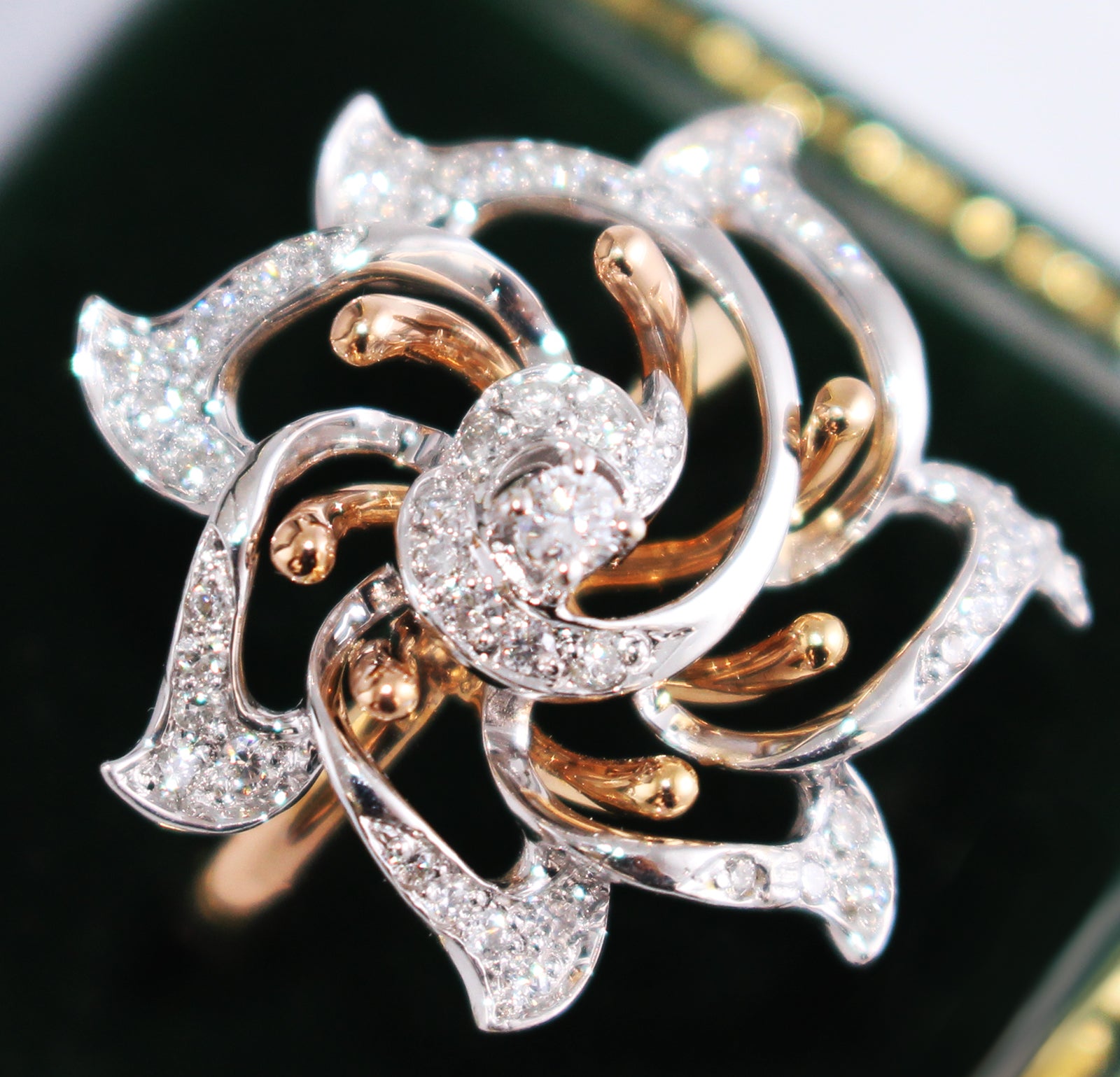 The stars in her eyes are equaled only by the beauty of these sparkling white natural diamonds. This exquisite ring is comprised of graceful swirls of rose and white gold surmounted with an array of dazzling full cut, individually set diamonds. Light up the night when you wear this phenomenal and very special one of a kind ring. The perfect gift for any jewelry lover.