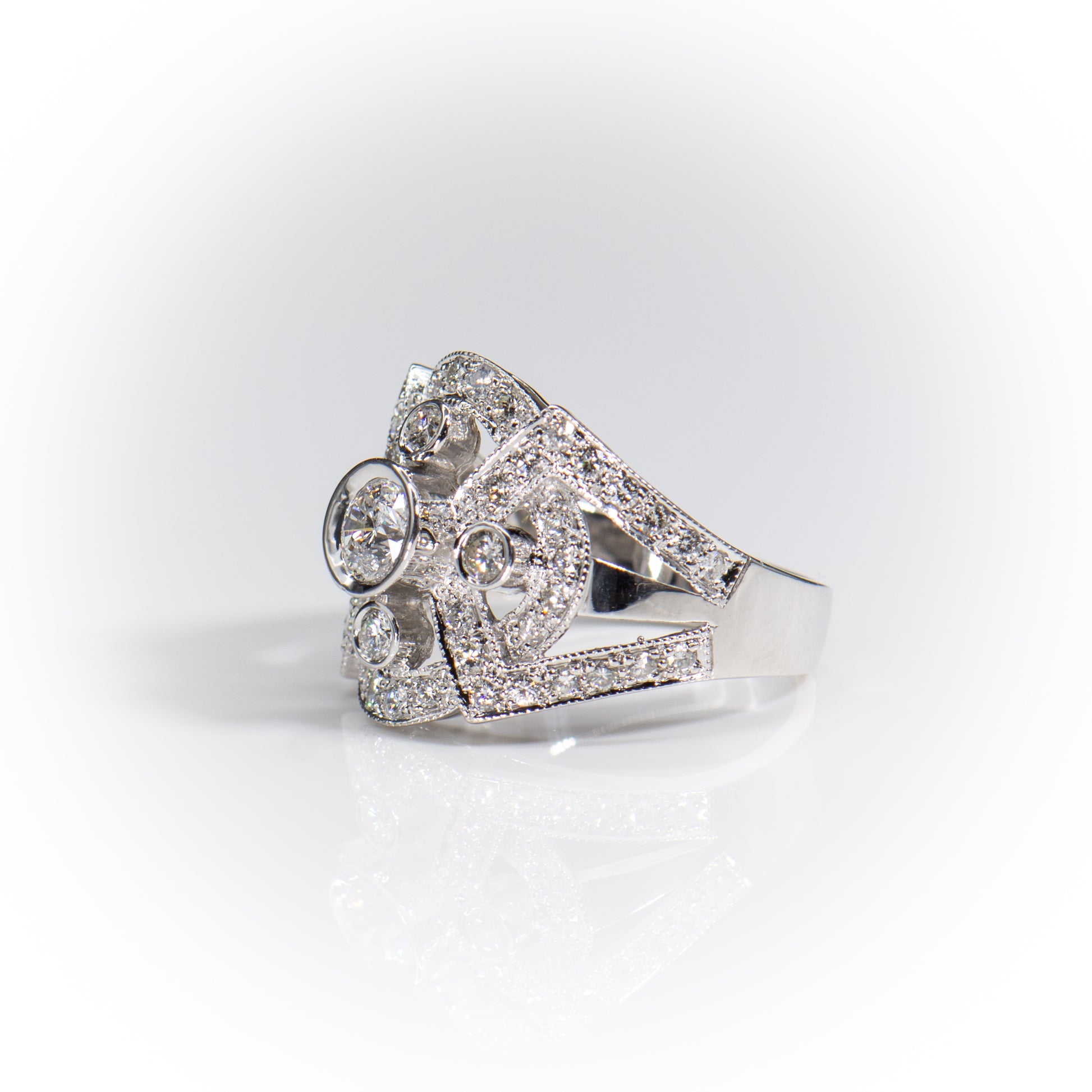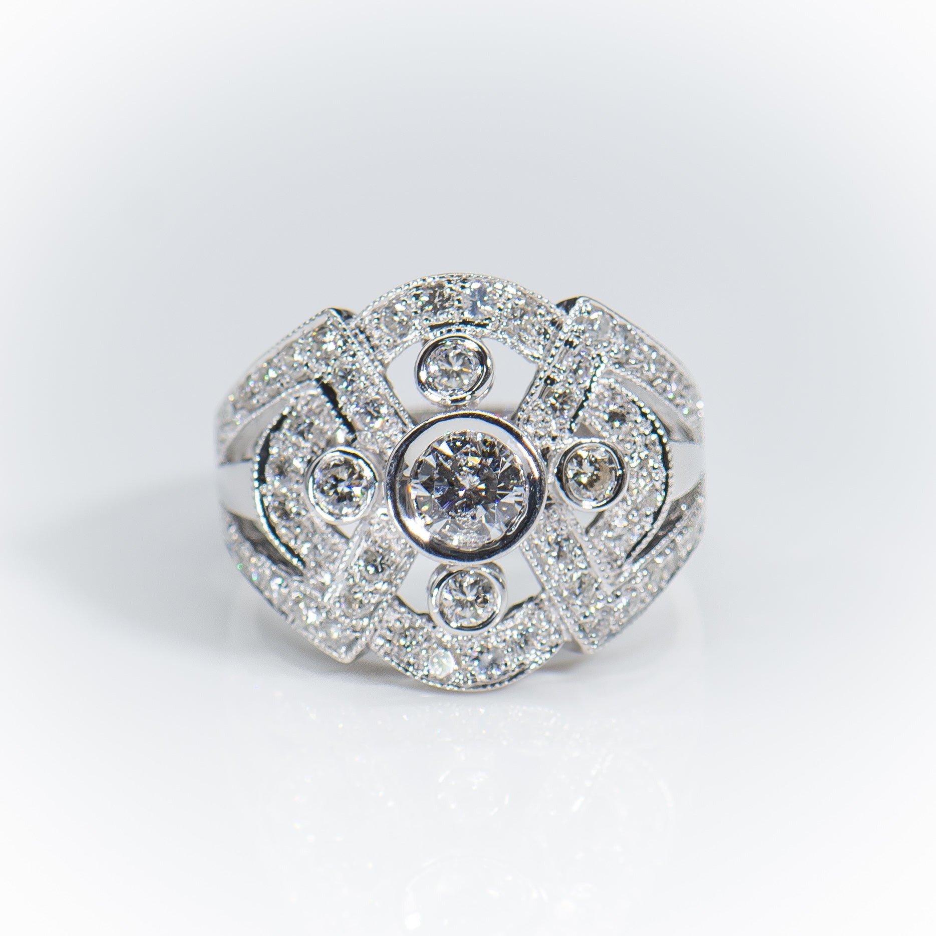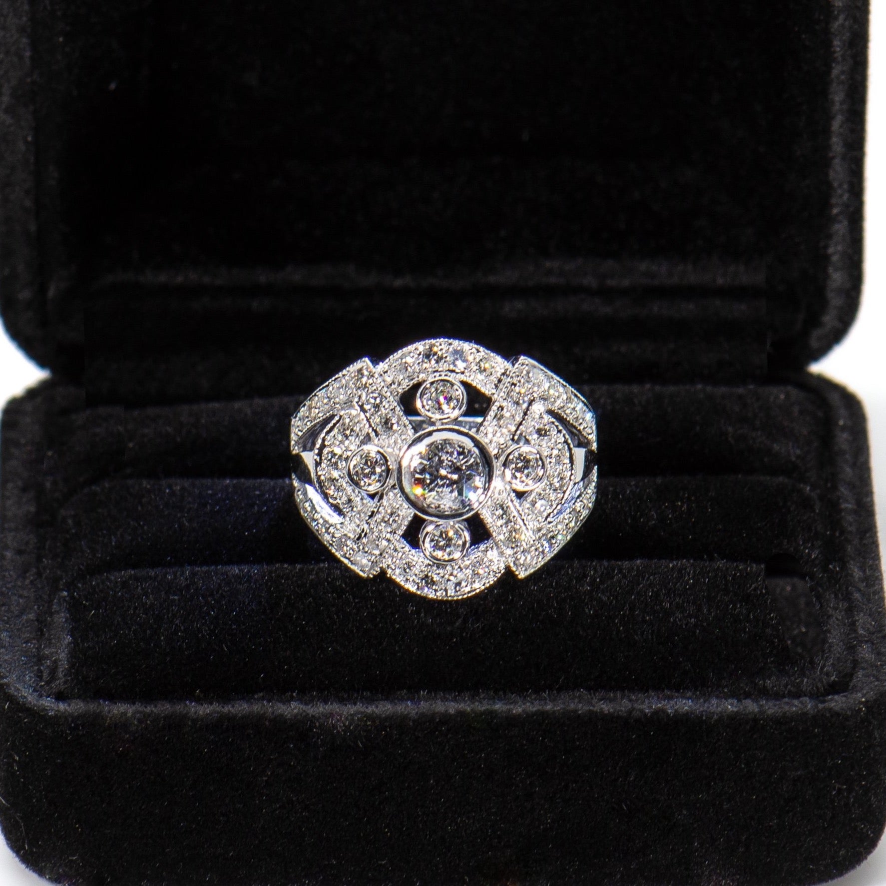 The classic symmetry and Art Deco detail creates this perfect ring, which is an ideal holiday gift, cocktail, statement, engagement or wedding ring.