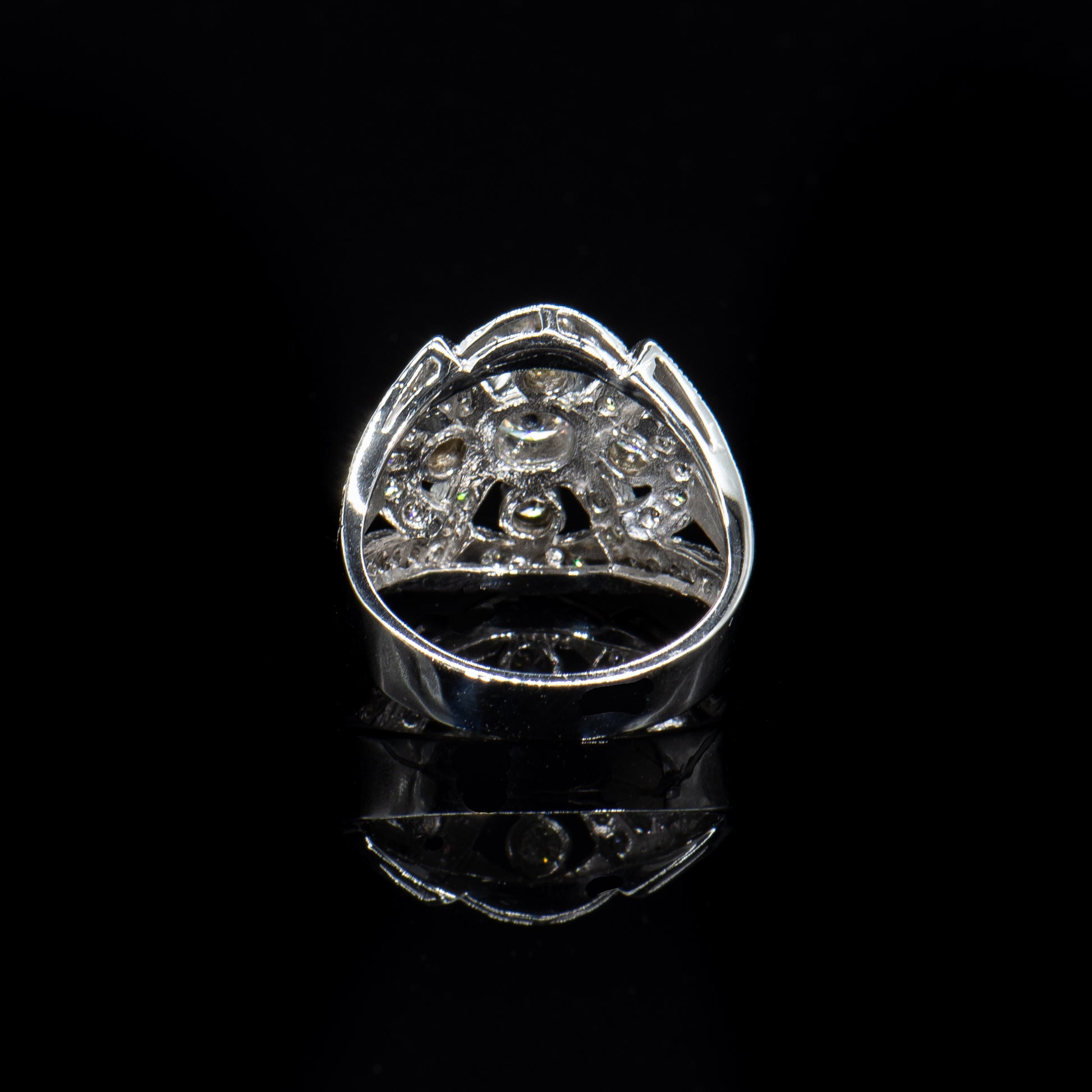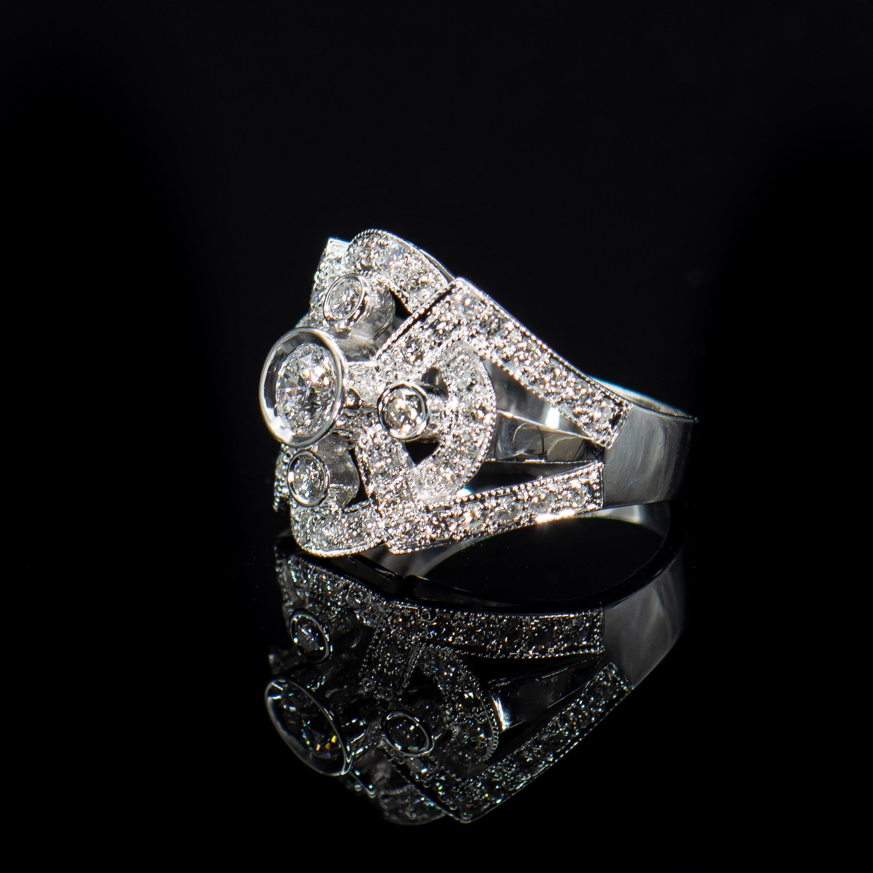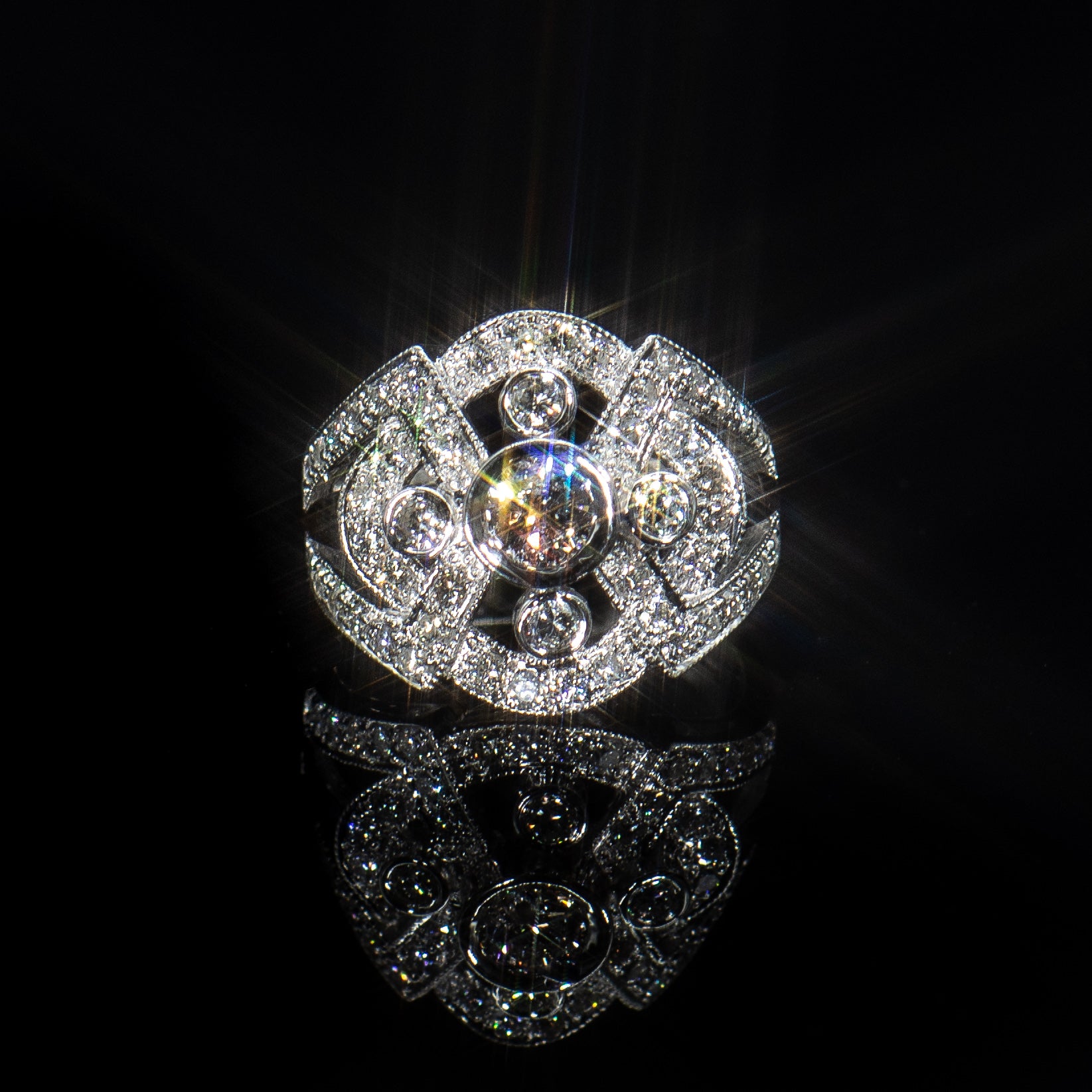 The classic symmetry and Art Deco detail creates this perfect ring, which is an ideal holiday gift, cocktail, statement, engagement or wedding ring.