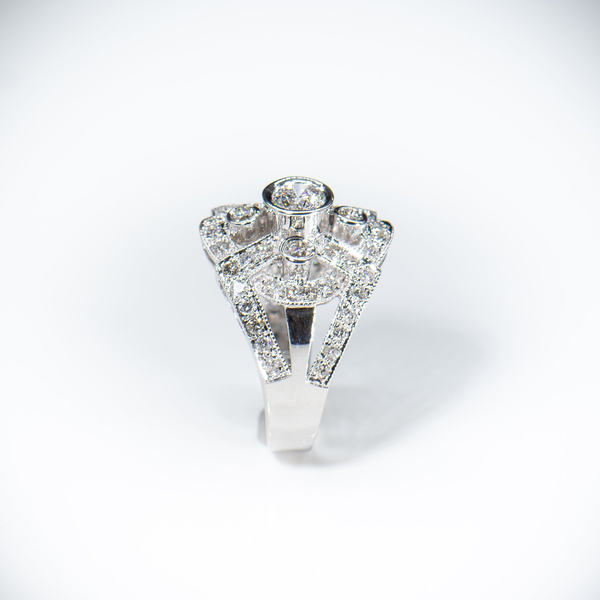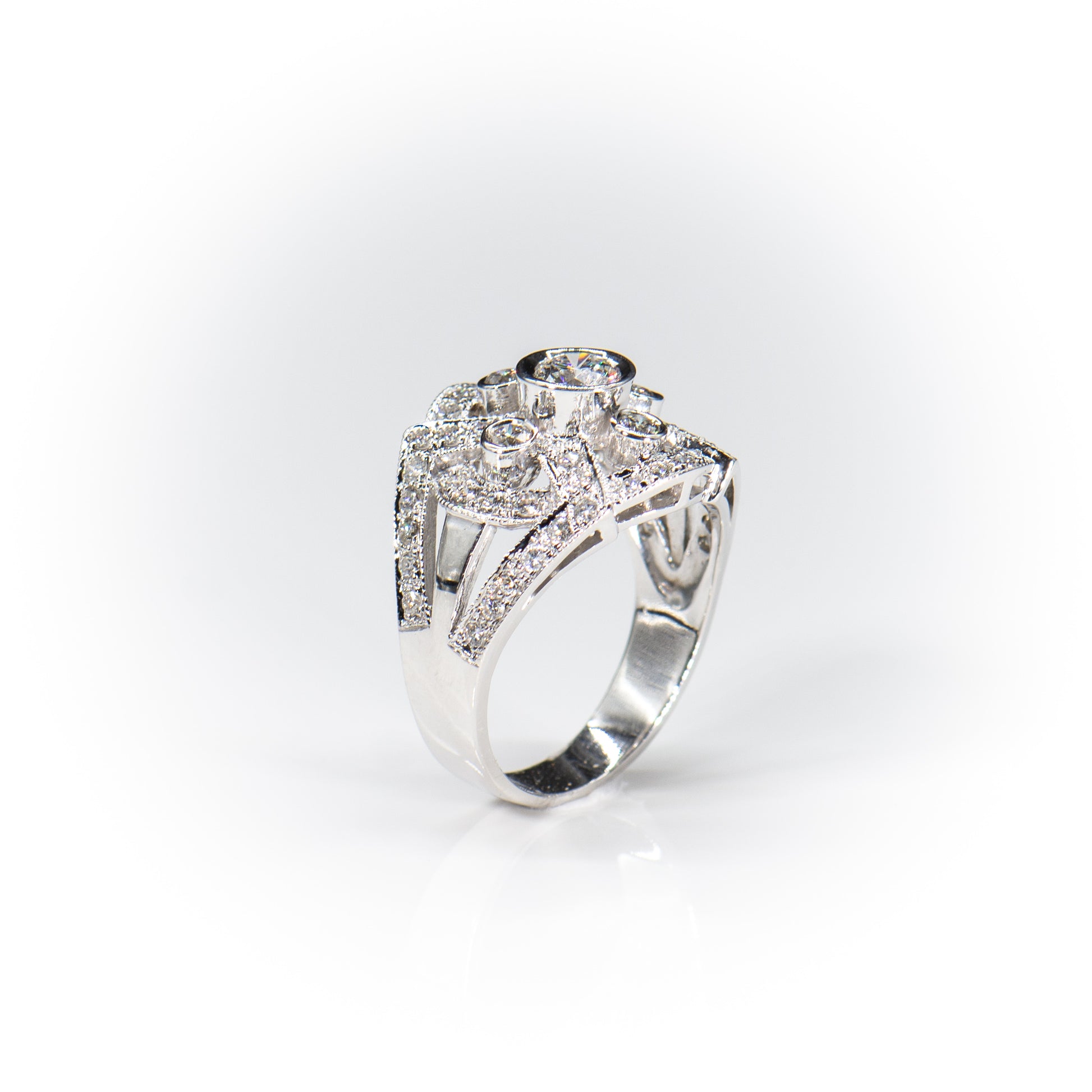This fantastic ring is designed with a glittering array of five centered bezel set full cut round diamonds, weighing approximately 1.15 carats, surrounded by pave diamonds, weighting approximately .75 carats, set in 14k white gold.