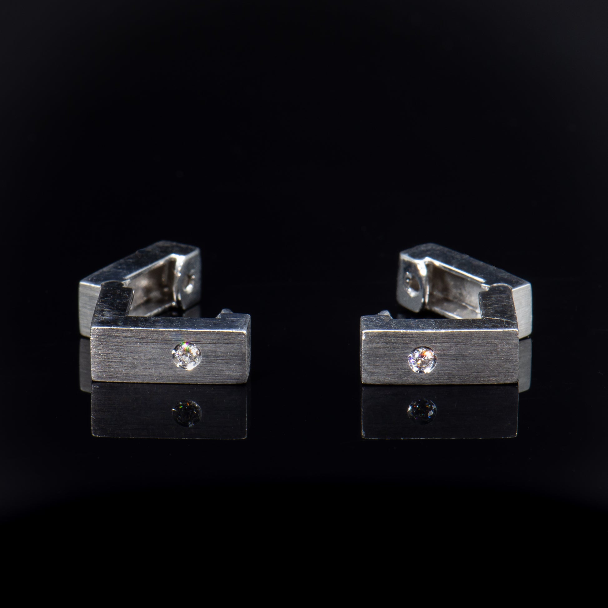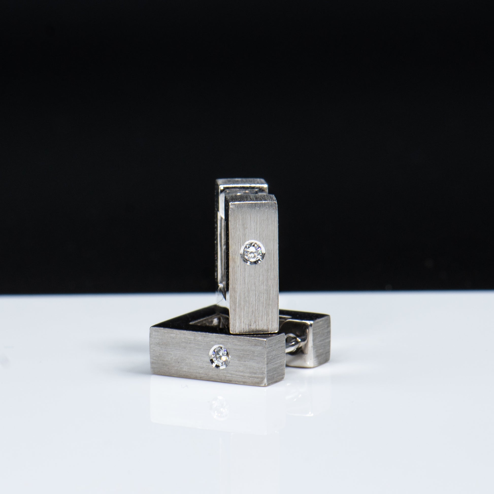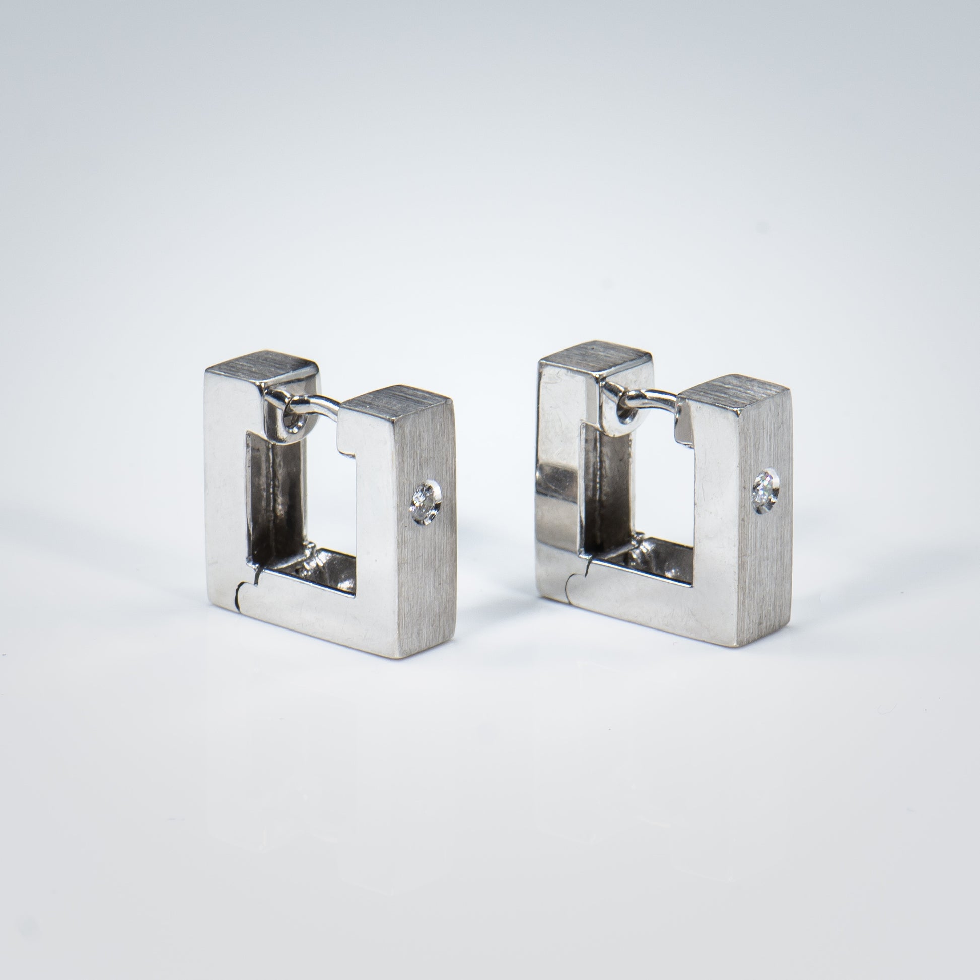 Finest design and craftsmanship is evident in the details of these exceptional earrings. The geometric profile is modulated with a combination of brushed and high polish gold finishes and a singular circular diamond. Wonderful feel against the skin. Shown with our contemporary diamond & white gold circle pendant necklace available for sale.