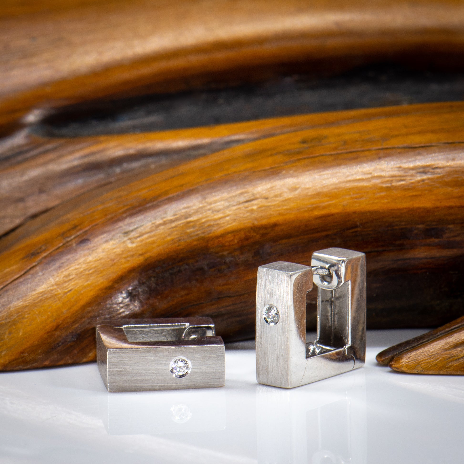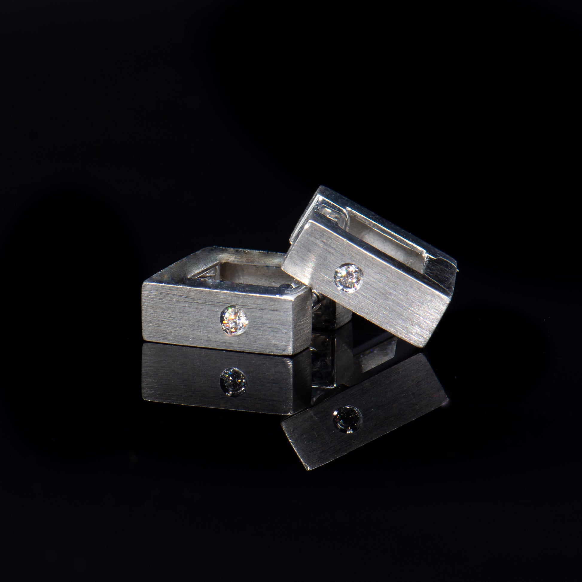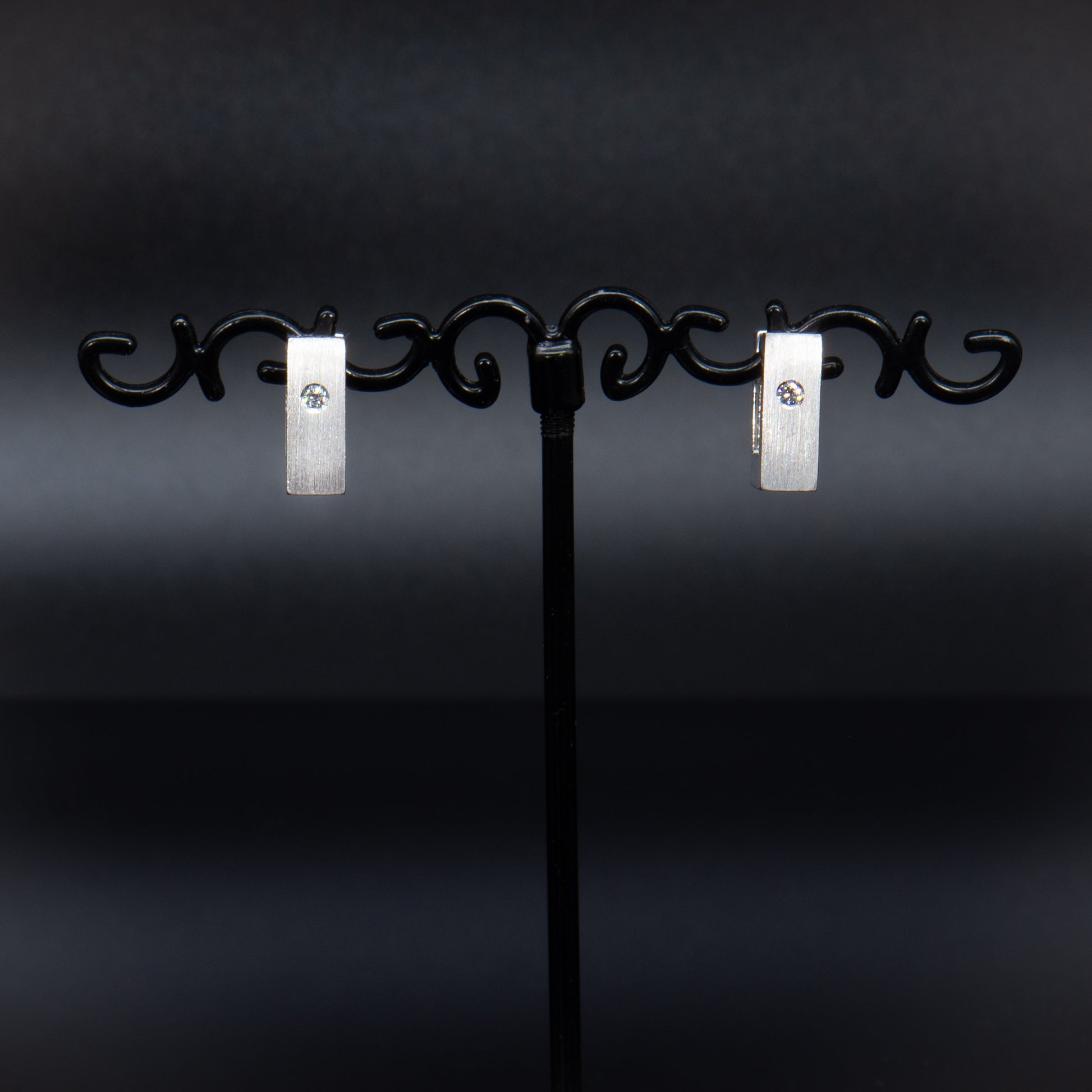 Finest design and craftsmanship is evident in the details of these exceptional earrings. The geometric profile is modulated with a combination of brushed and high polish gold finishes and a singular circular diamond. Wonderful feel against the skin. Shown with our contemporary diamond & white gold circle pendant necklace available for sale.