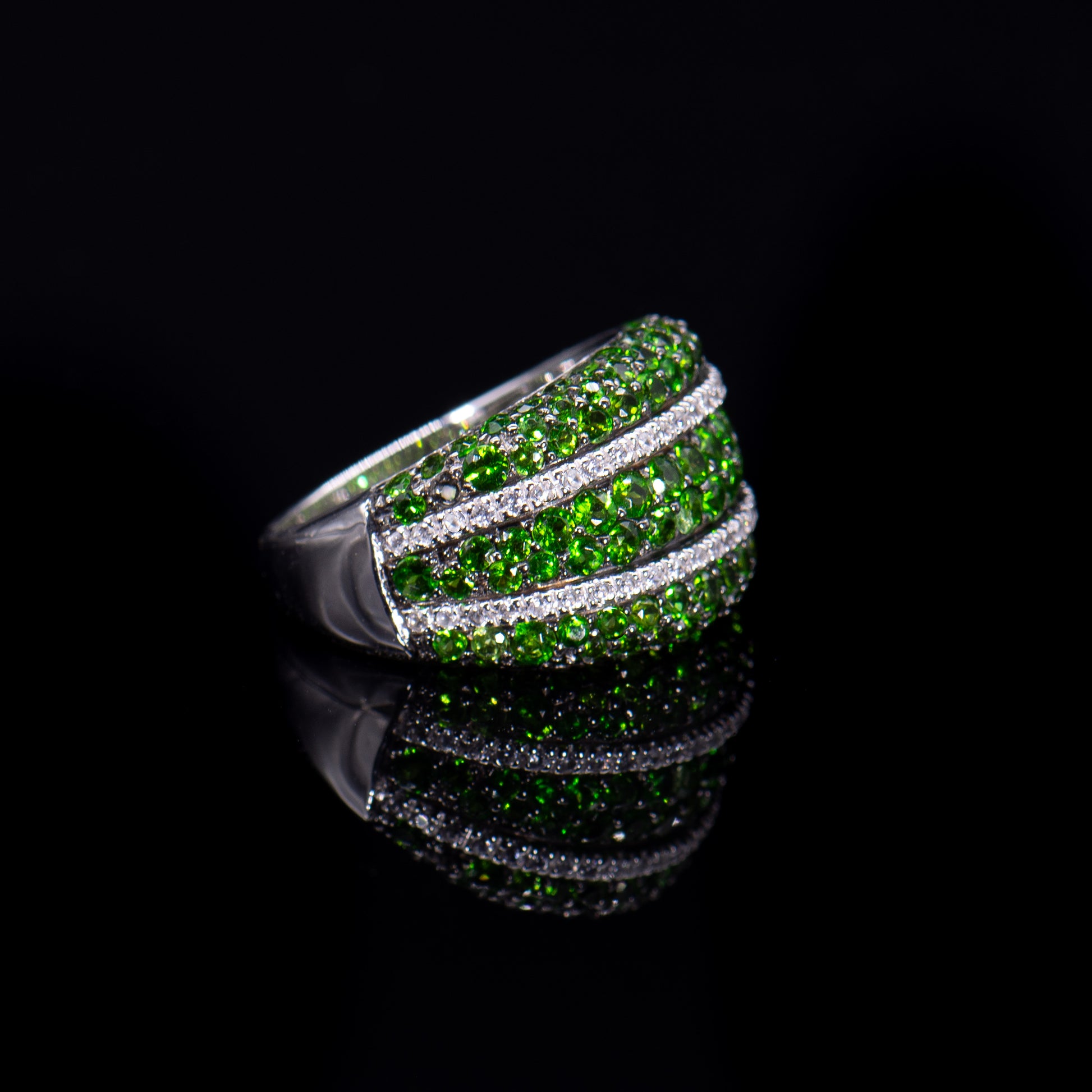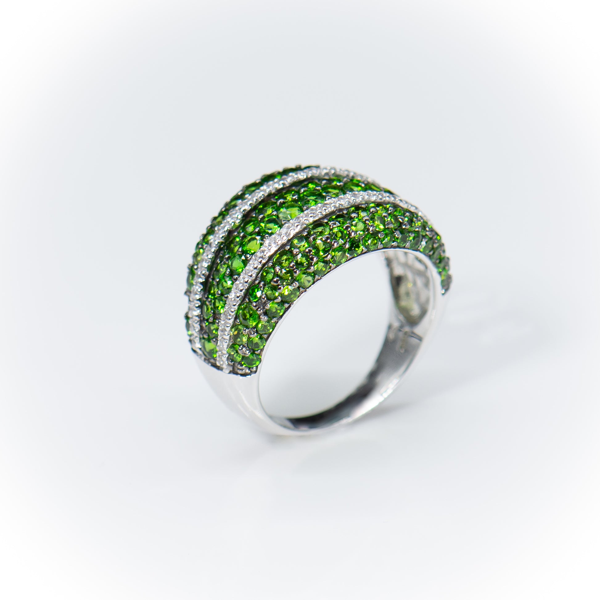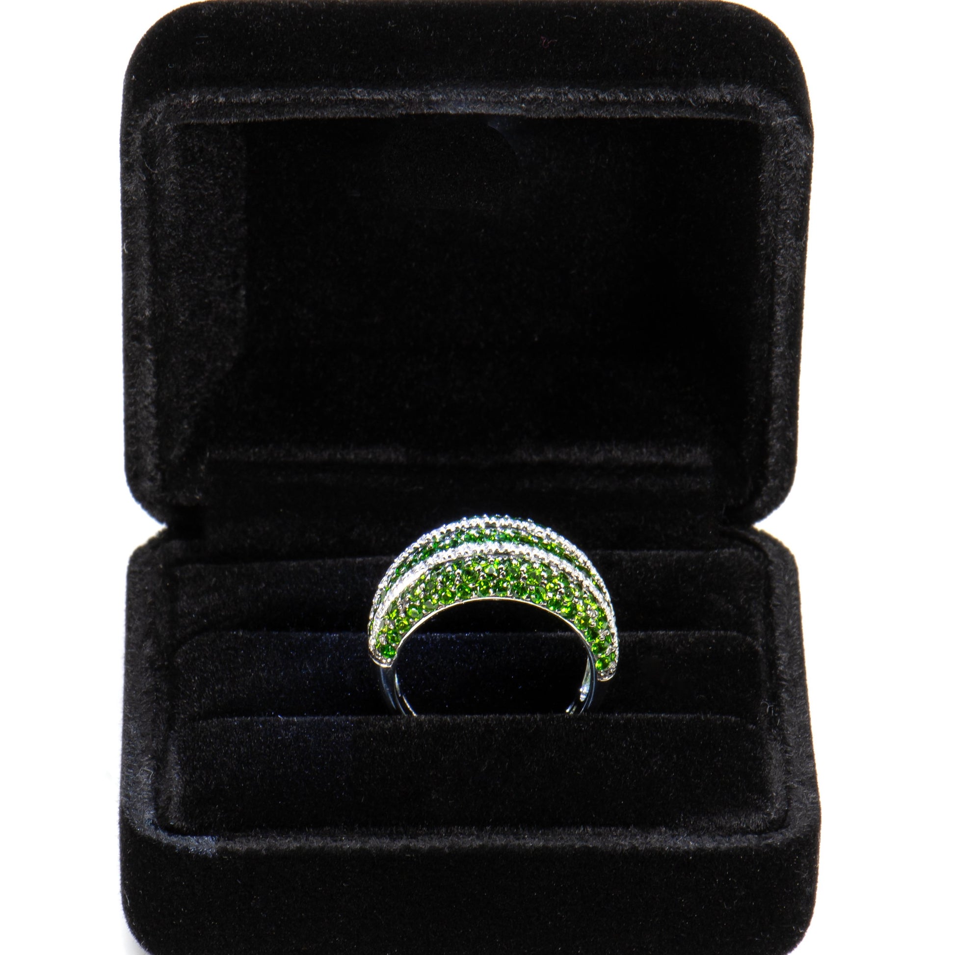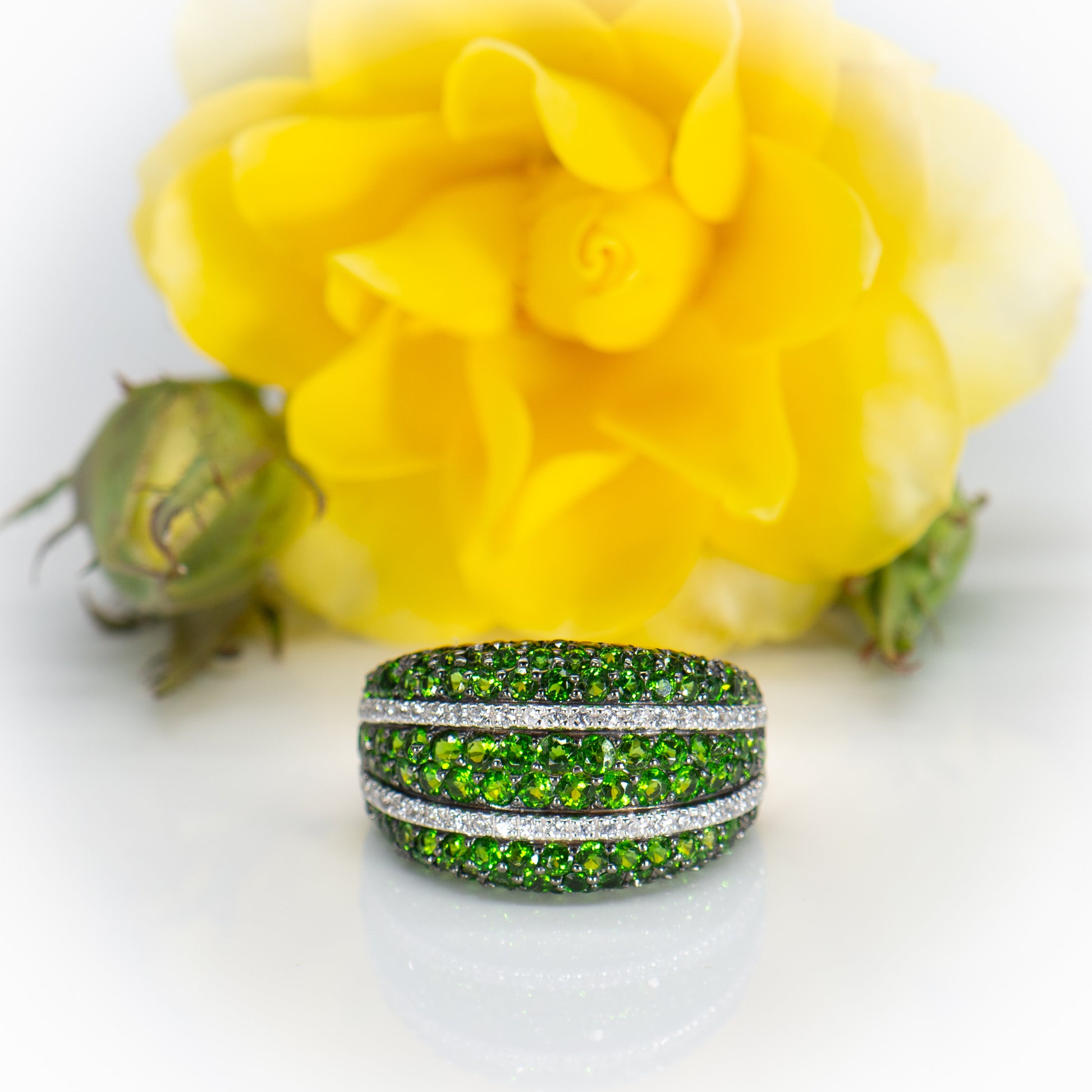 This phenomenal ring is one of our favorites! The design is comprised of more than 100 round shaped natural green Tsavorite Garnet and Peridot gemstones accented by full-cut colorless white sapphires weighing approximately 3.00 carats, set in 14k white gold in a high polish finish.