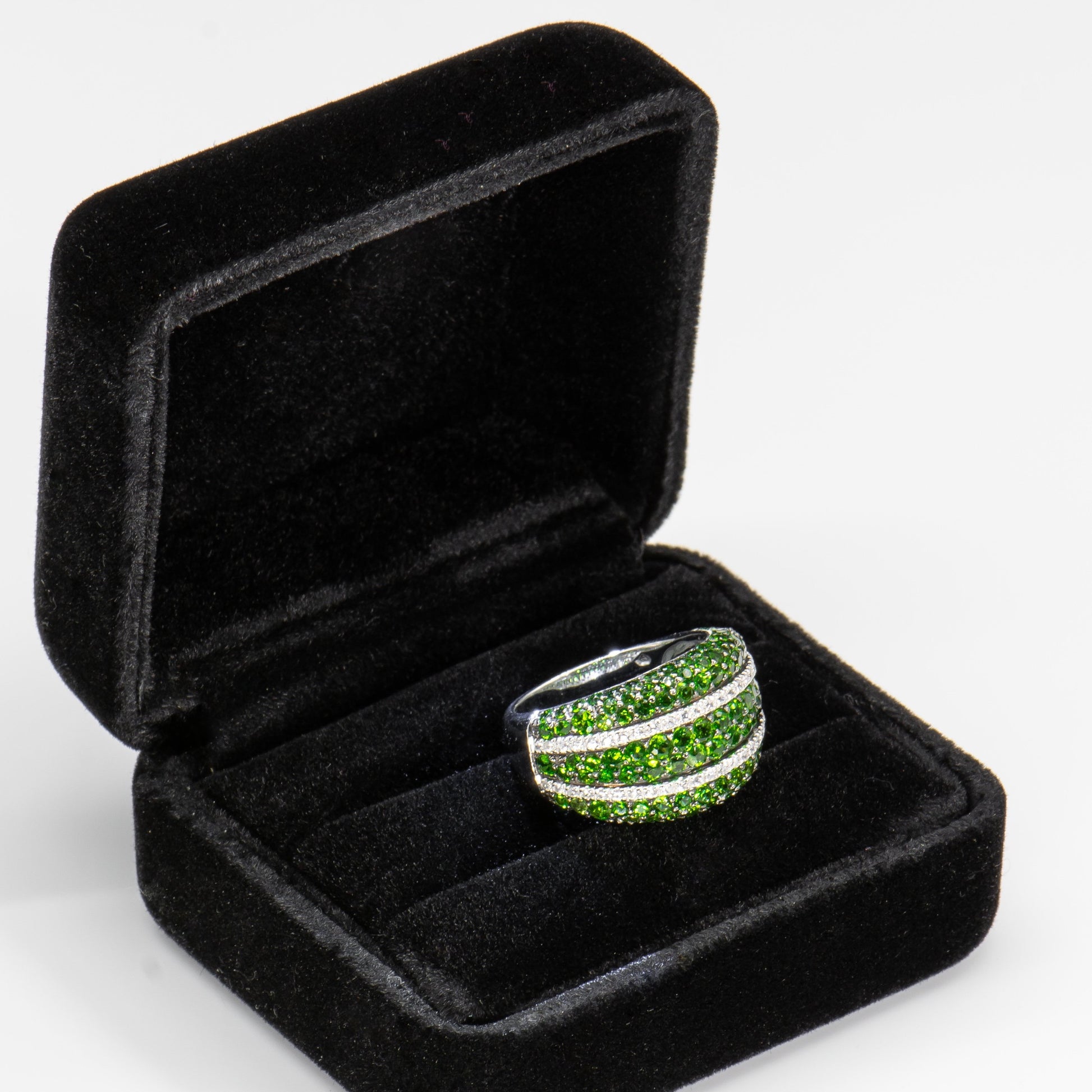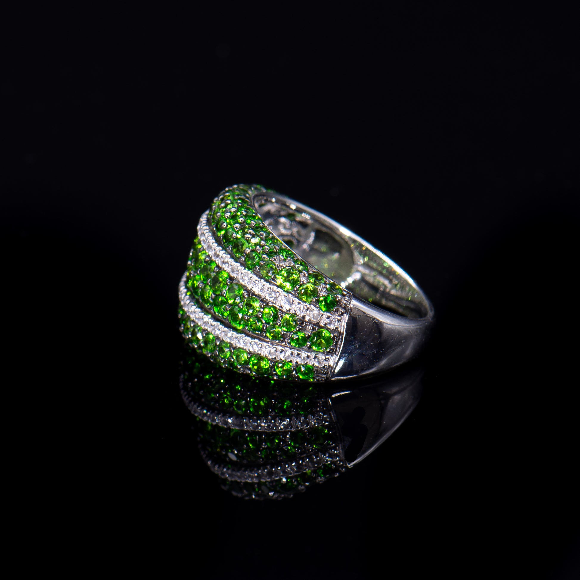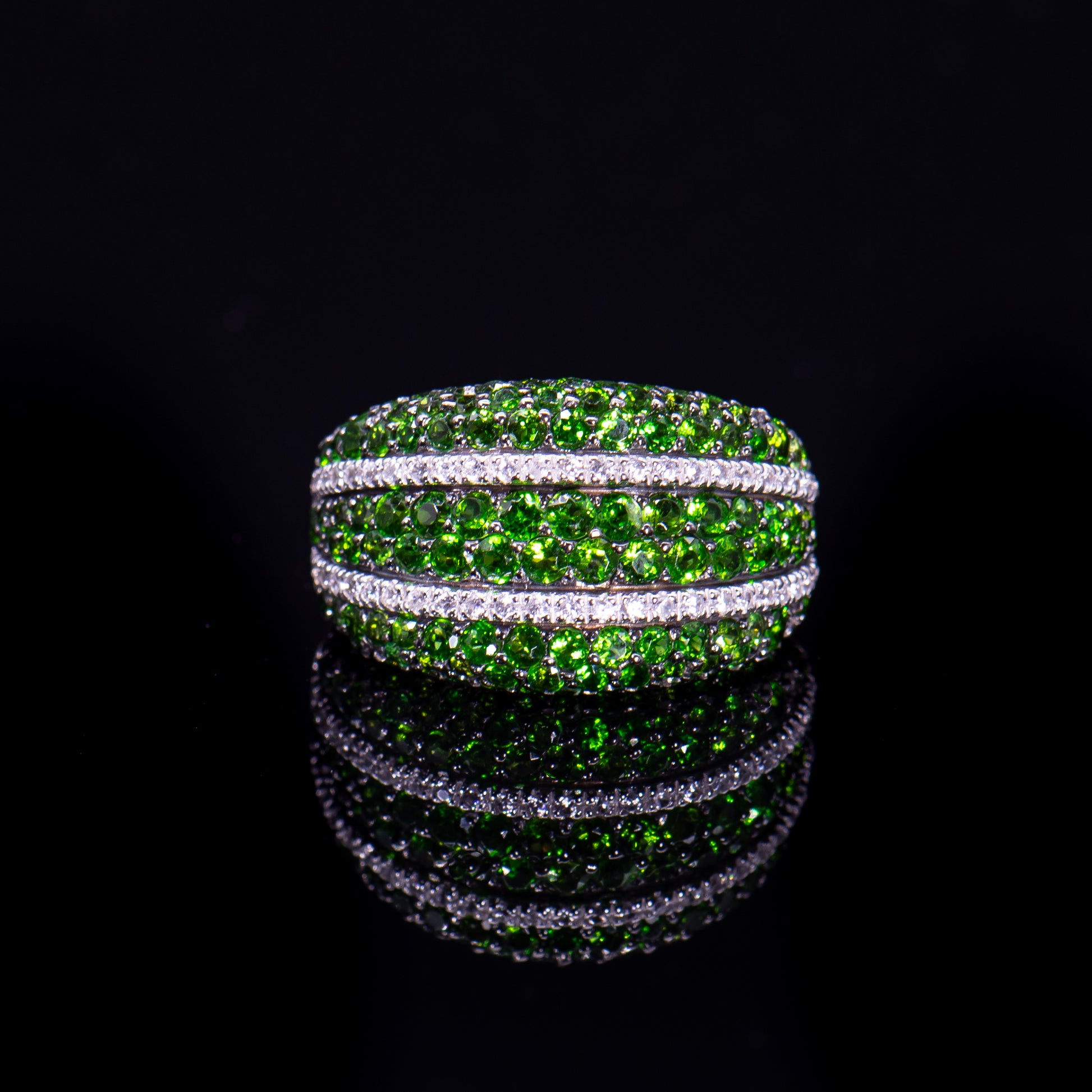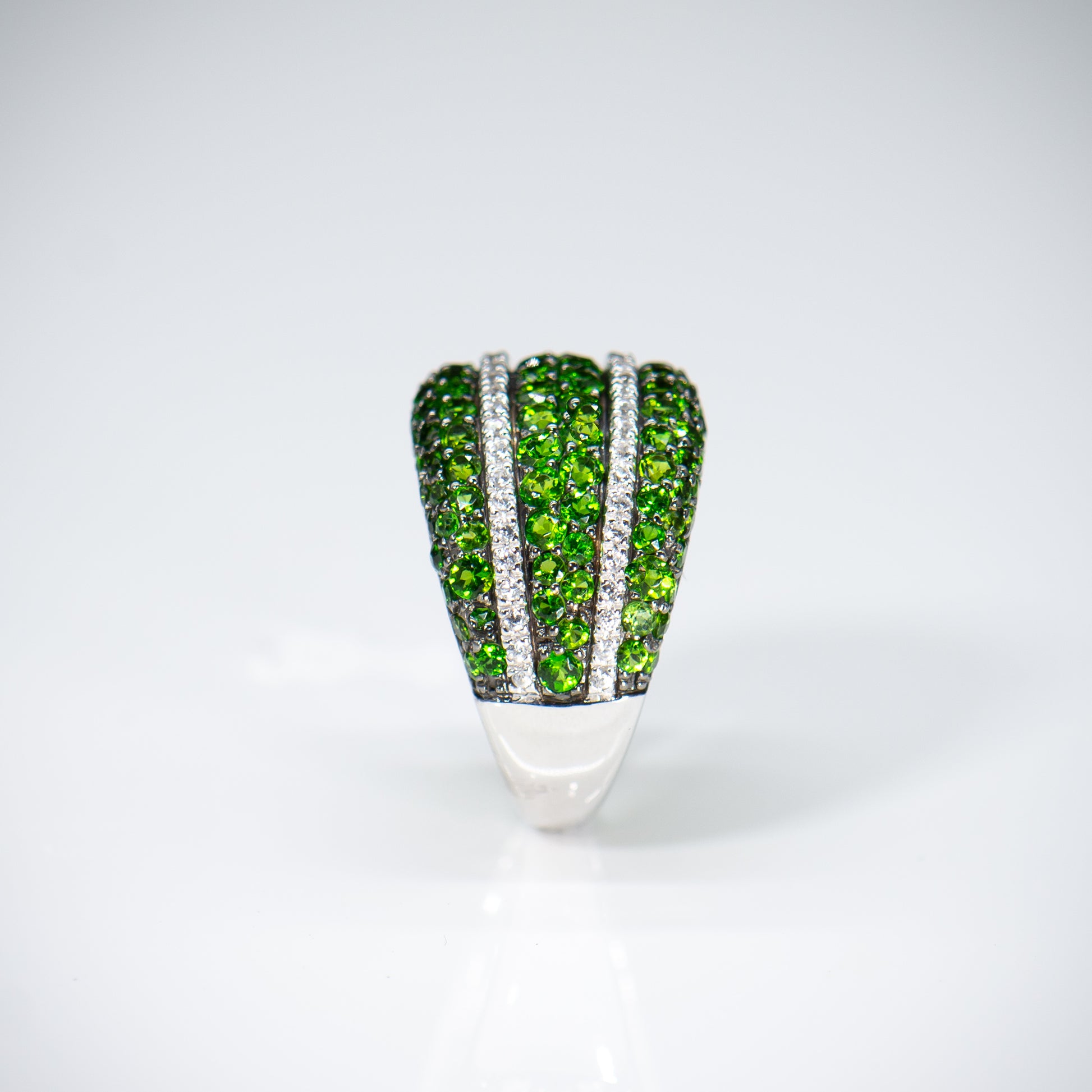 This phenomenal ring is one of our favorites! The design is comprised of more than 100 round shaped natural green Tsavorite Garnet and Peridot gemstones accented by full-cut colorless white sapphires weighing approximately 3.00 carats, set in 14k white gold in a high polish finish.