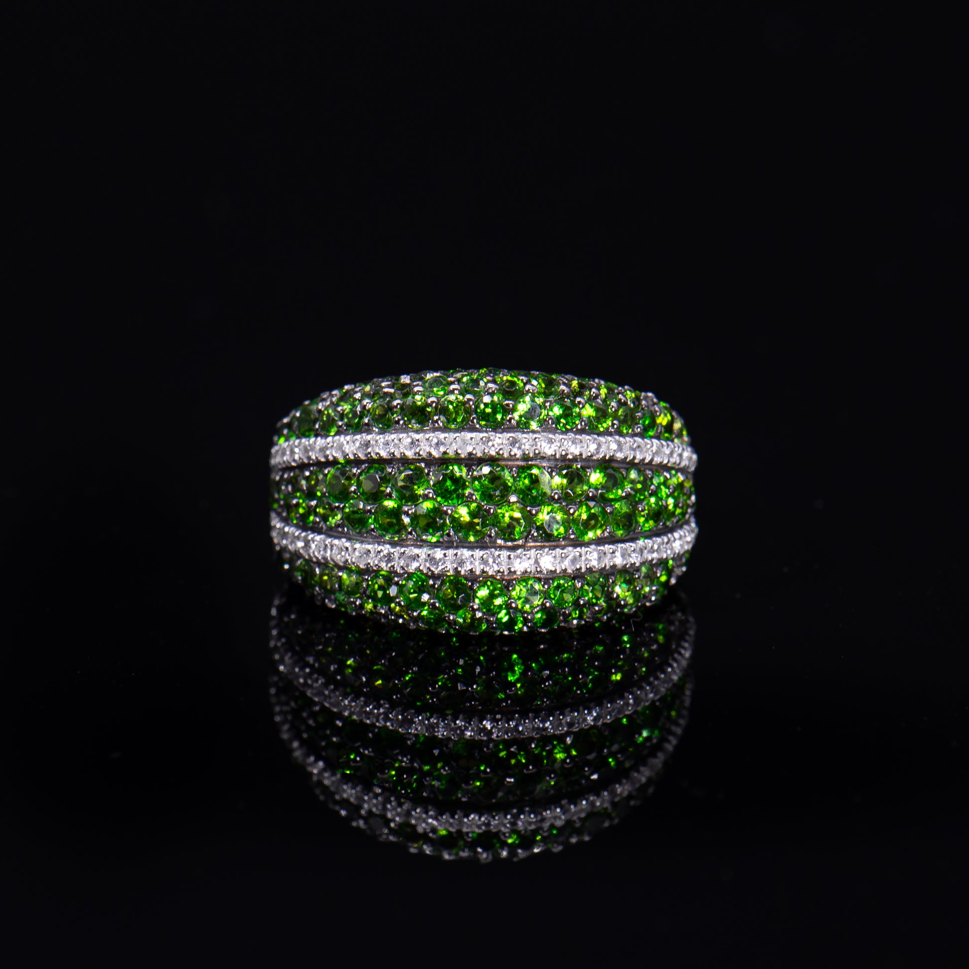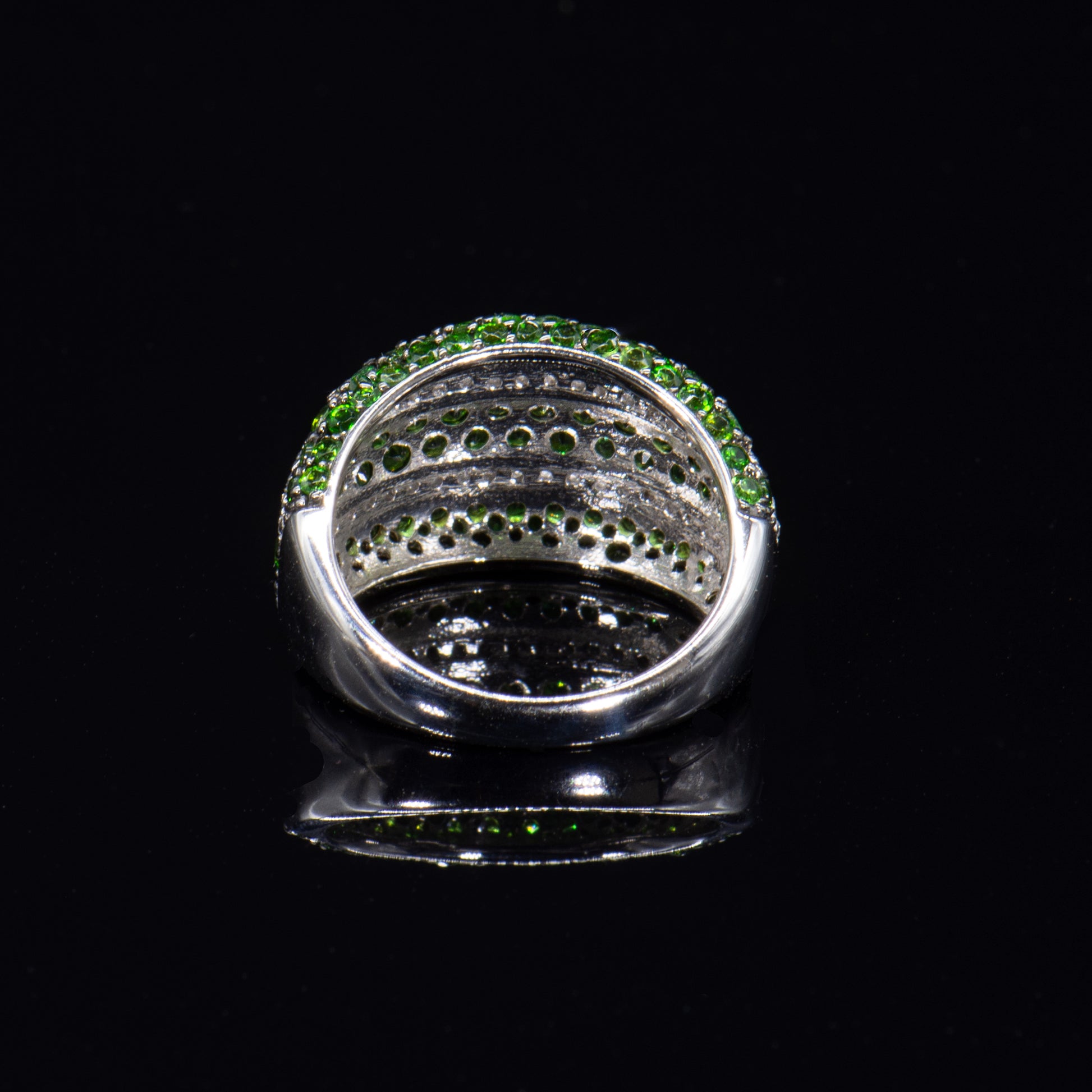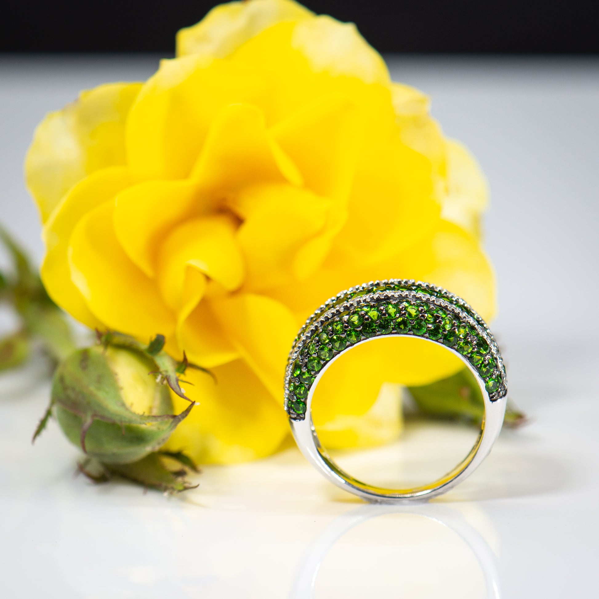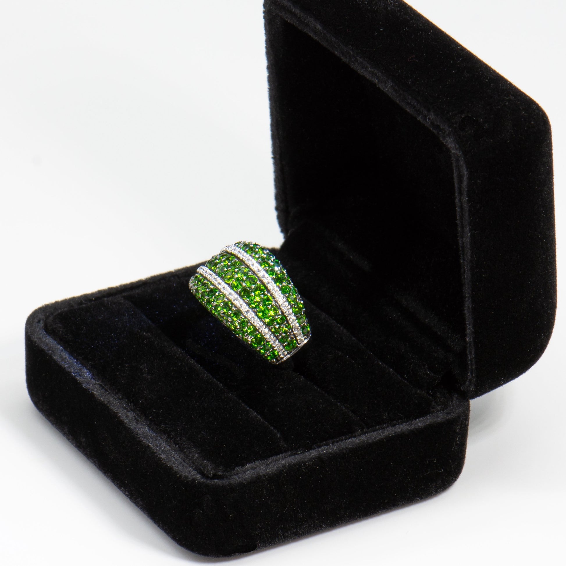 This phenomenal ring is one of our favorites! The design is comprised of more than 100 round shaped natural green Tsavorite Garnet and Peridot gemstones accented by full-cut colorless white sapphires weighing approximately 3.00 carats, set in 14k white gold in a high polish finish.