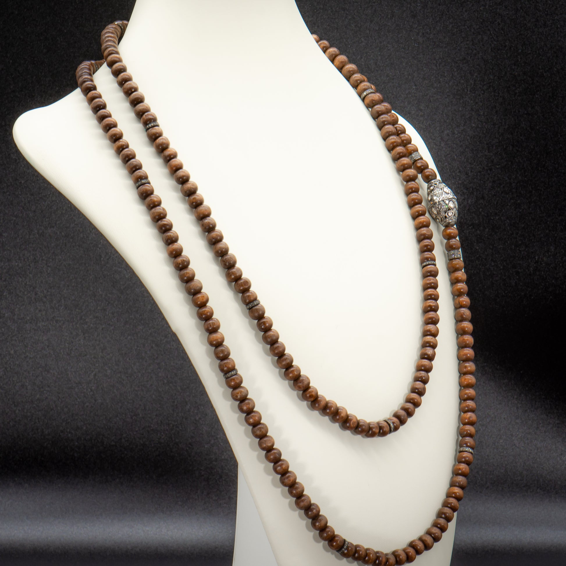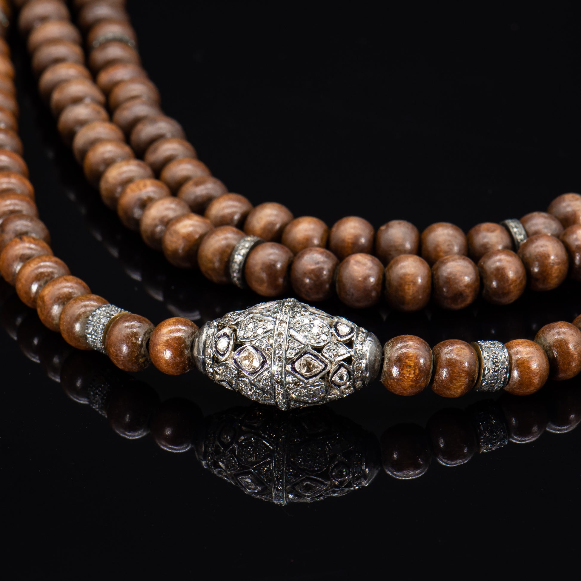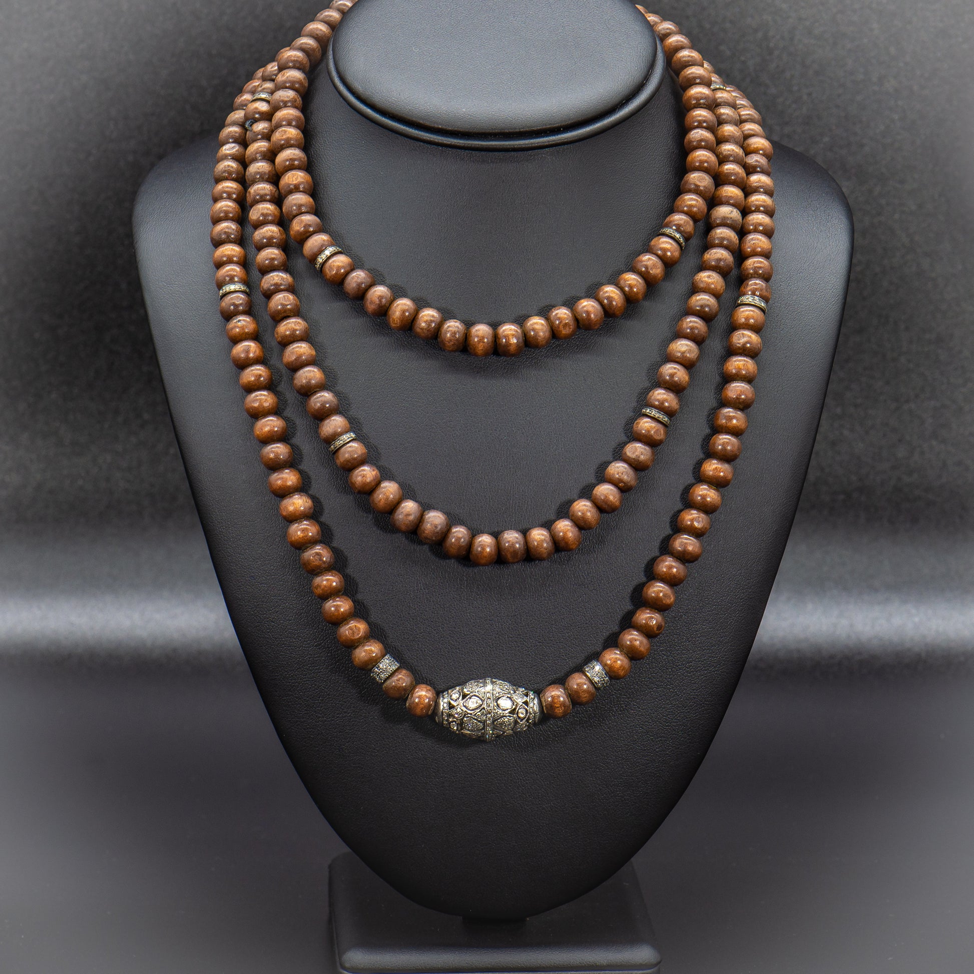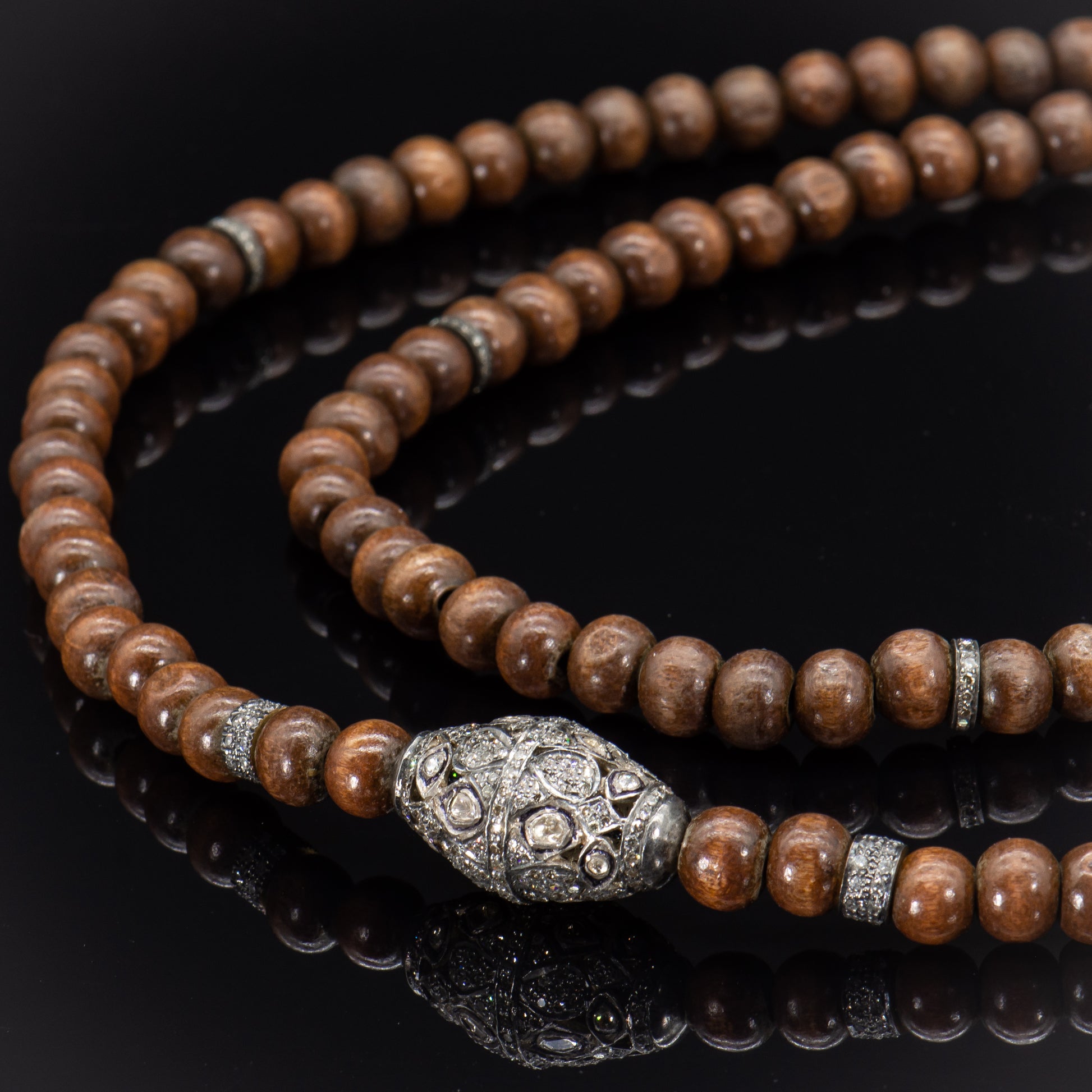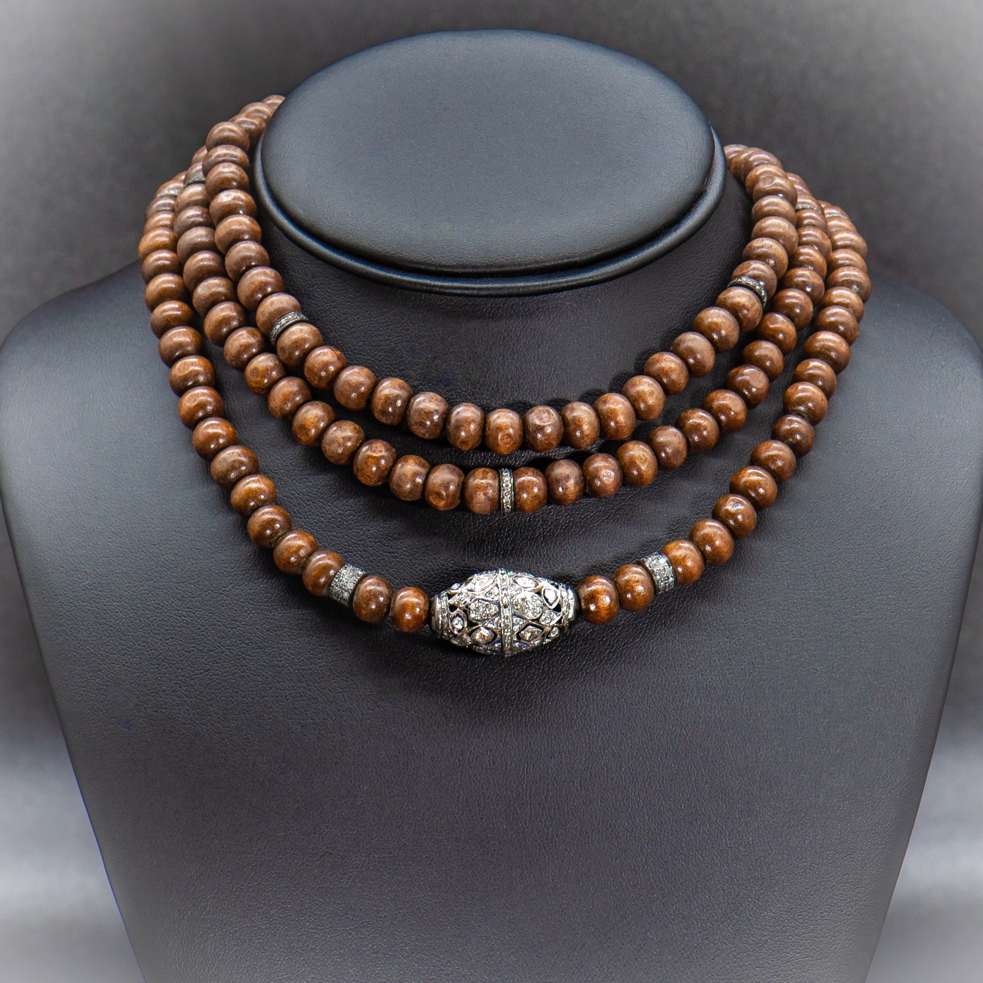 This beautiful statement necklace is comprised of 226 natural ebony wood beads, embellished with sterling silver diamond studded spacers and an exquisite glittering diamond center adornment.