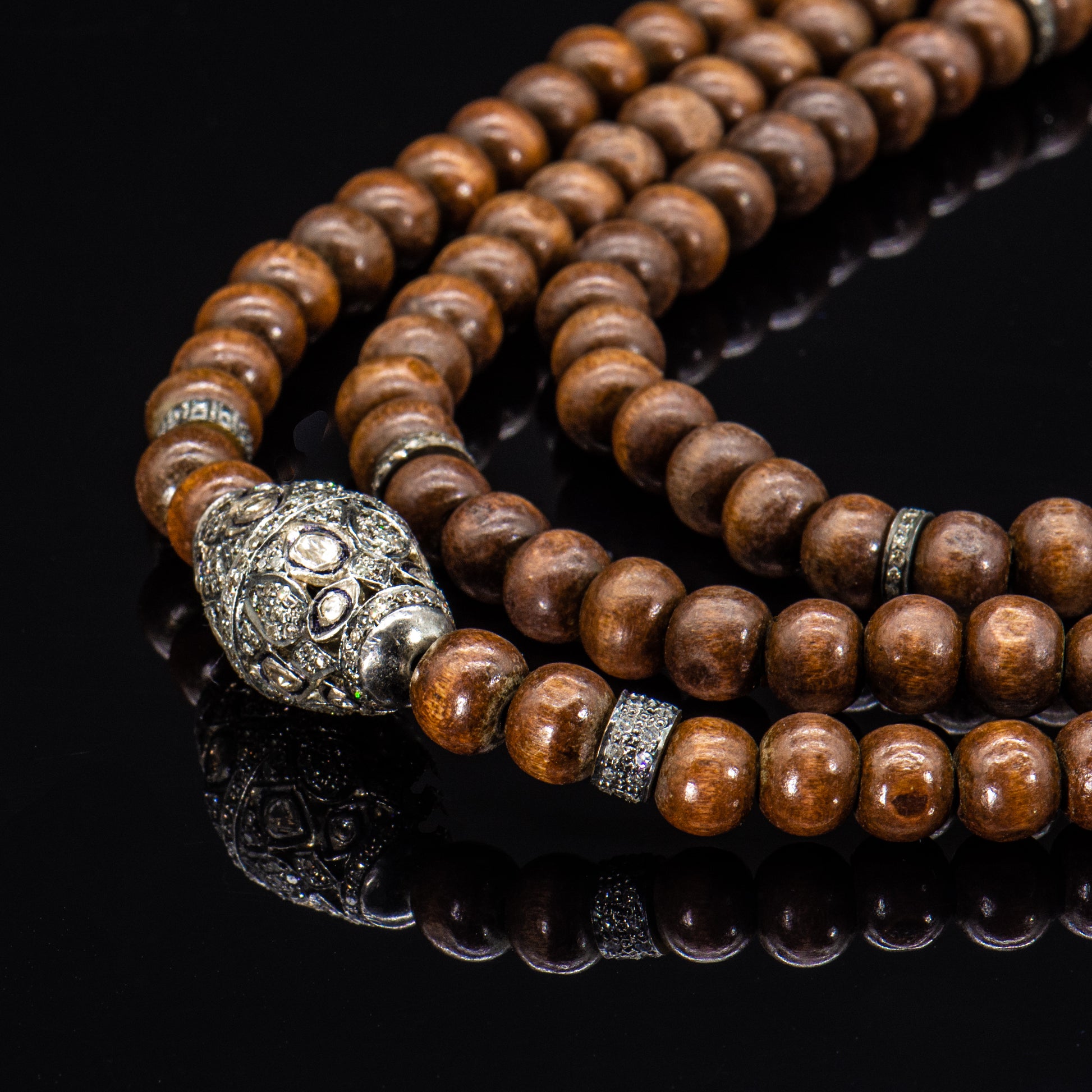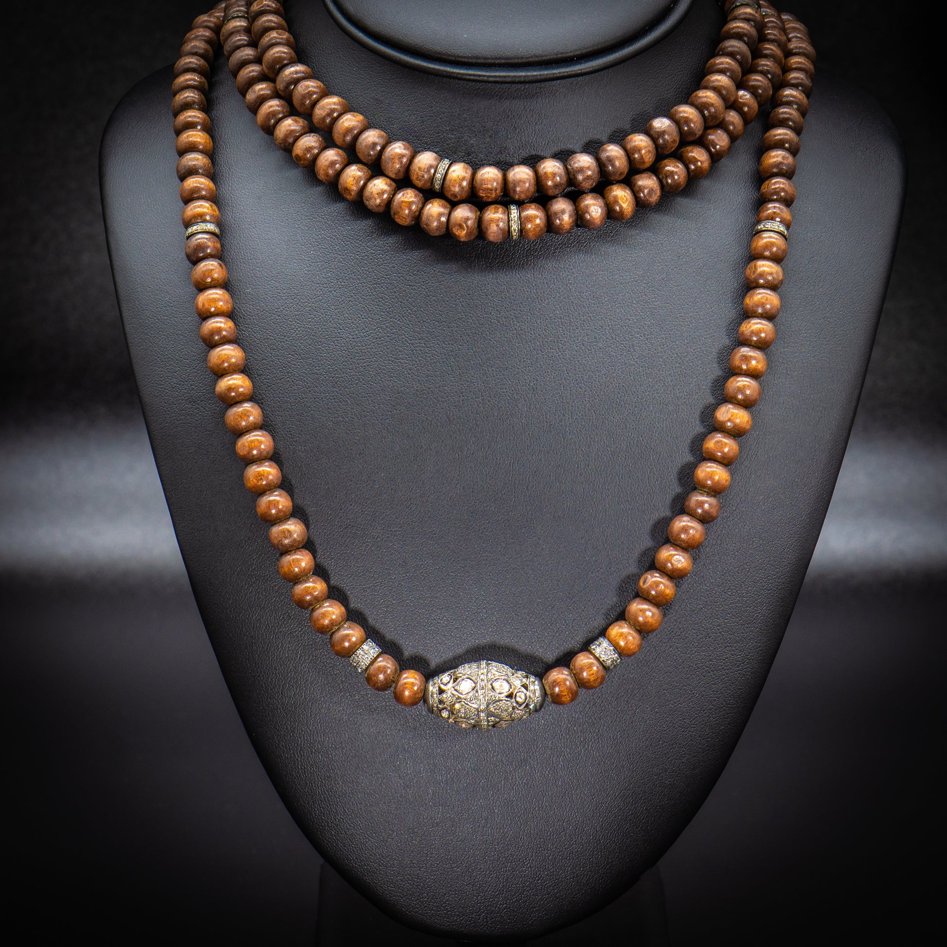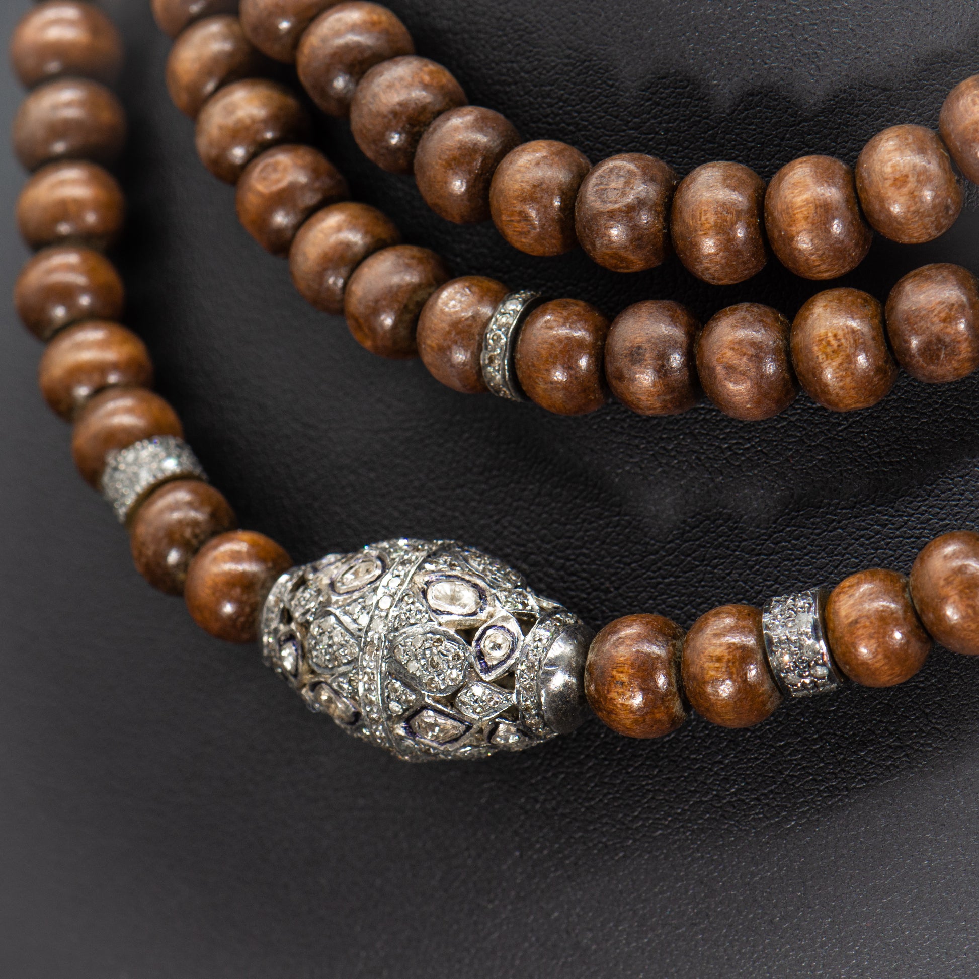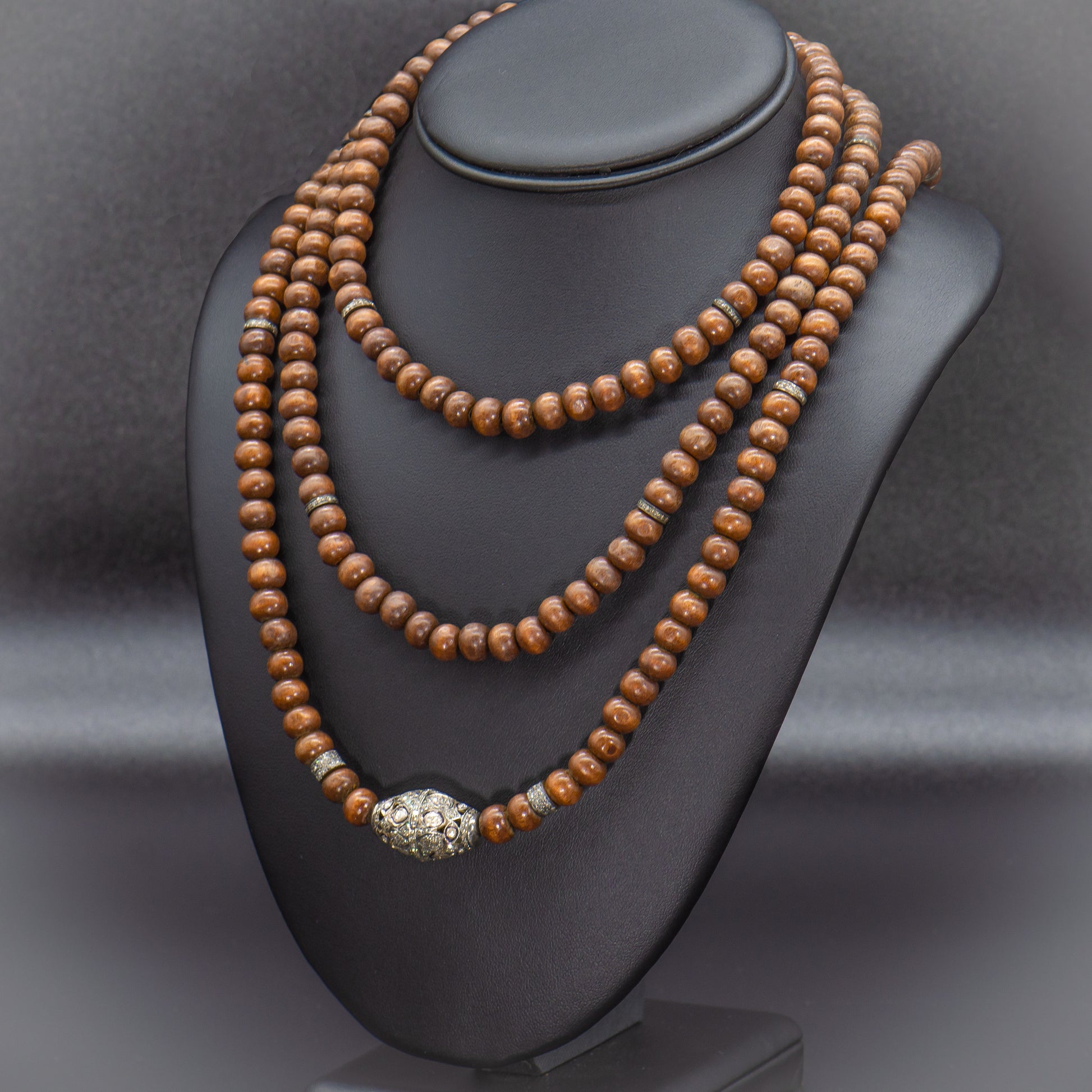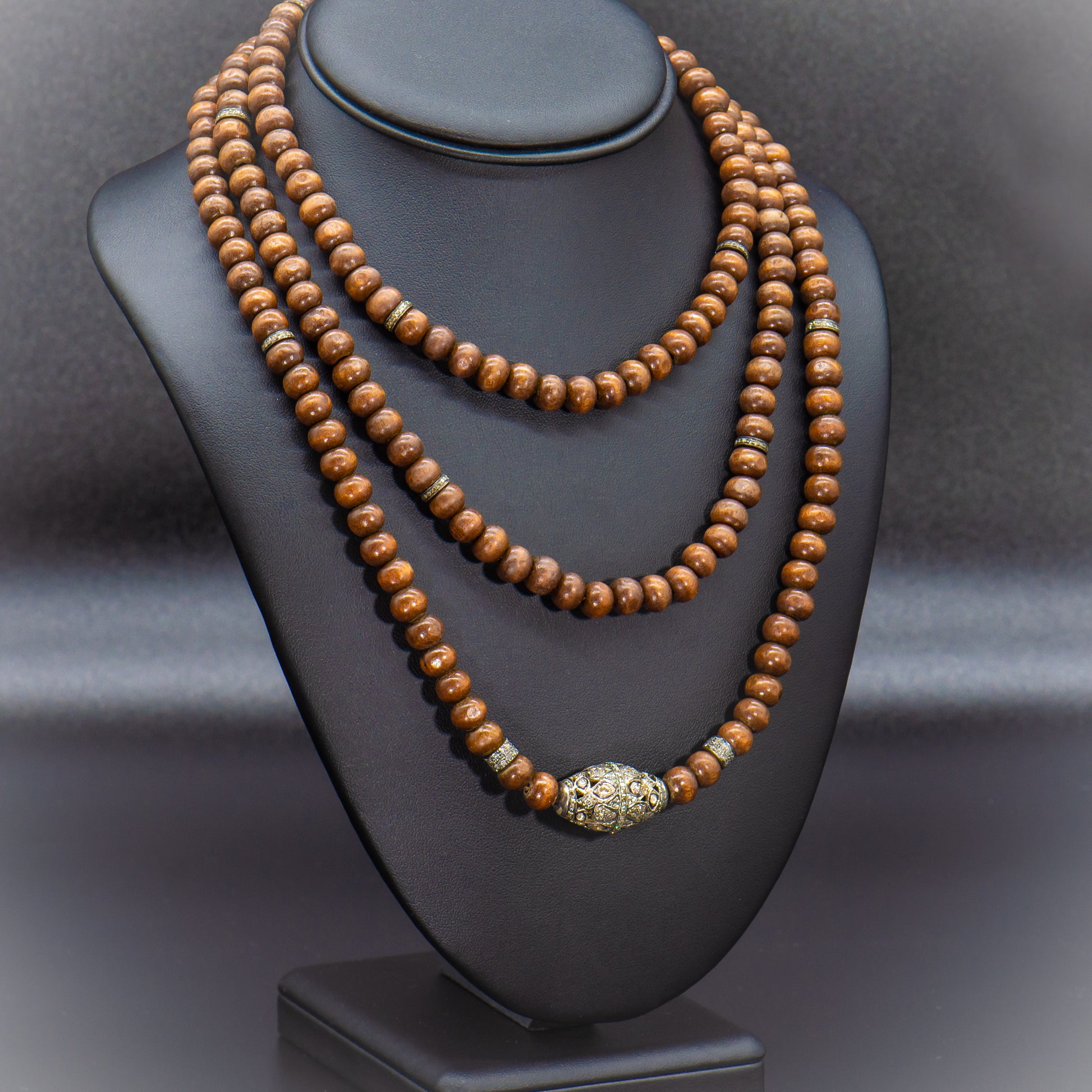 This beautiful statement necklace is comprised of 226 natural ebony wood beads, embellished with sterling silver diamond studded spacers and an exquisite glittering diamond center adornment.