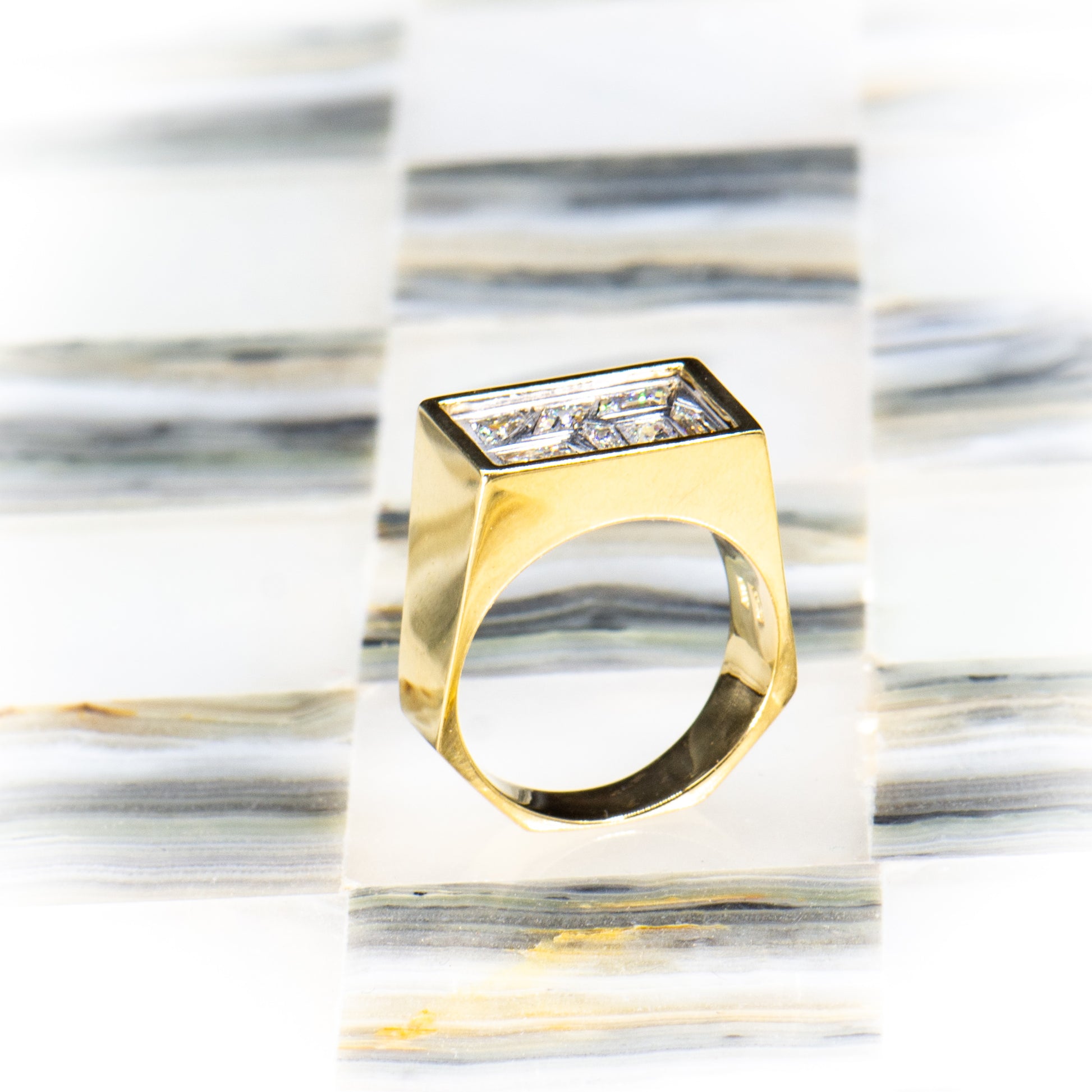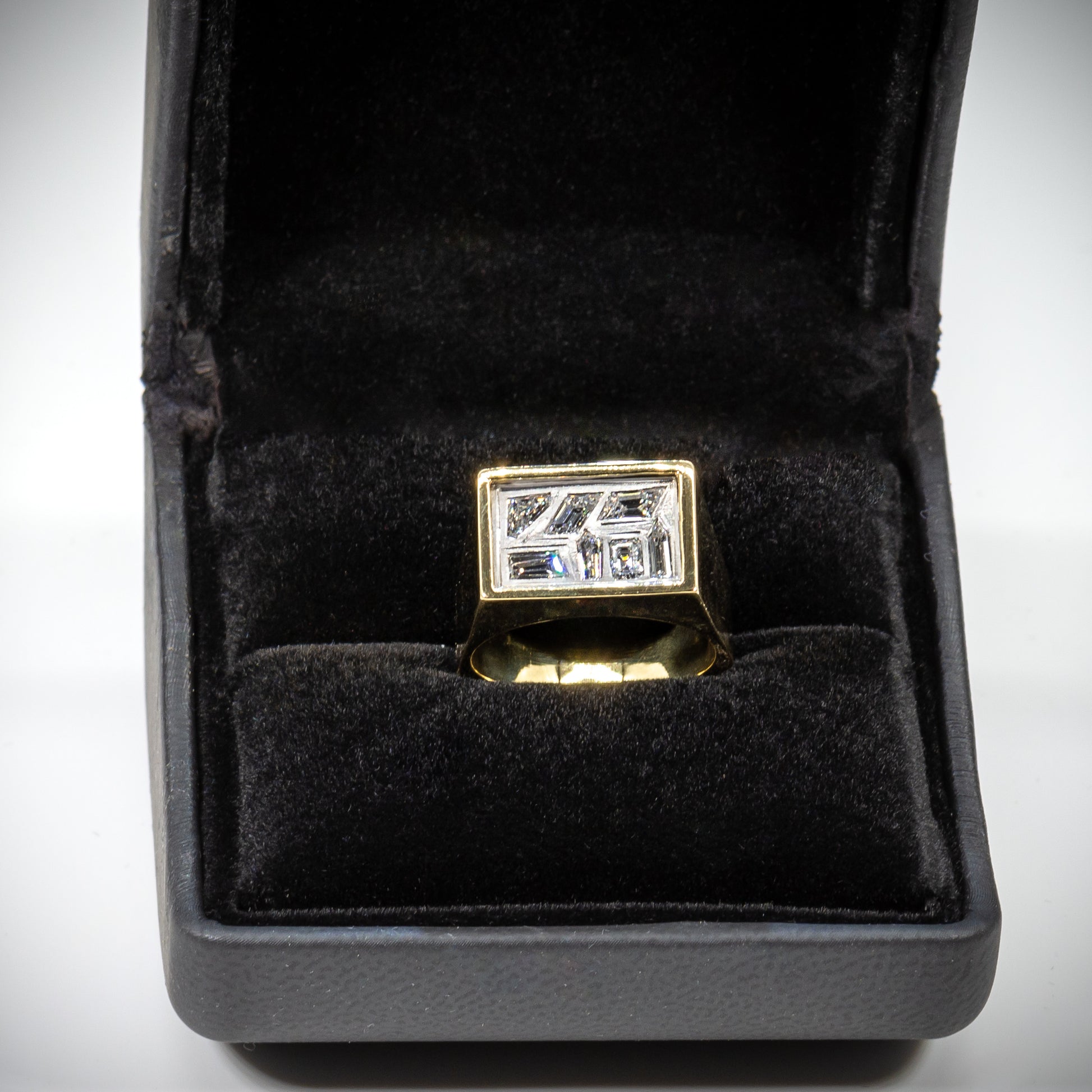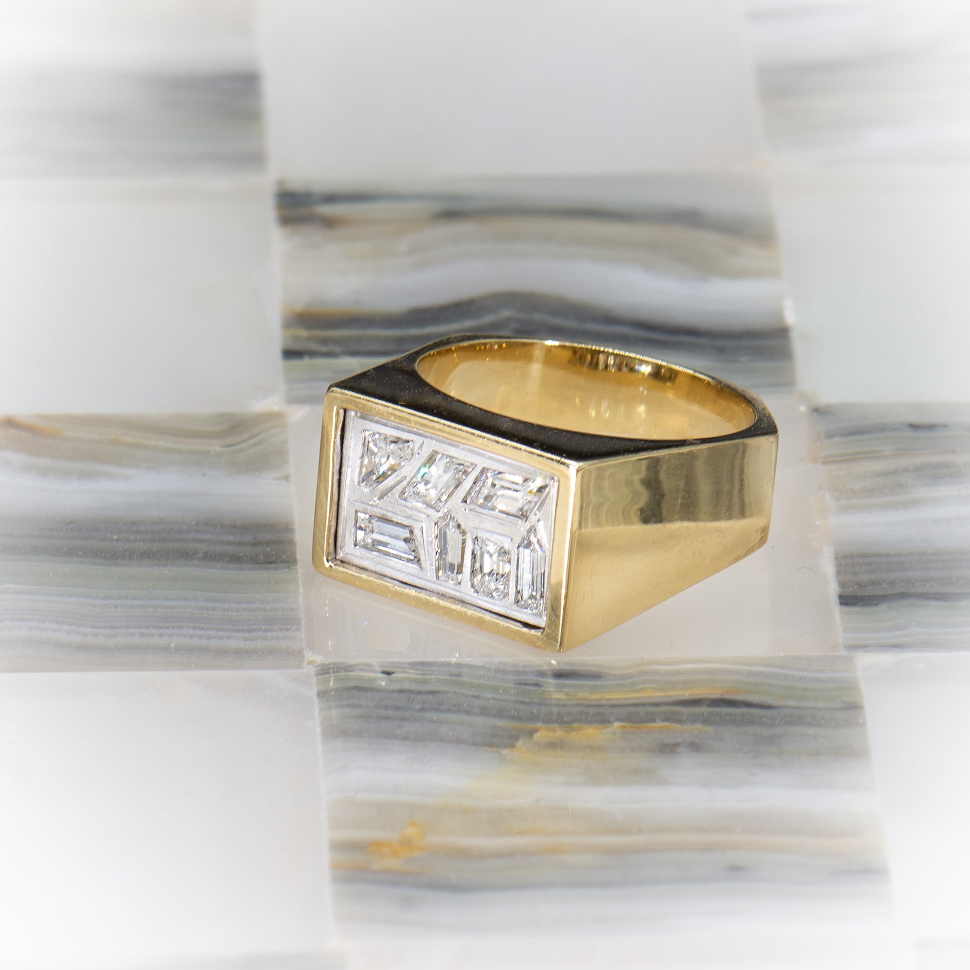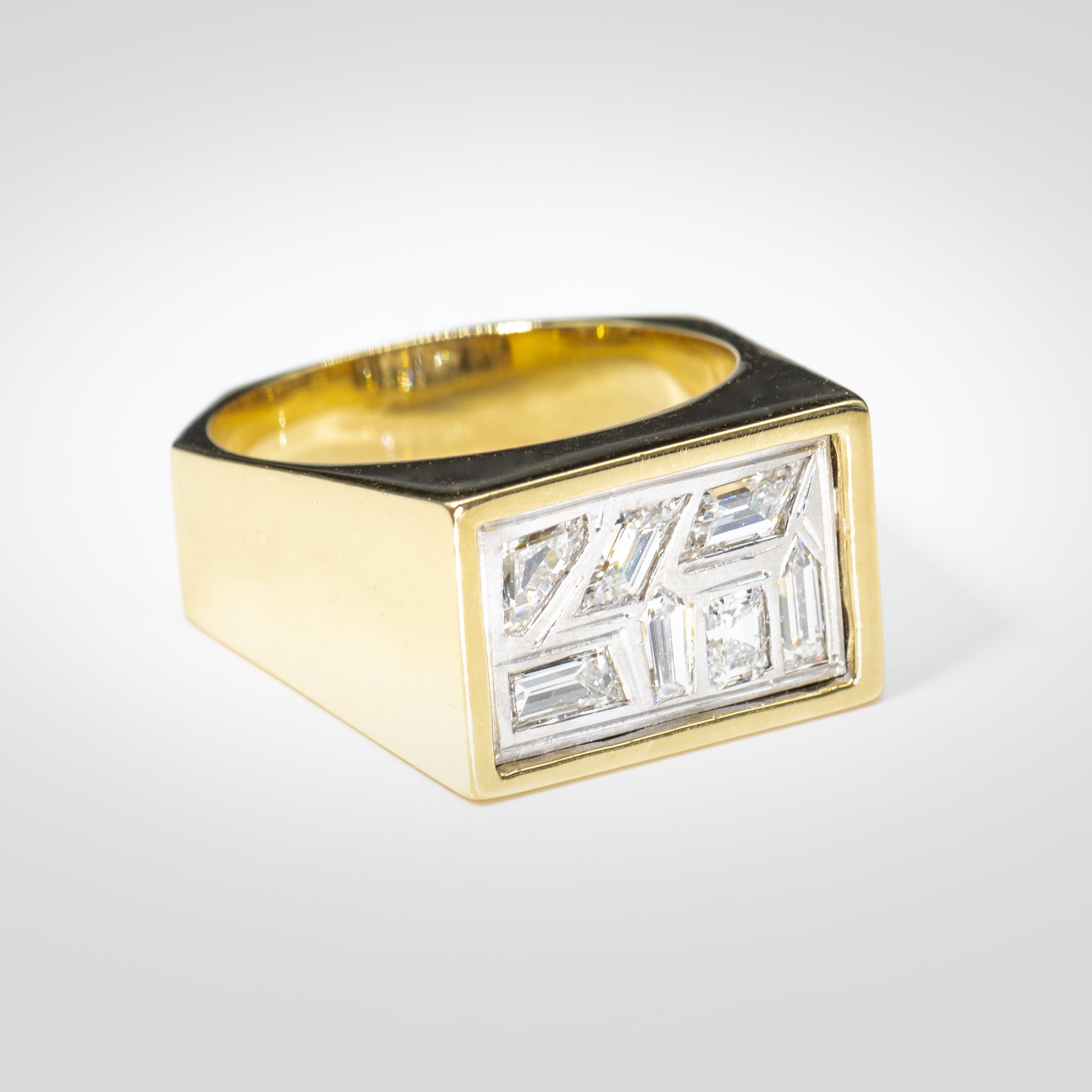 This phenomenal ring is designed with an array of Earth mined natural diamonds, totaling approximately 1.21 carats, set in solid 18k yellow gold. Strong, bold lines and unique geometric diamond shape embody the iconic style of the 1950's-60's. This rare find is in beautiful original condition, without repair or gemstone replacement.