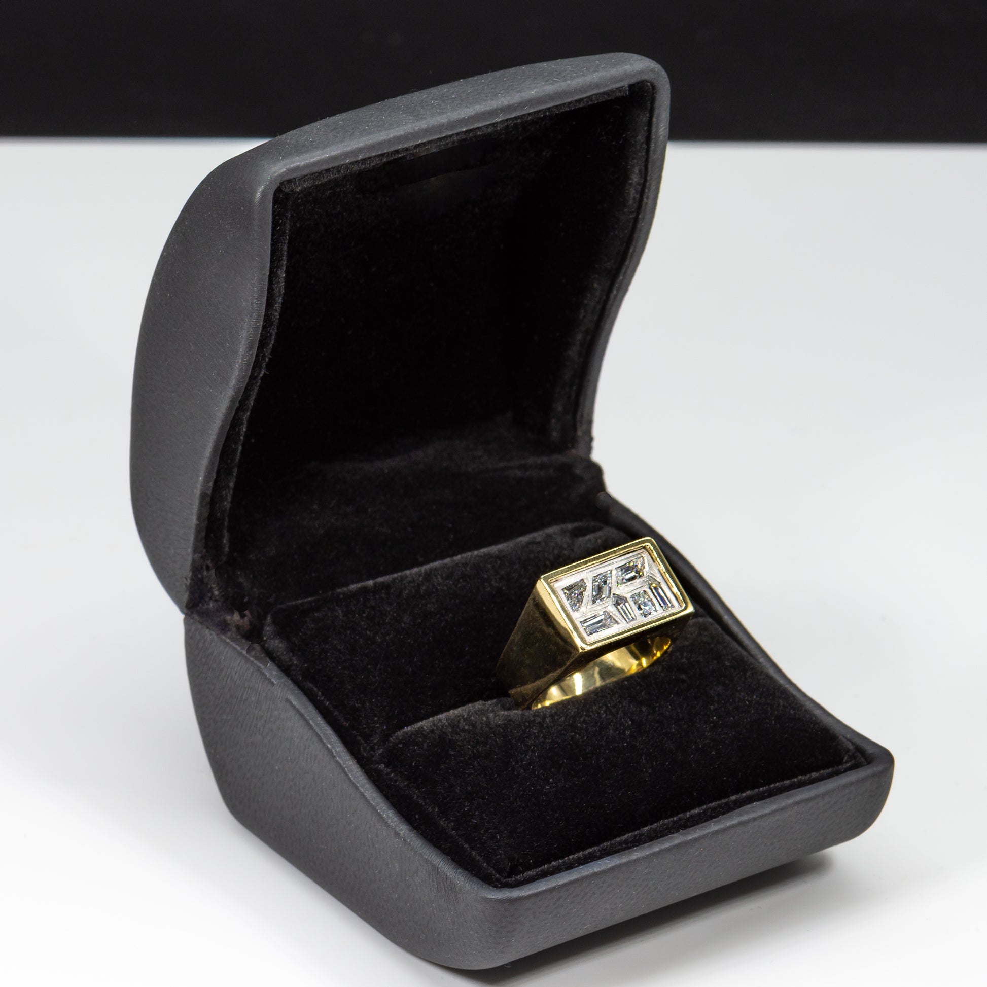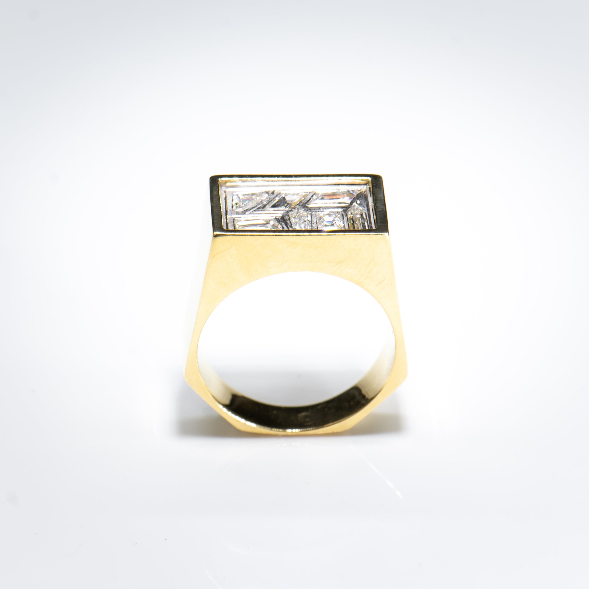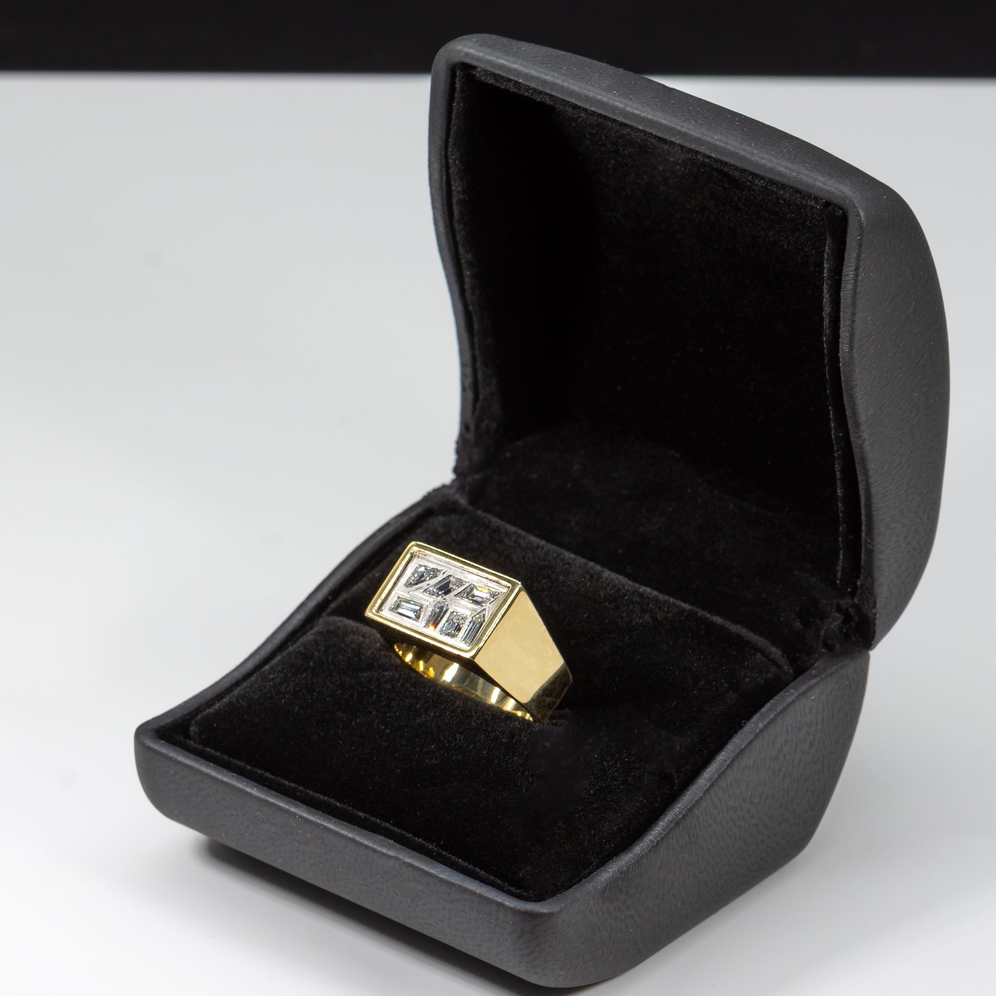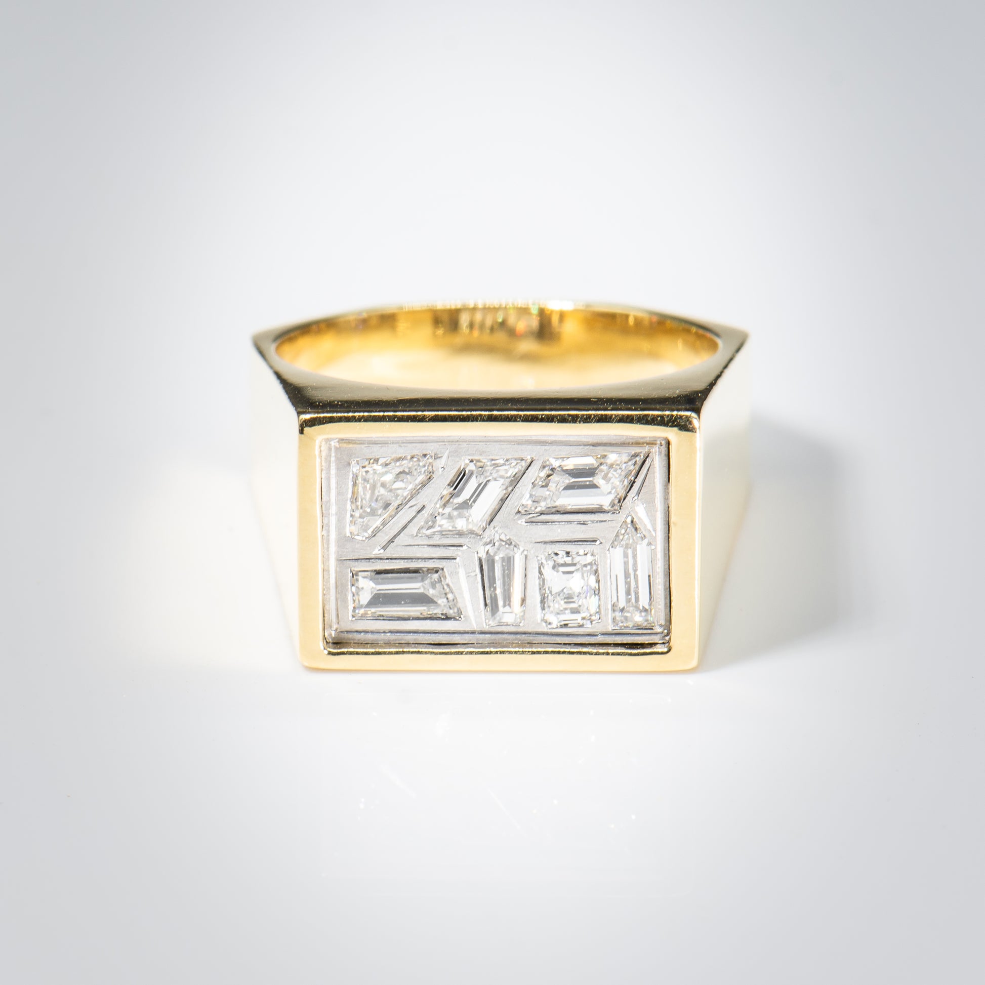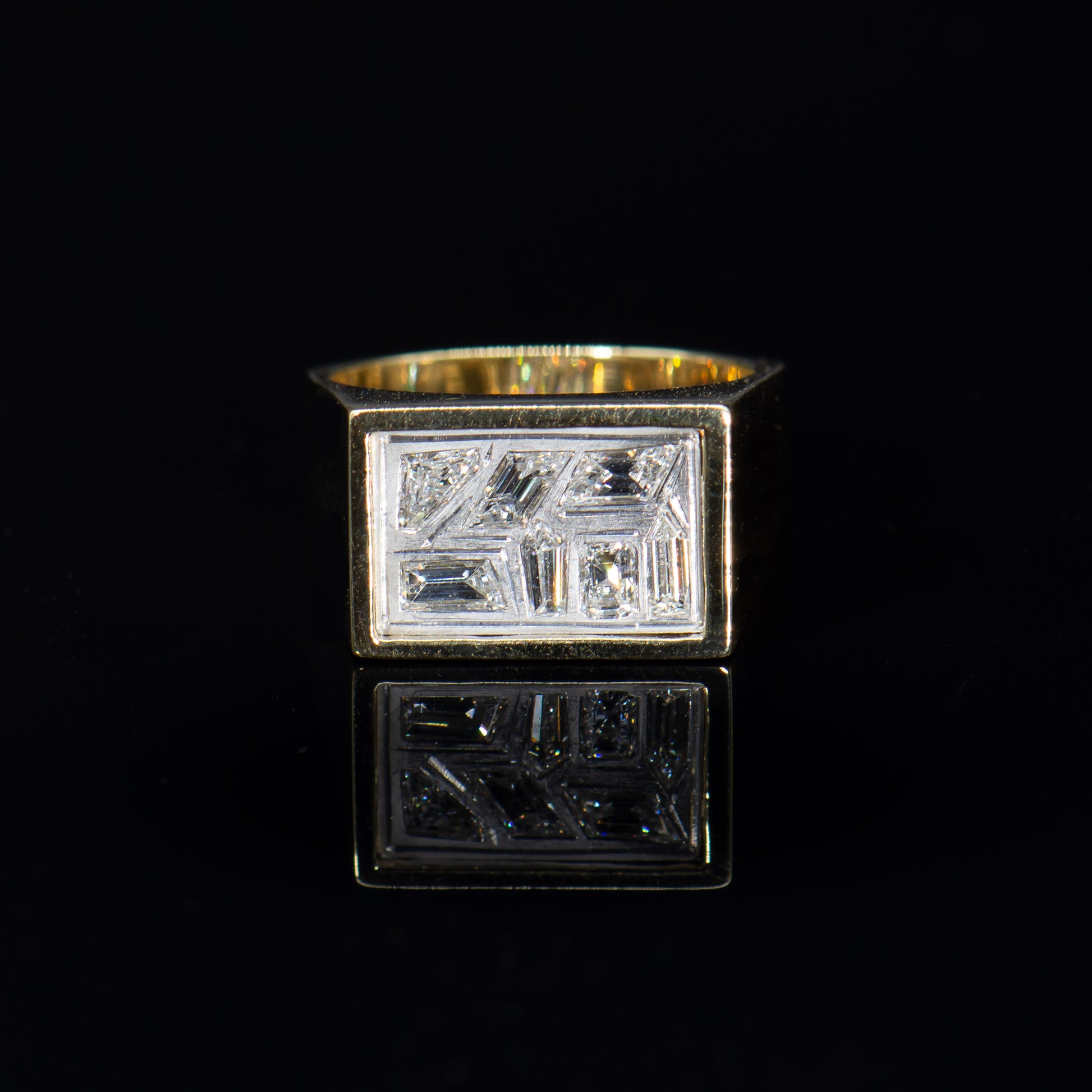 This phenomenal ring is designed with an array of Earth mined natural diamonds, totaling approximately 1.21 carats, set in solid 18k yellow gold. Strong, bold lines and unique geometric diamond shape embody the iconic style of the 1950's-60's. This rare find is in beautiful original condition, without repair or gemstone replacement.
