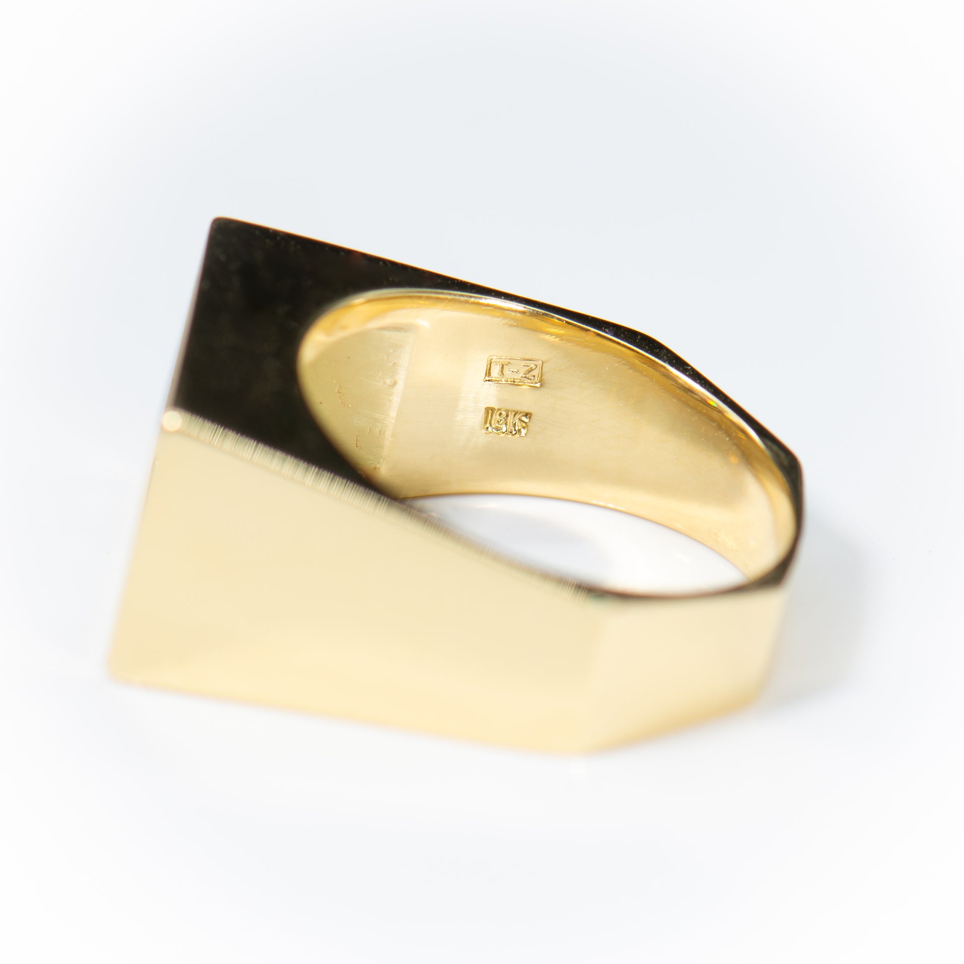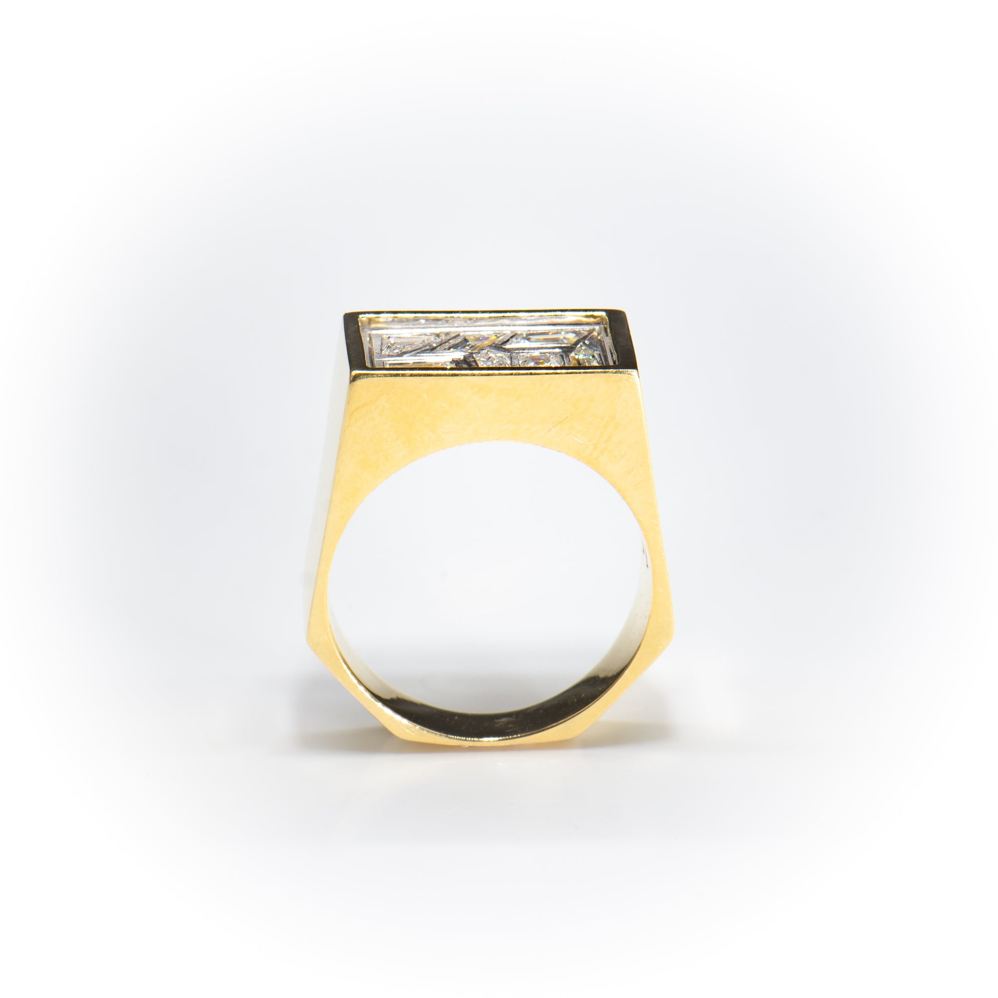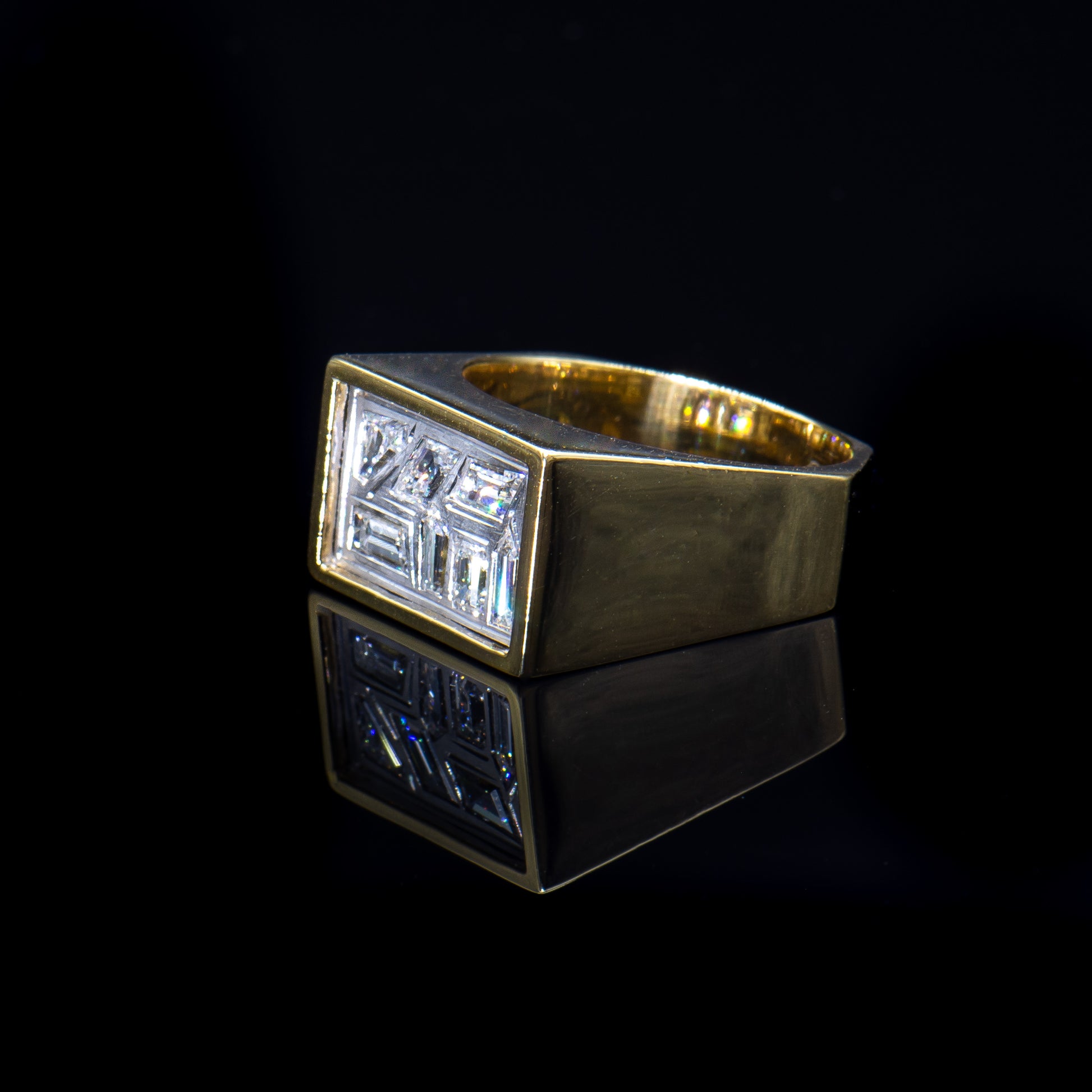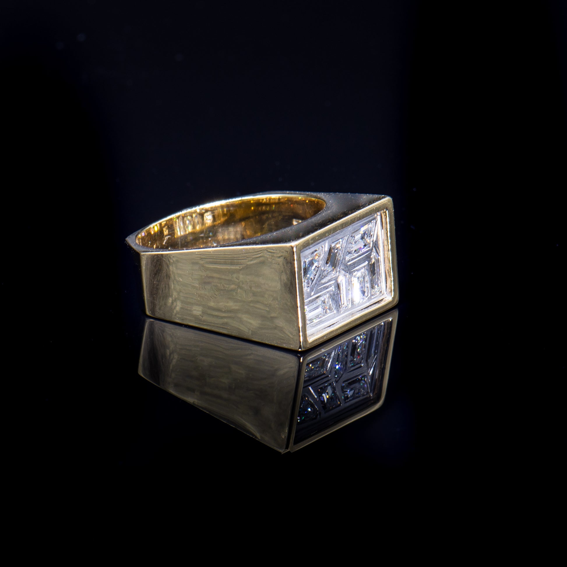 This phenomenal ring is designed with an array of Earth mined natural diamonds, totaling approximately 1.21 carats, set in solid 18k yellow gold. Strong, bold lines and unique geometric diamond shape embody the iconic style of the 1950's-60's. This rare find is in beautiful original condition, without repair or gemstone replacement.