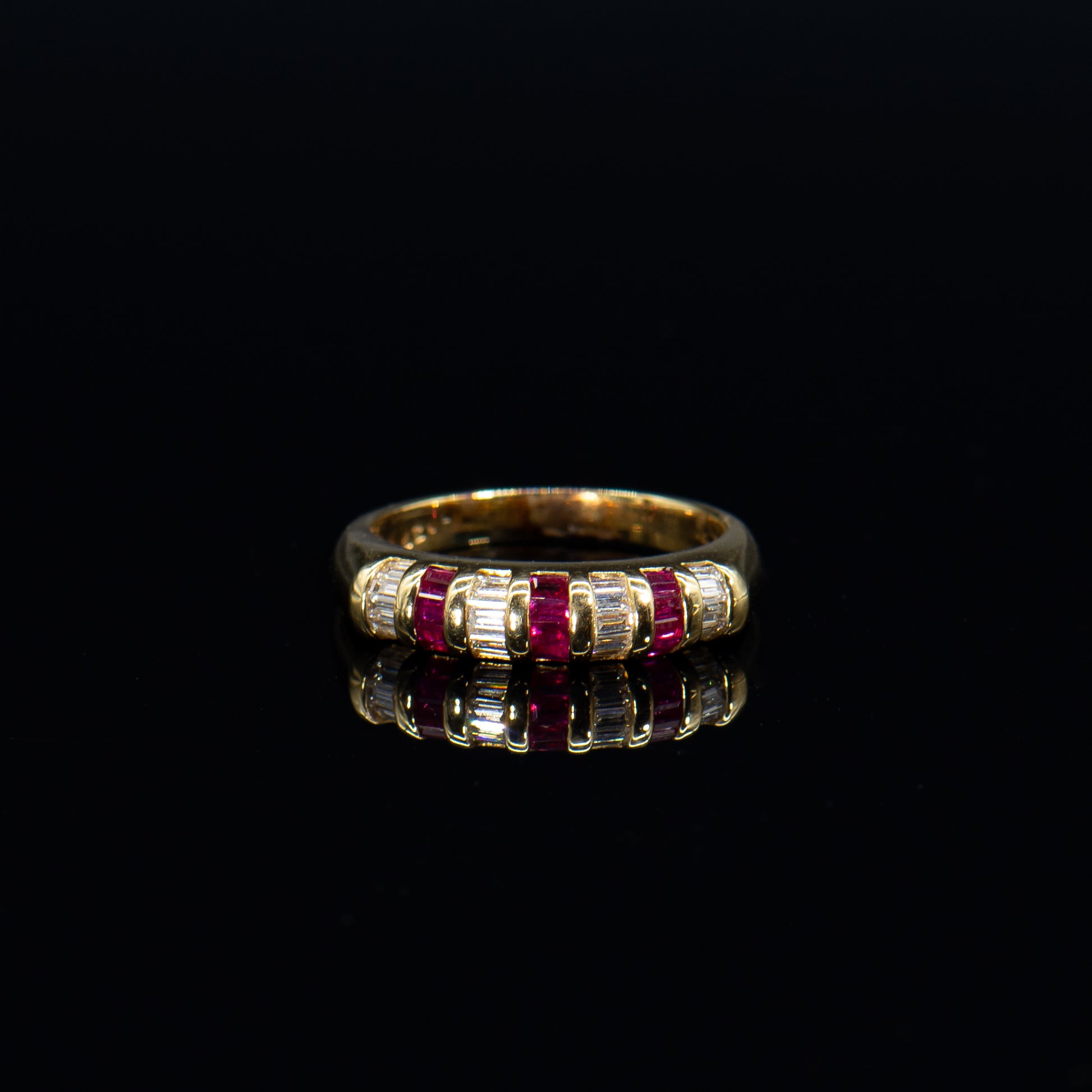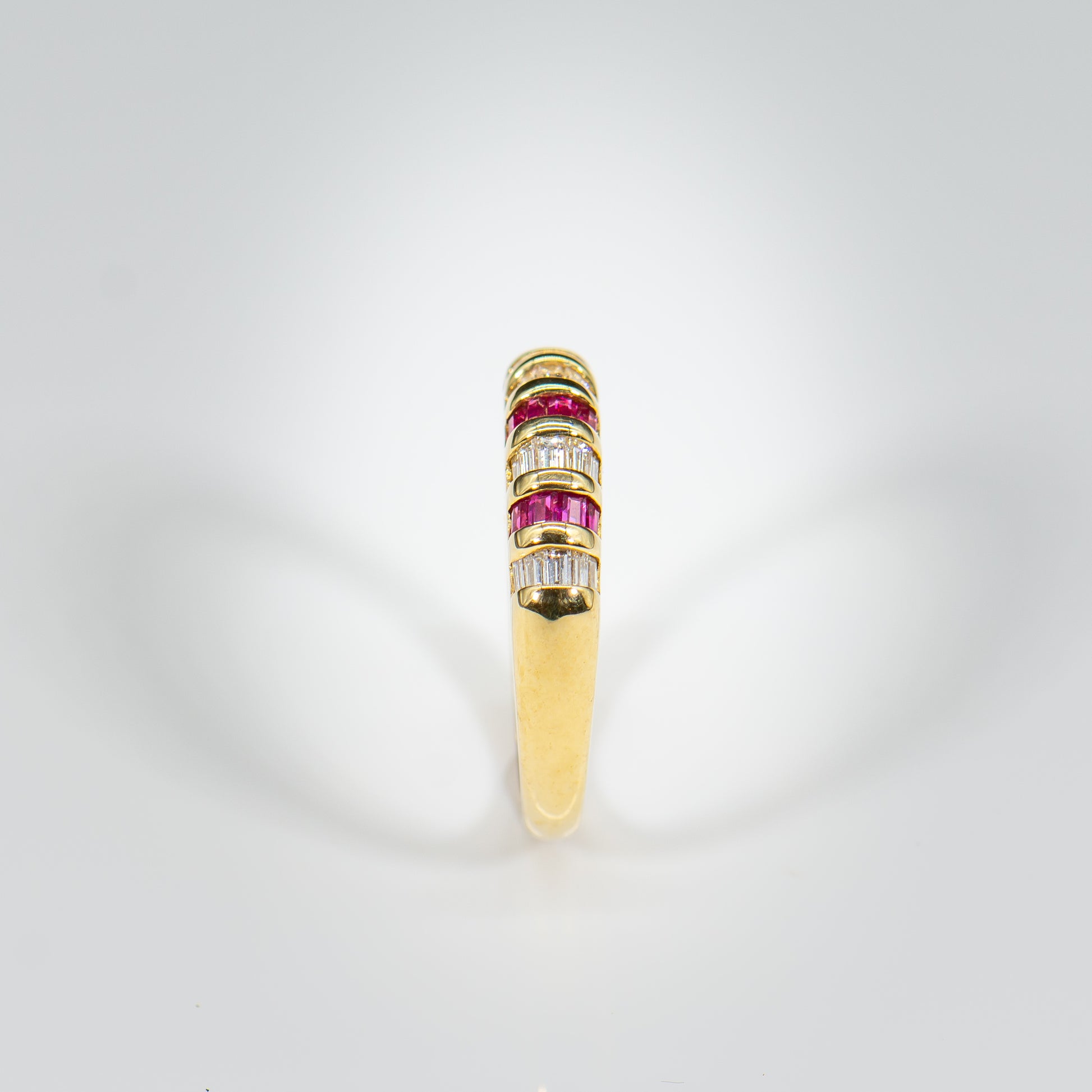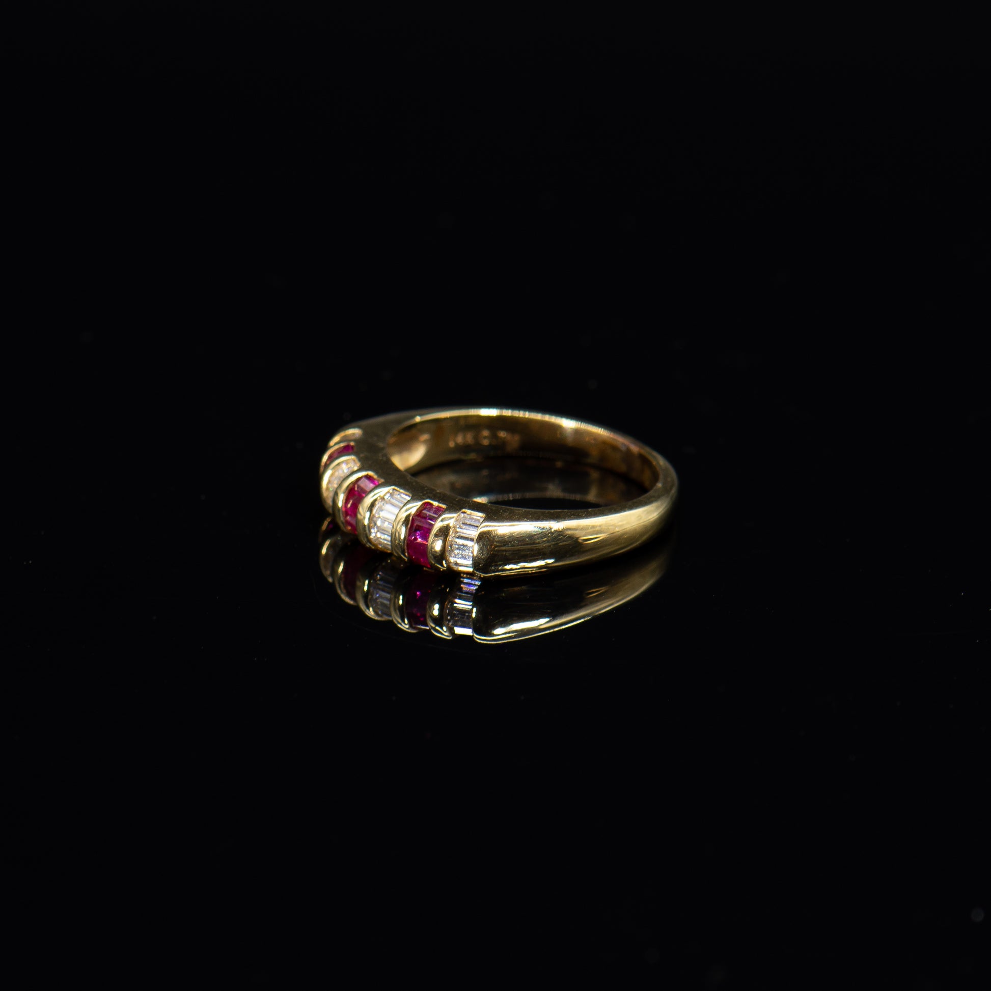 A contemporary and classic ring which features alternating rows of step cut, channel set color drenched rubies, weighing approximately 0.75 carats, alongside sparkling white diamonds weighing approximately 0.60 carats, set in 14k yellow gold.