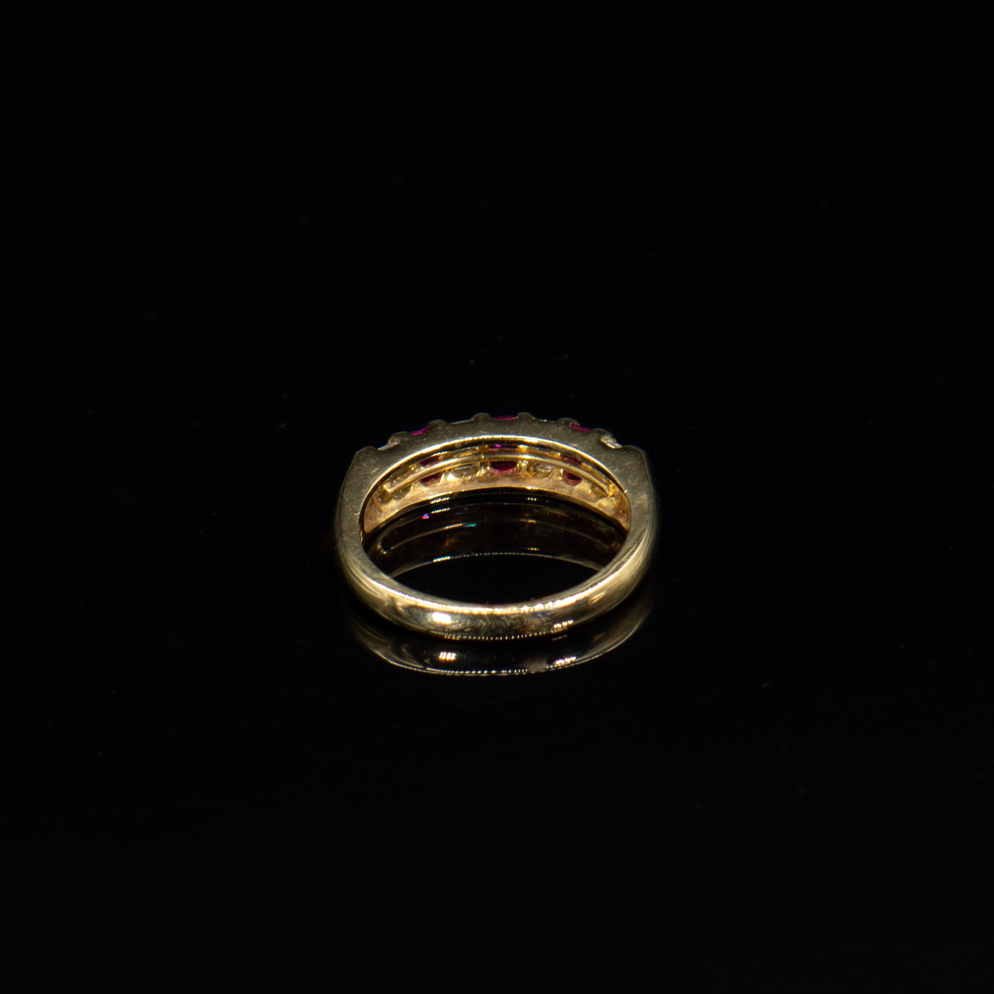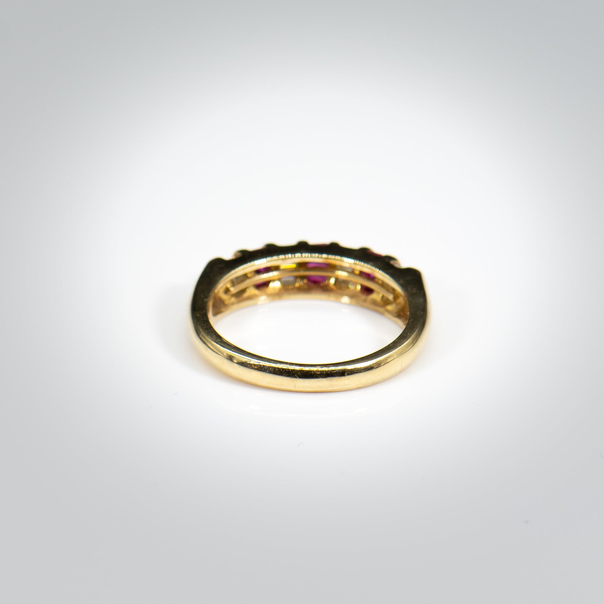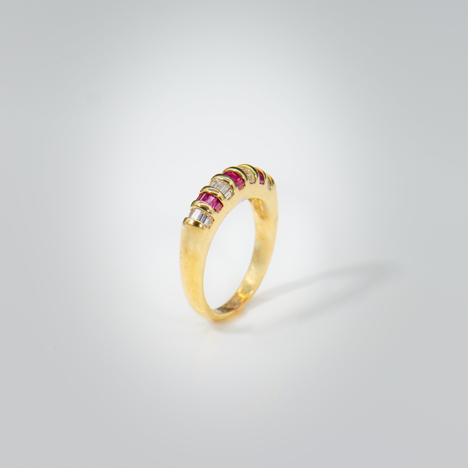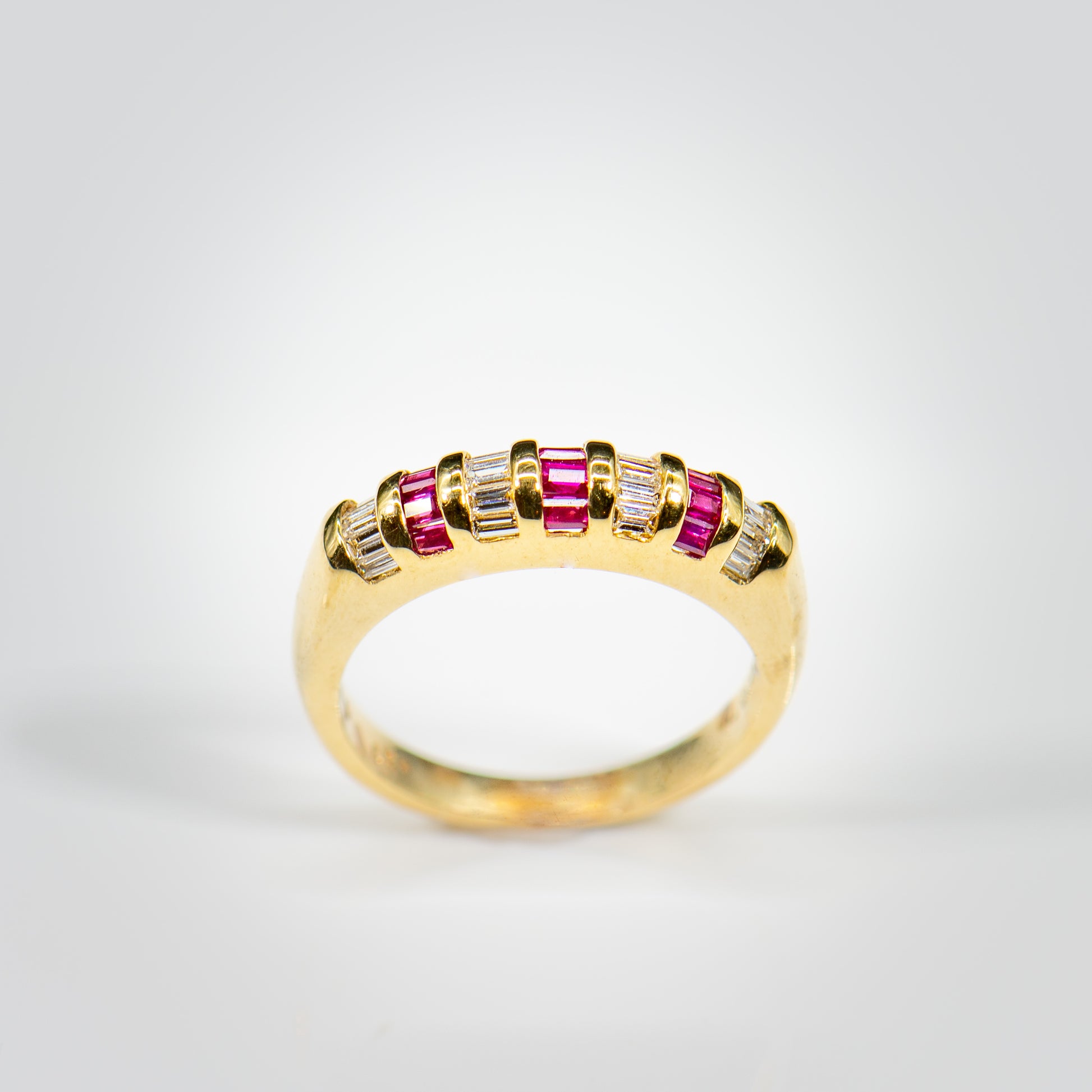A contemporary and classic ring which features alternating rows of step cut, channel set color drenched rubies, weighing approximately 0.75 carats, alongside sparkling white diamonds weighing approximately 0.60 carats, set in 14k yellow gold.