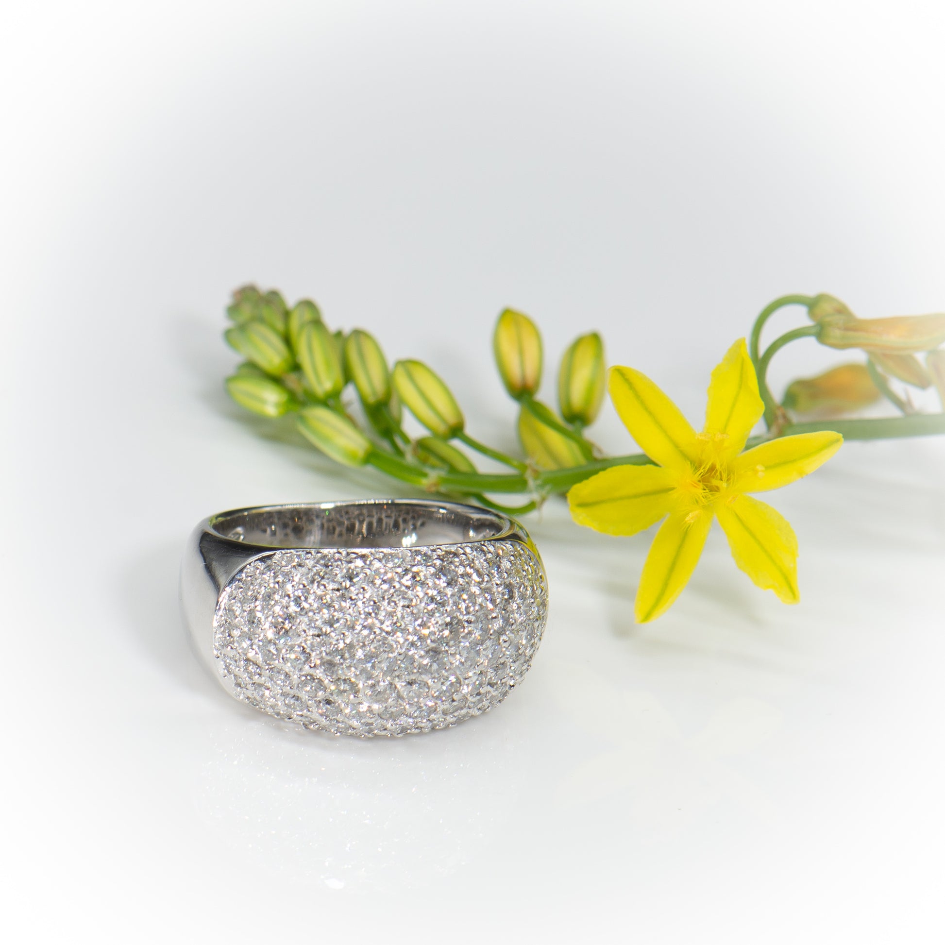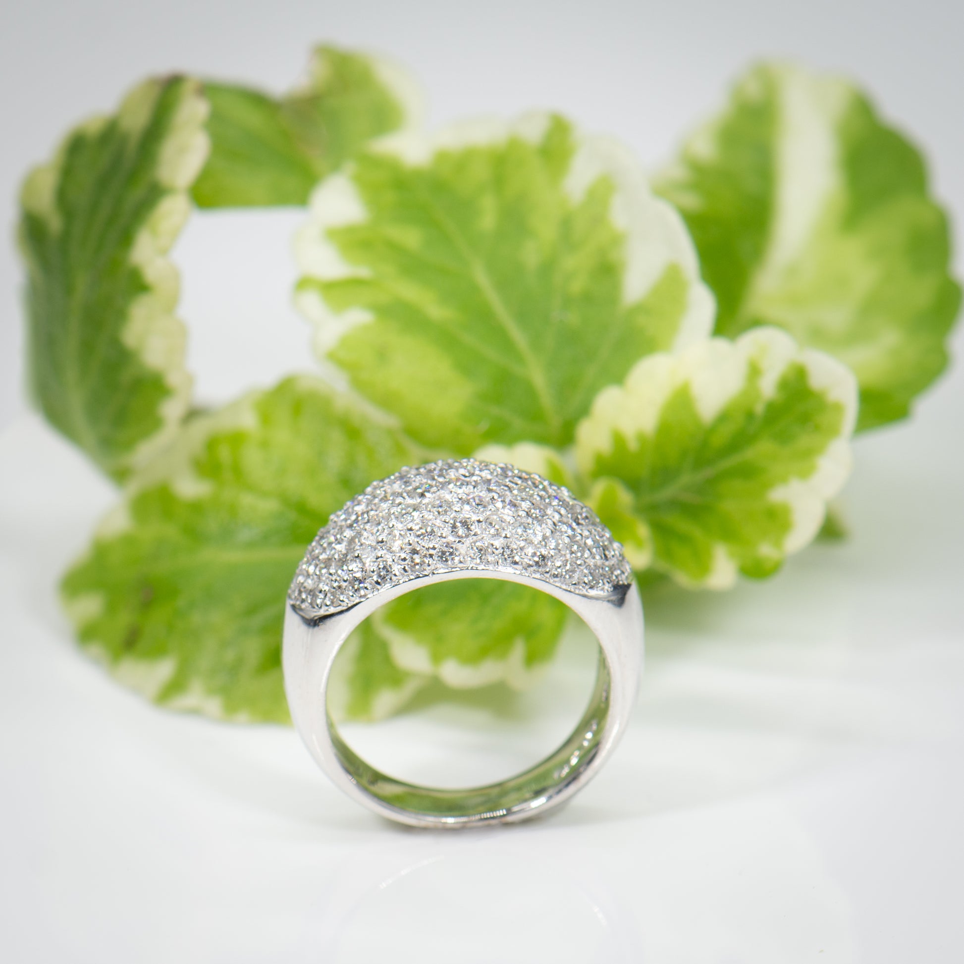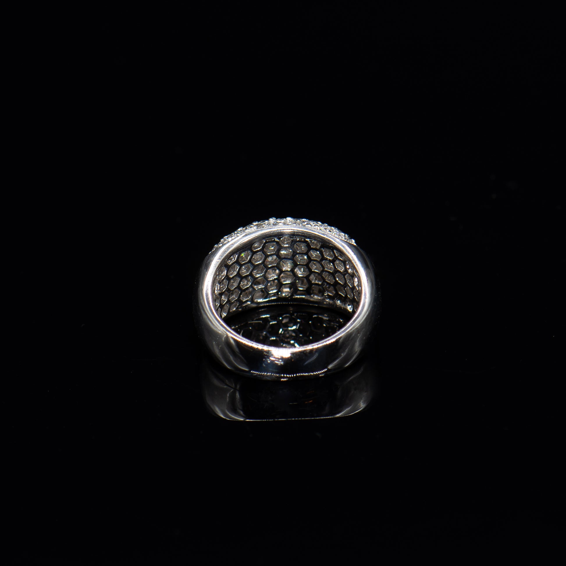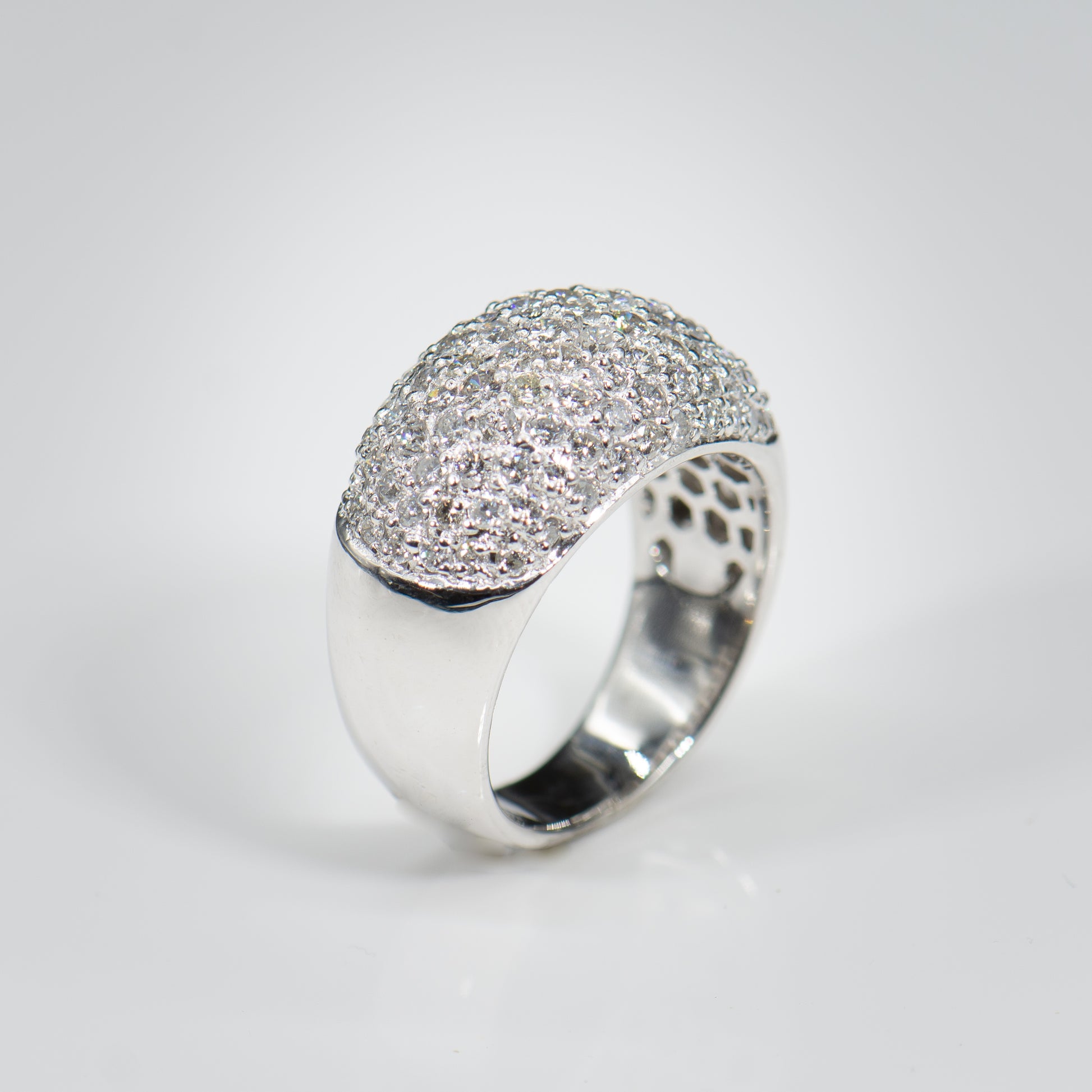 This breathtaking ring is comprised of row upon row of full-cut round white diamonds in high polish solid 18k white gold.