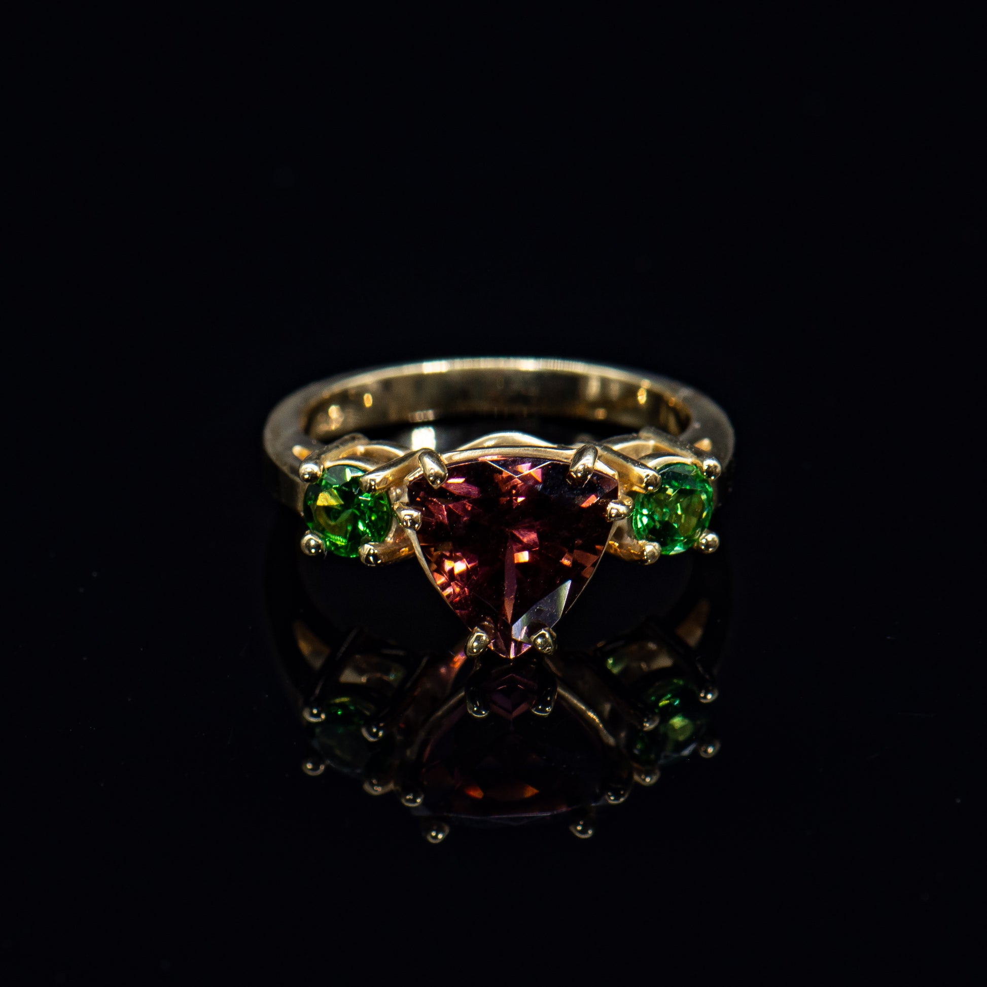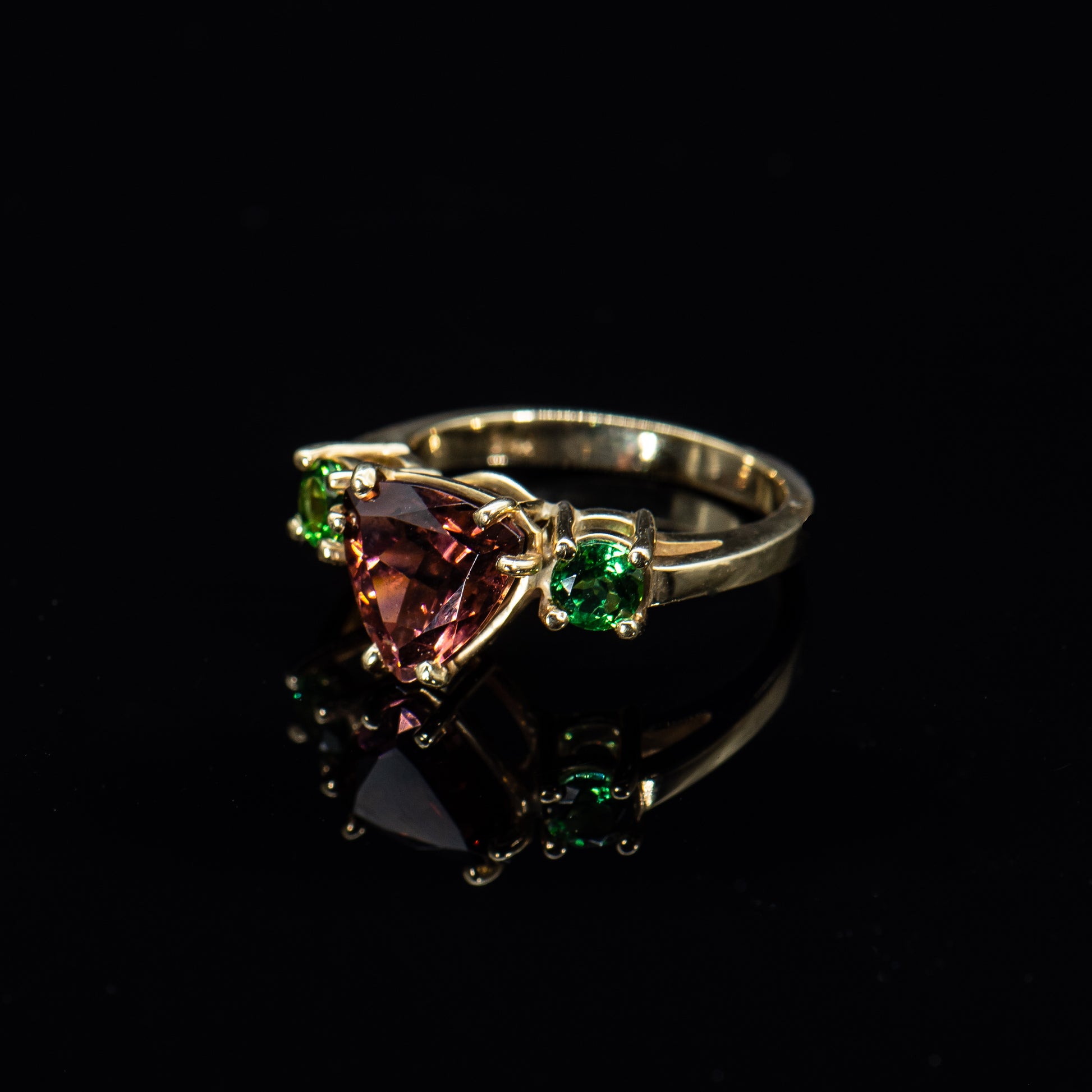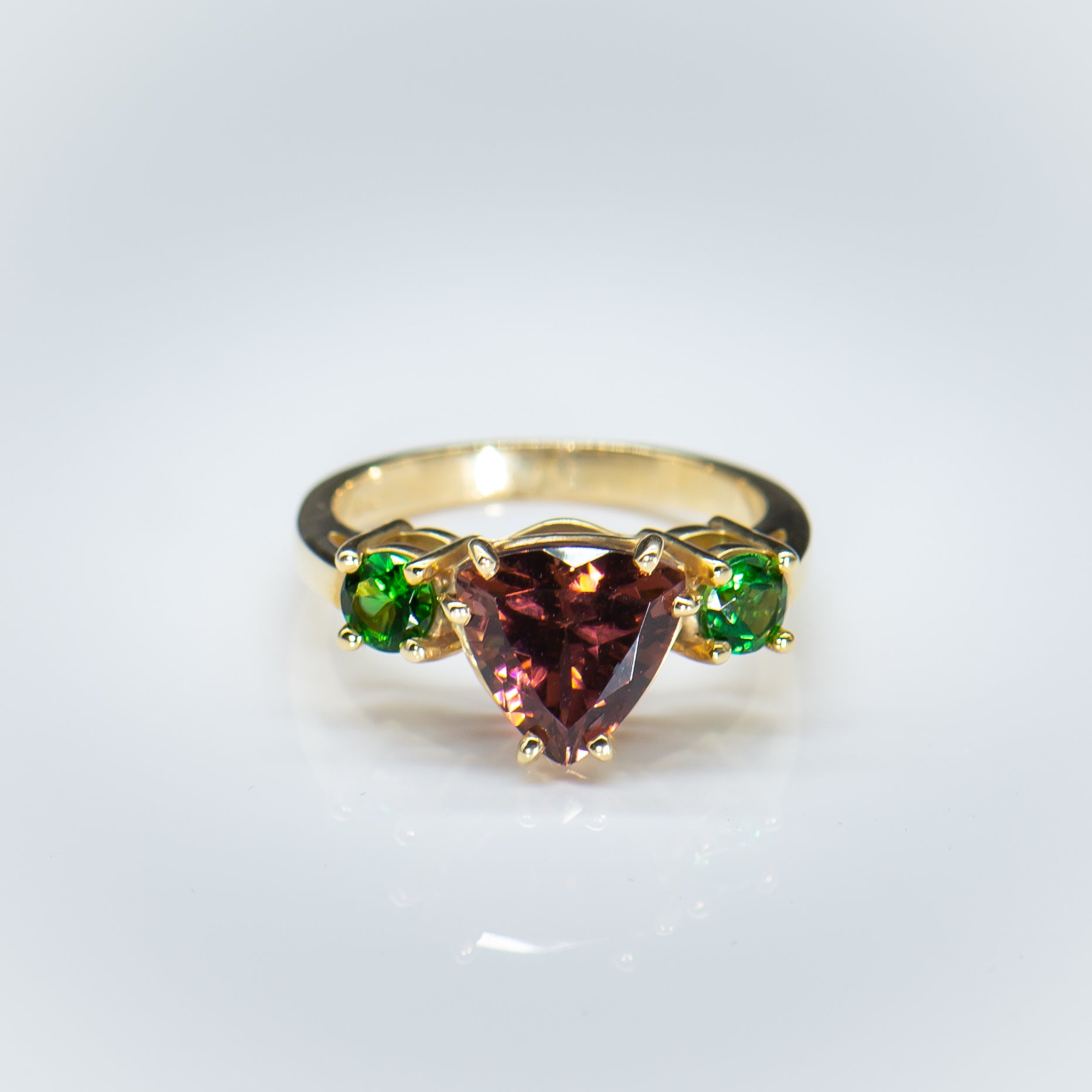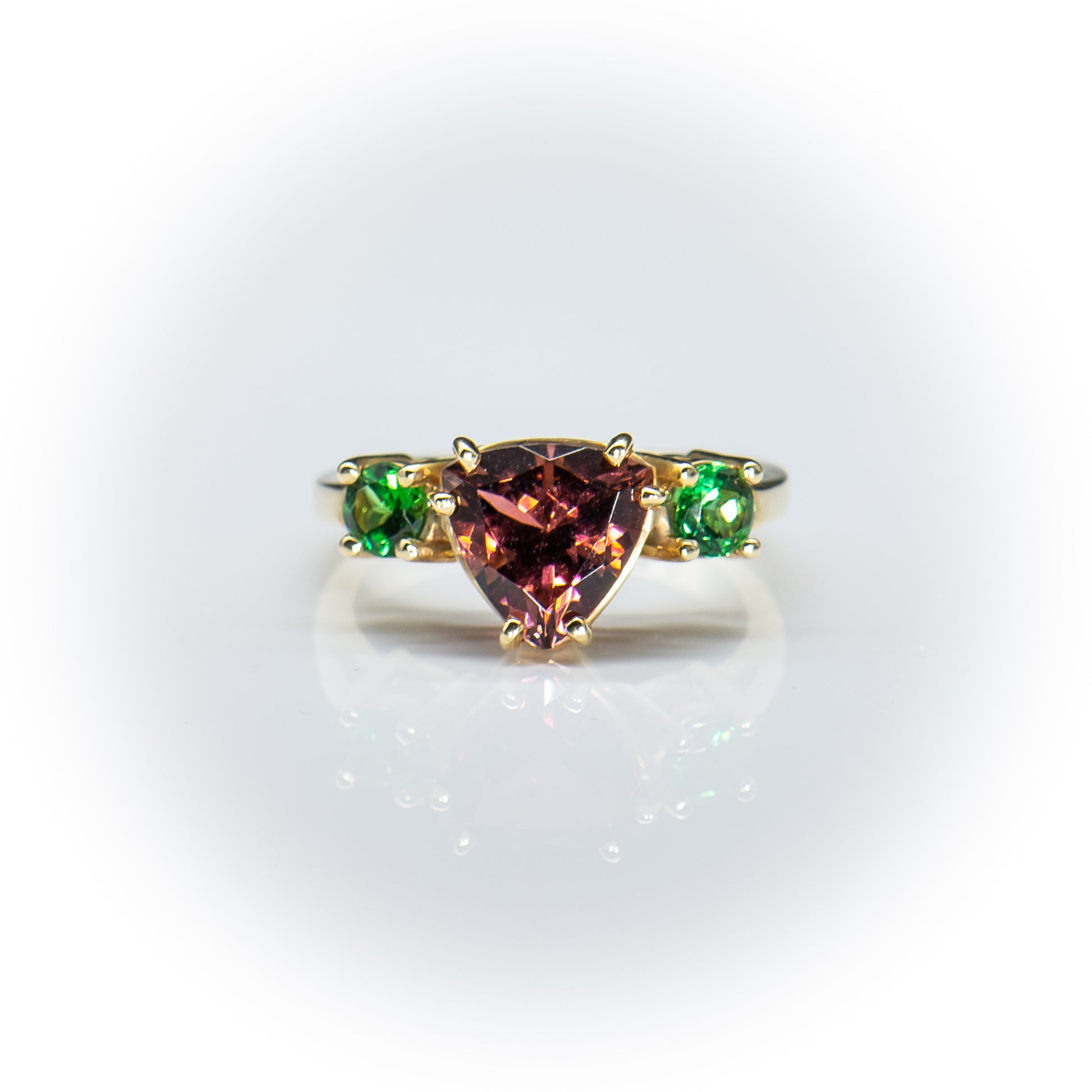 This unique tourmaline ring is mesmerizing. Gleaming yellow gold is the perfect setting for the centered trillion cut cognac brown tourmaline, bordered on either side with a matched pair of vivid green tourmaline gemstones.