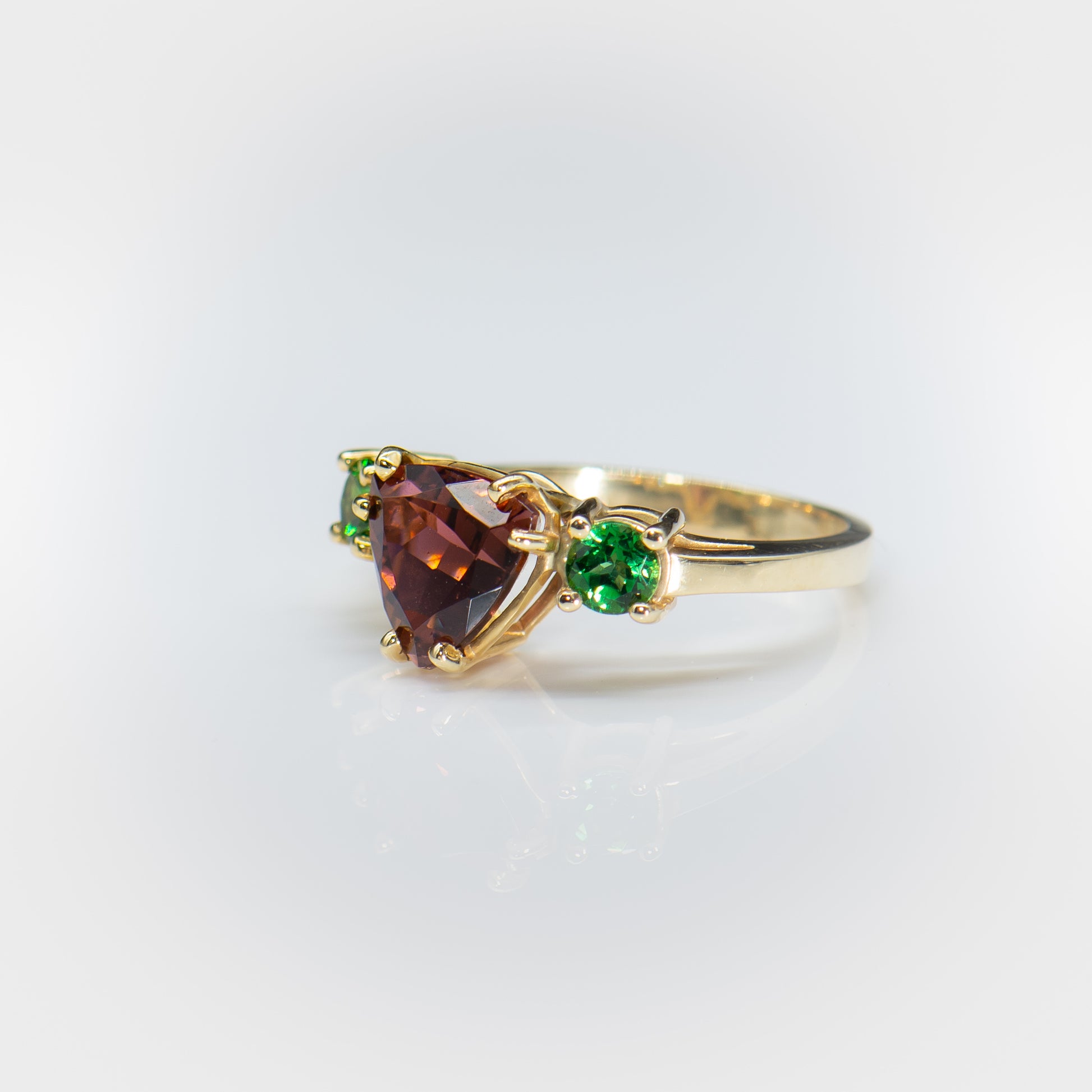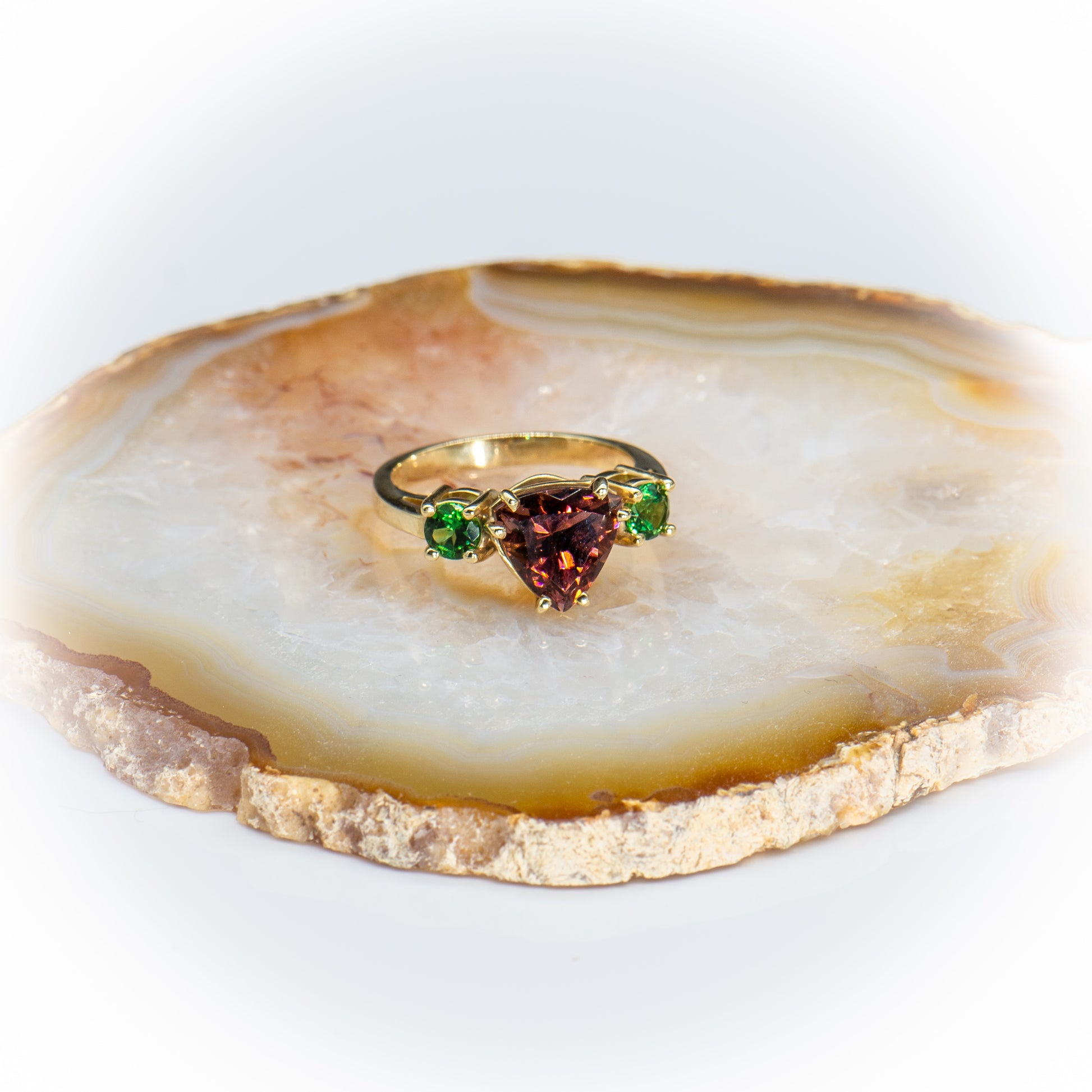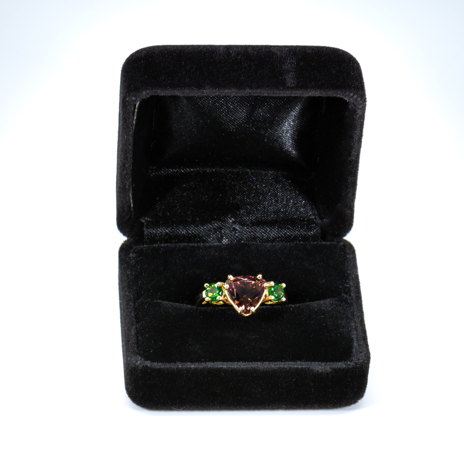 This unique tourmaline ring is mesmerizing. Gleaming yellow gold is the perfect setting for the centered trillion cut cognac brown tourmaline, bordered on either side with a matched pair of vivid green tourmaline gemstones.