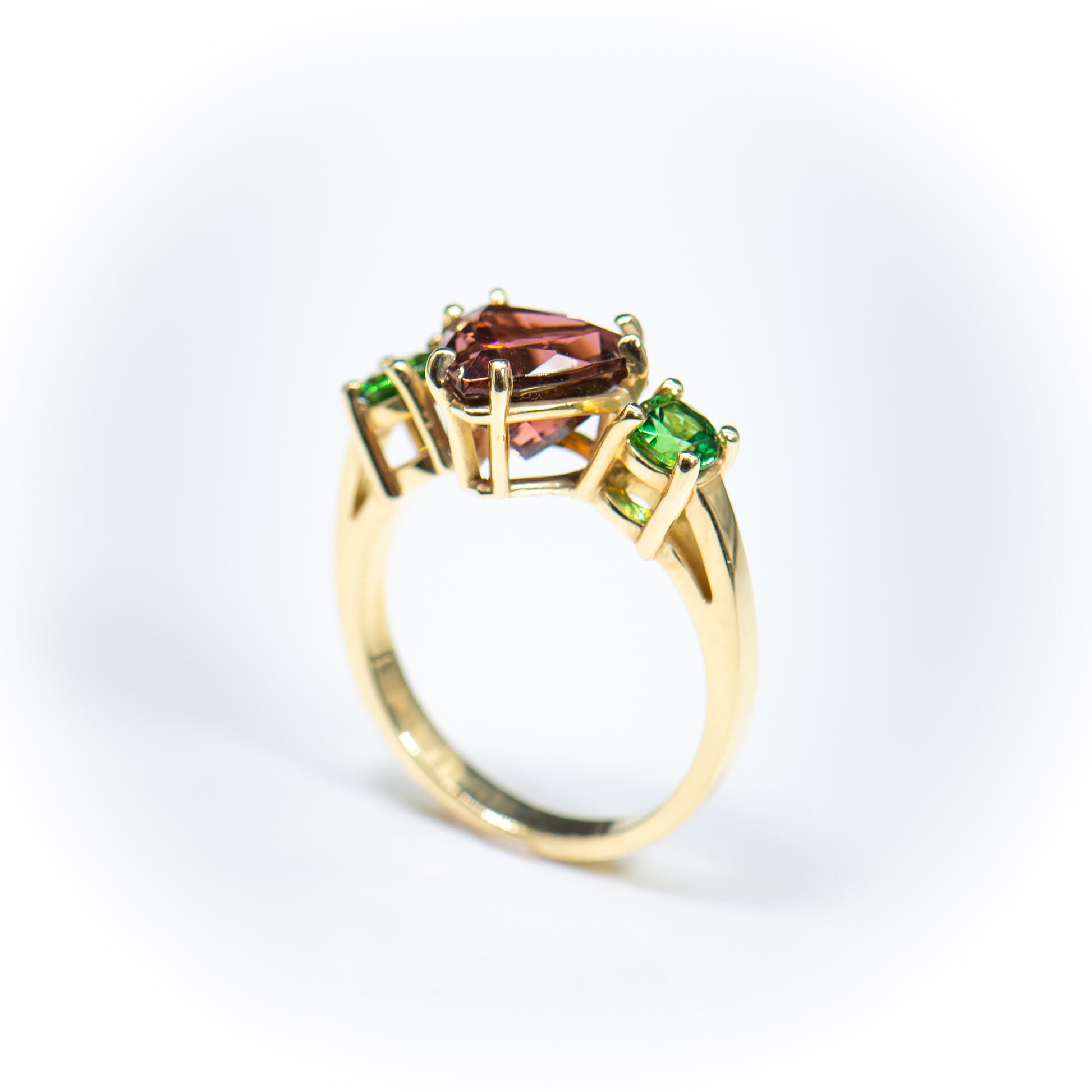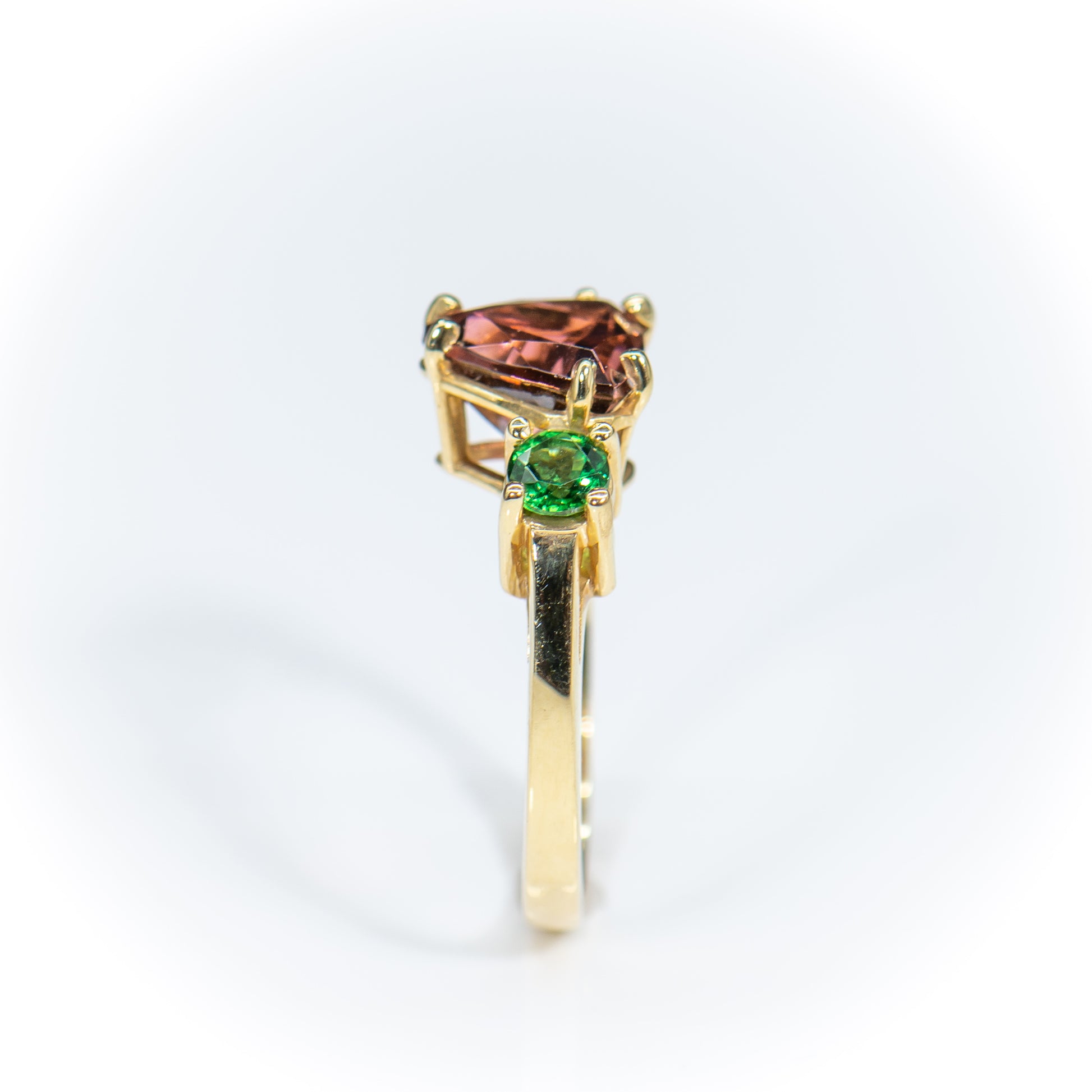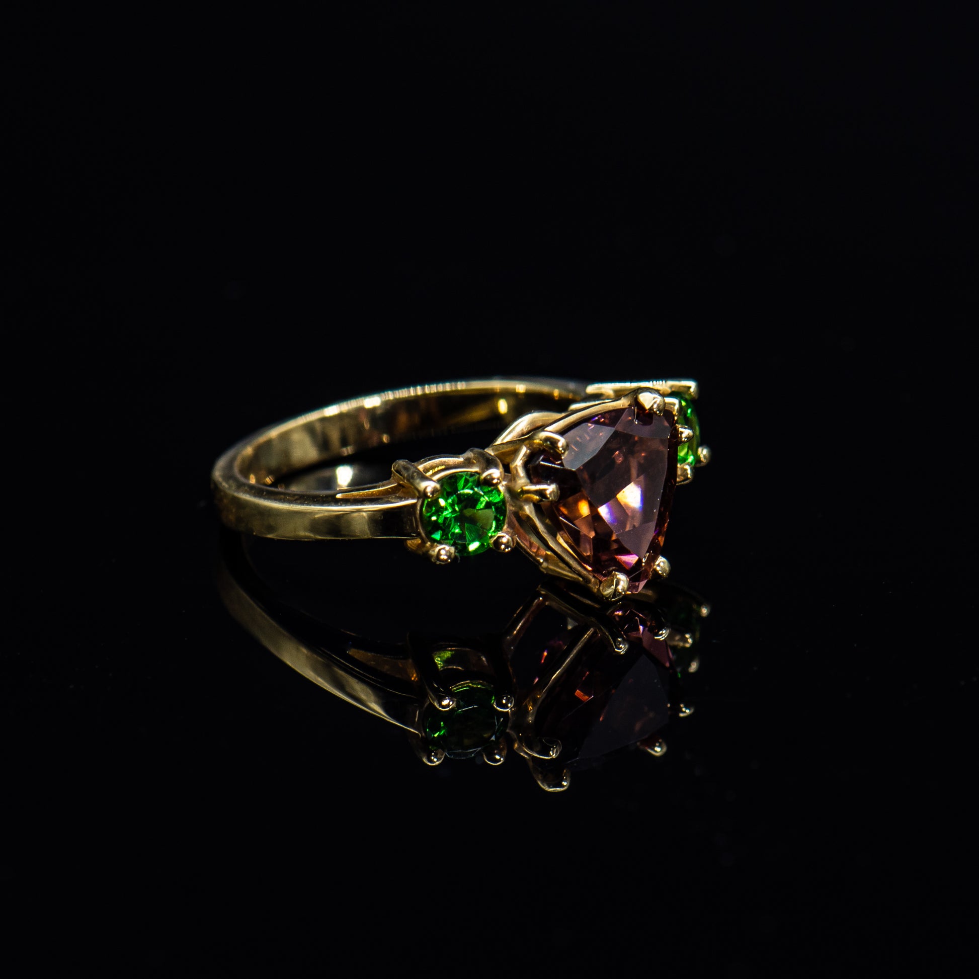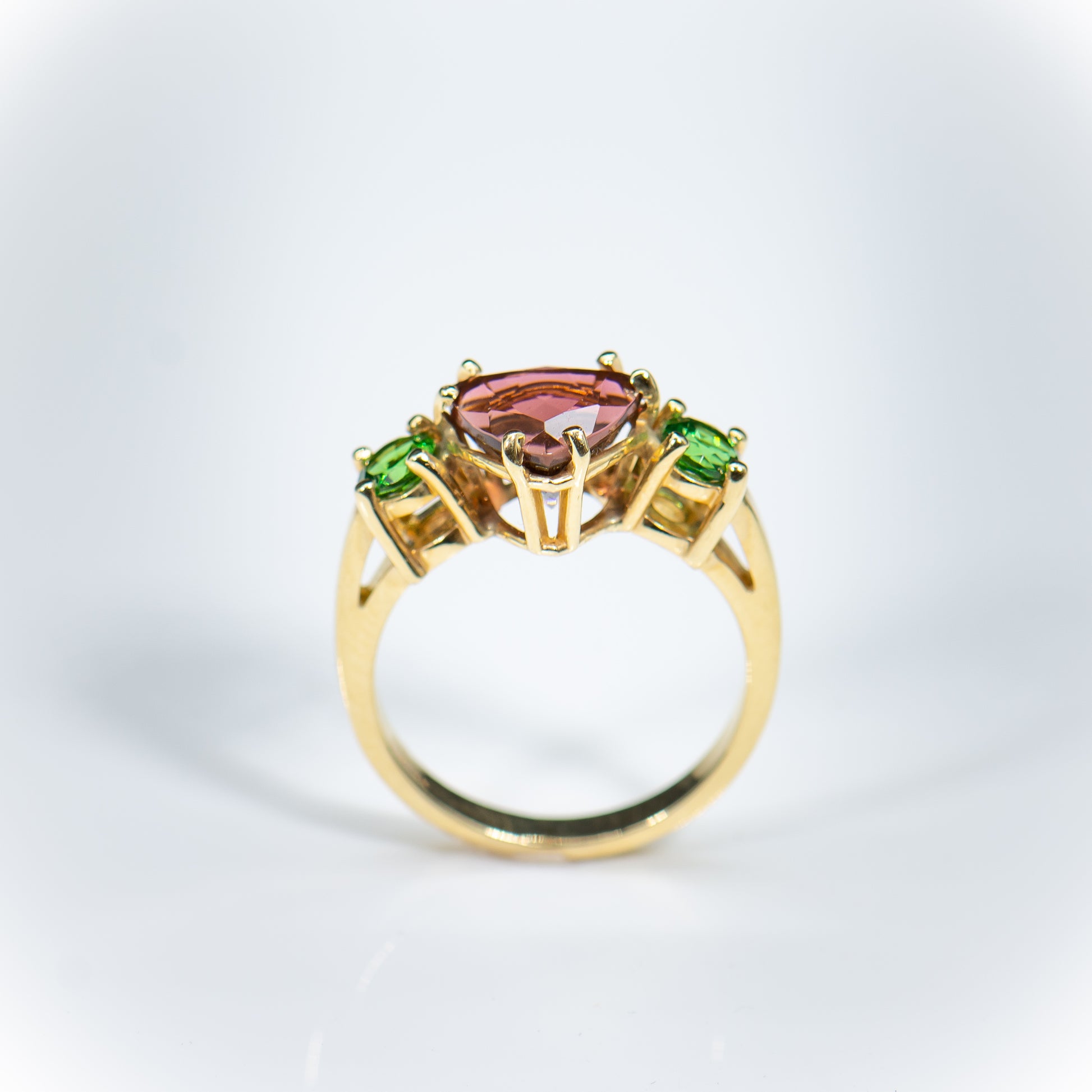 This unique tourmaline ring is mesmerizing. Gleaming yellow gold is the perfect setting for the centered trillion cut cognac brown tourmaline, bordered on either side with a matched pair of vivid green tourmaline gemstones.