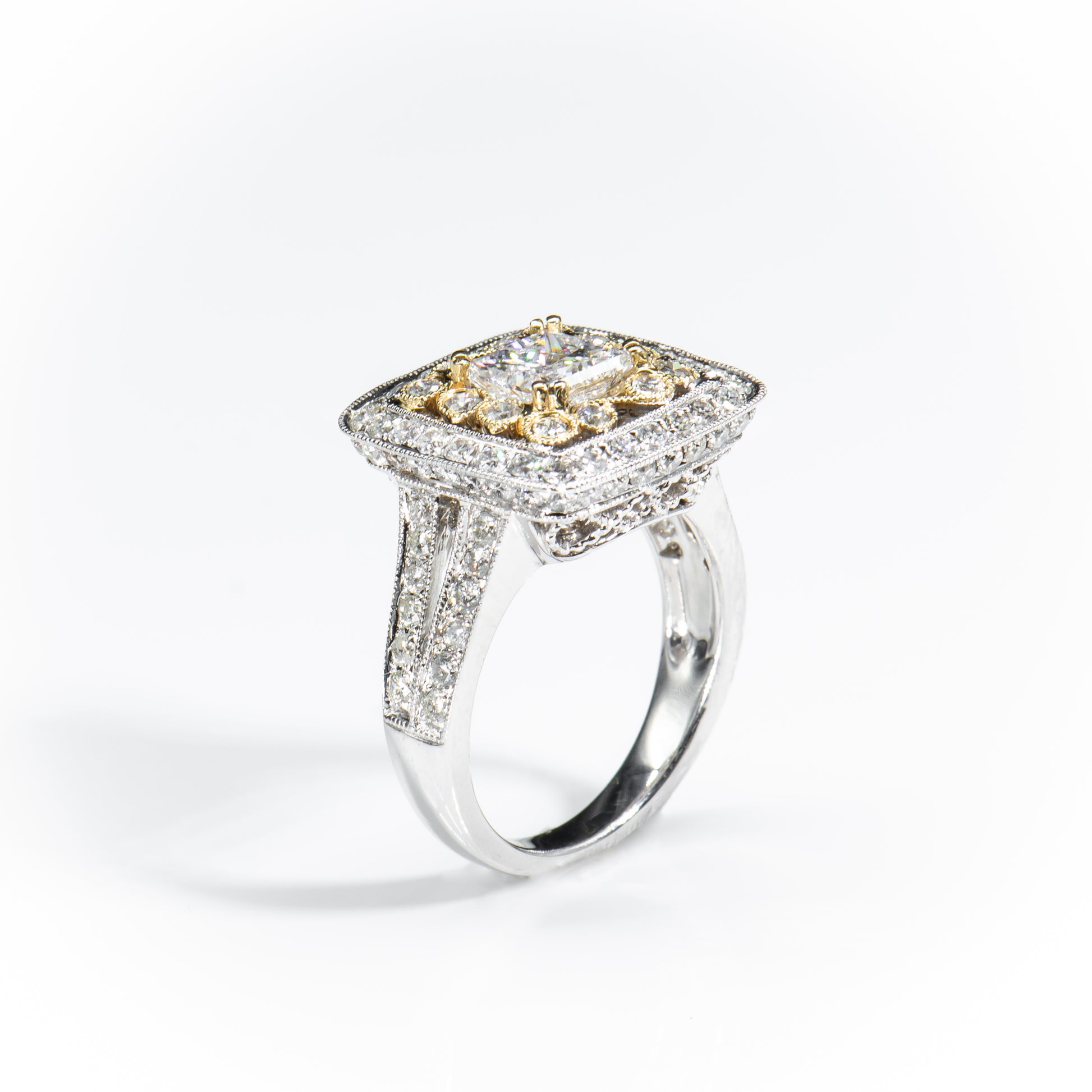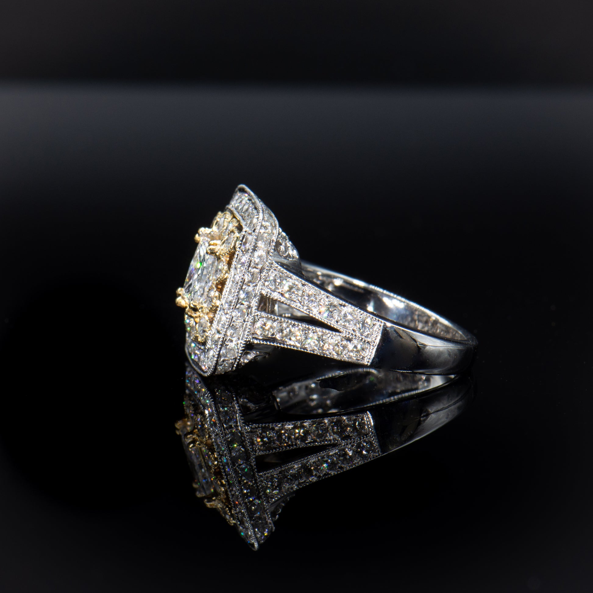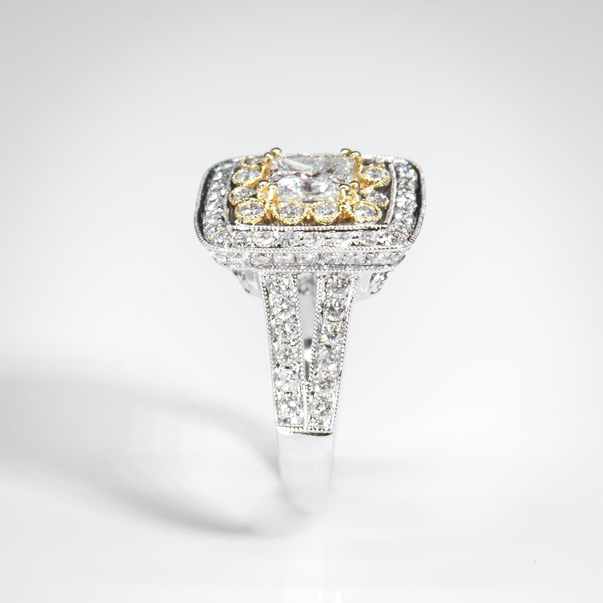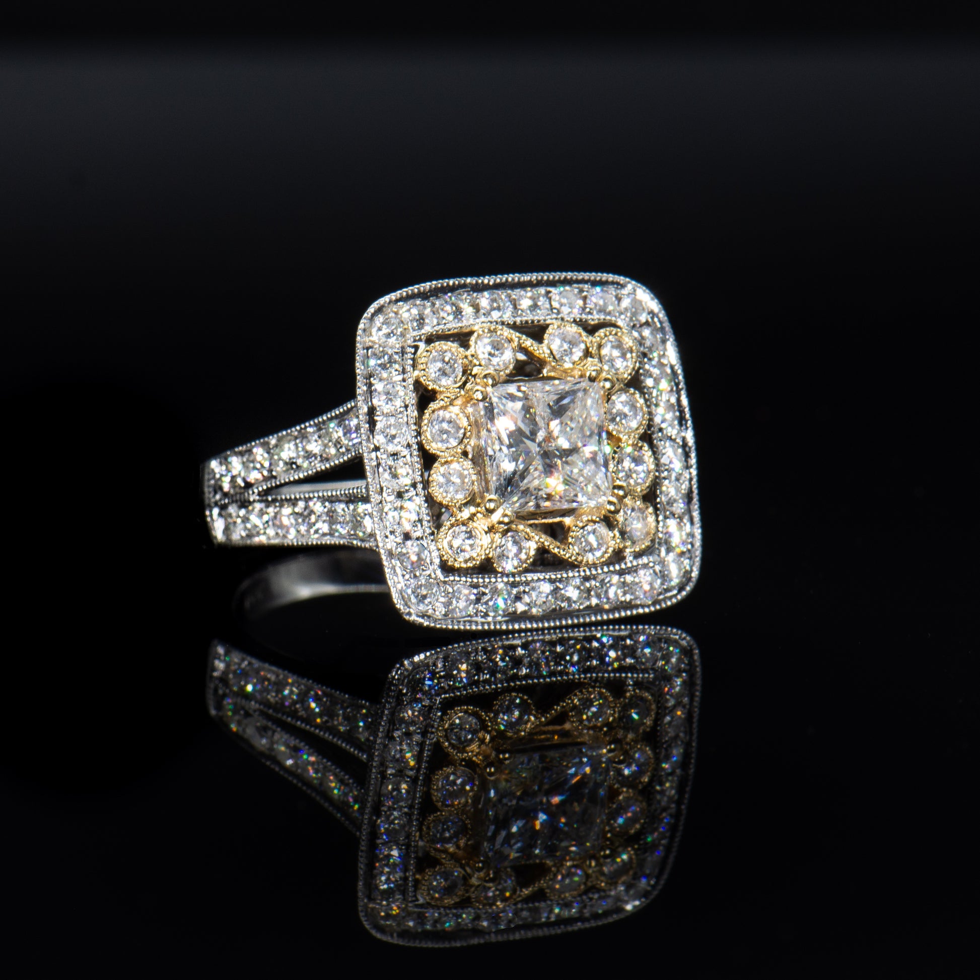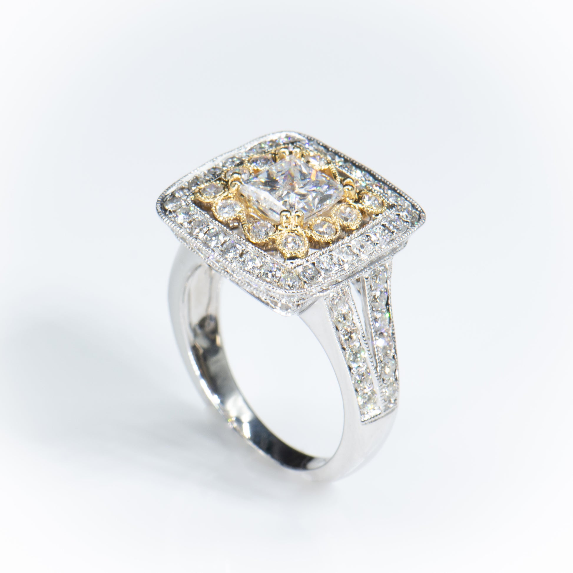 The design features a centered princess shape Earth mined natural diamond, weighing approximately 1.00 carat, bordered by graceful yellow gold swirls, each set with a full cut round diamond. This is surrounded by a glittering diamond halo. The split shank (band) twinkles with additional diamond accents.