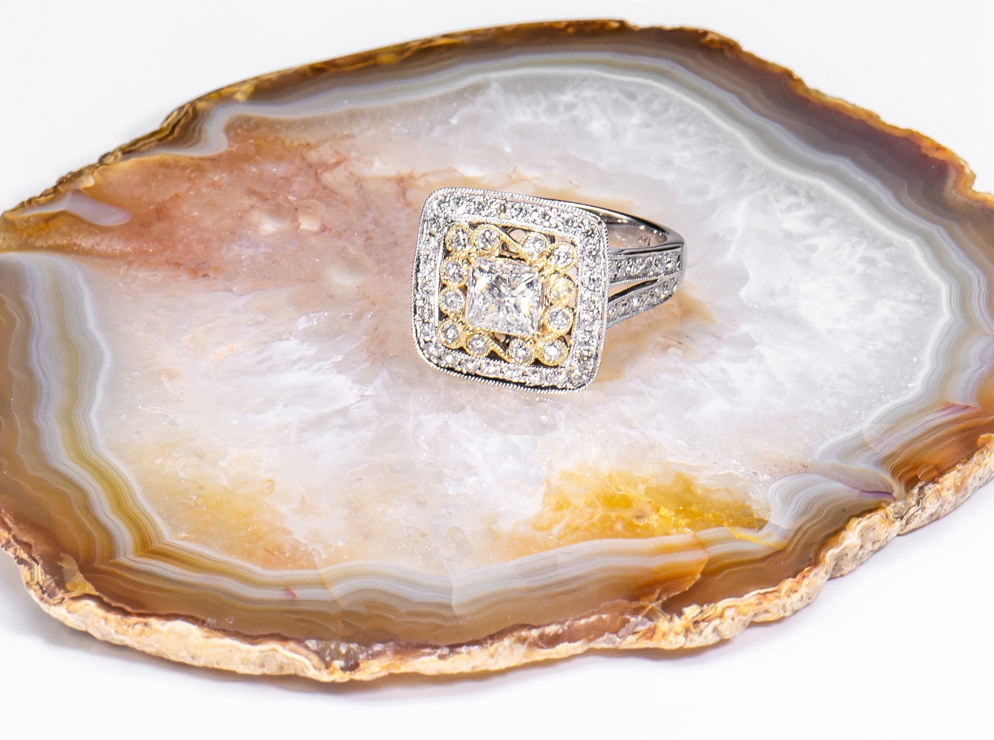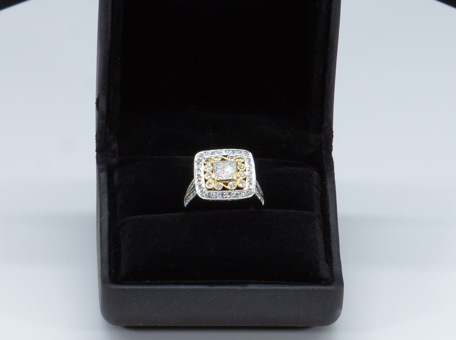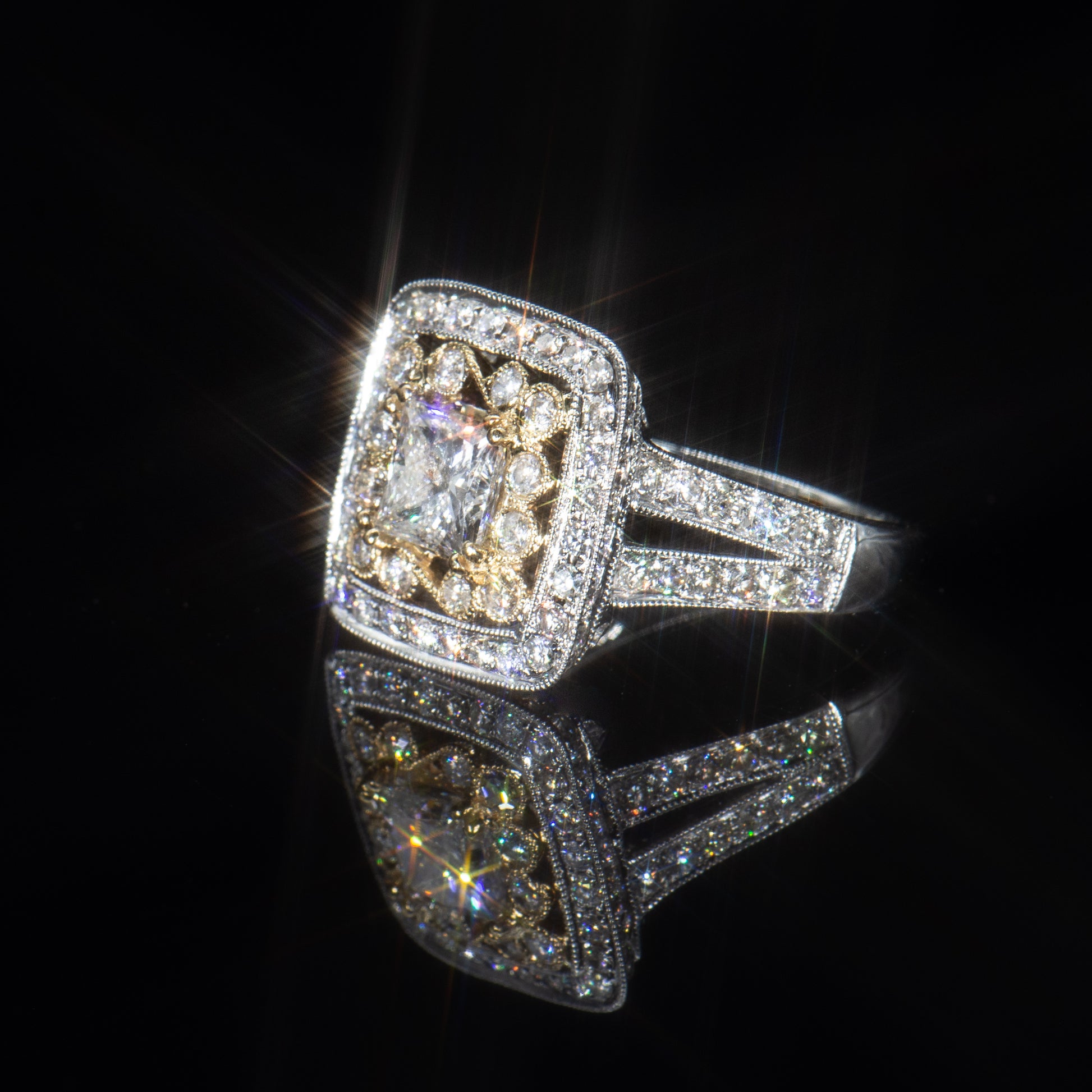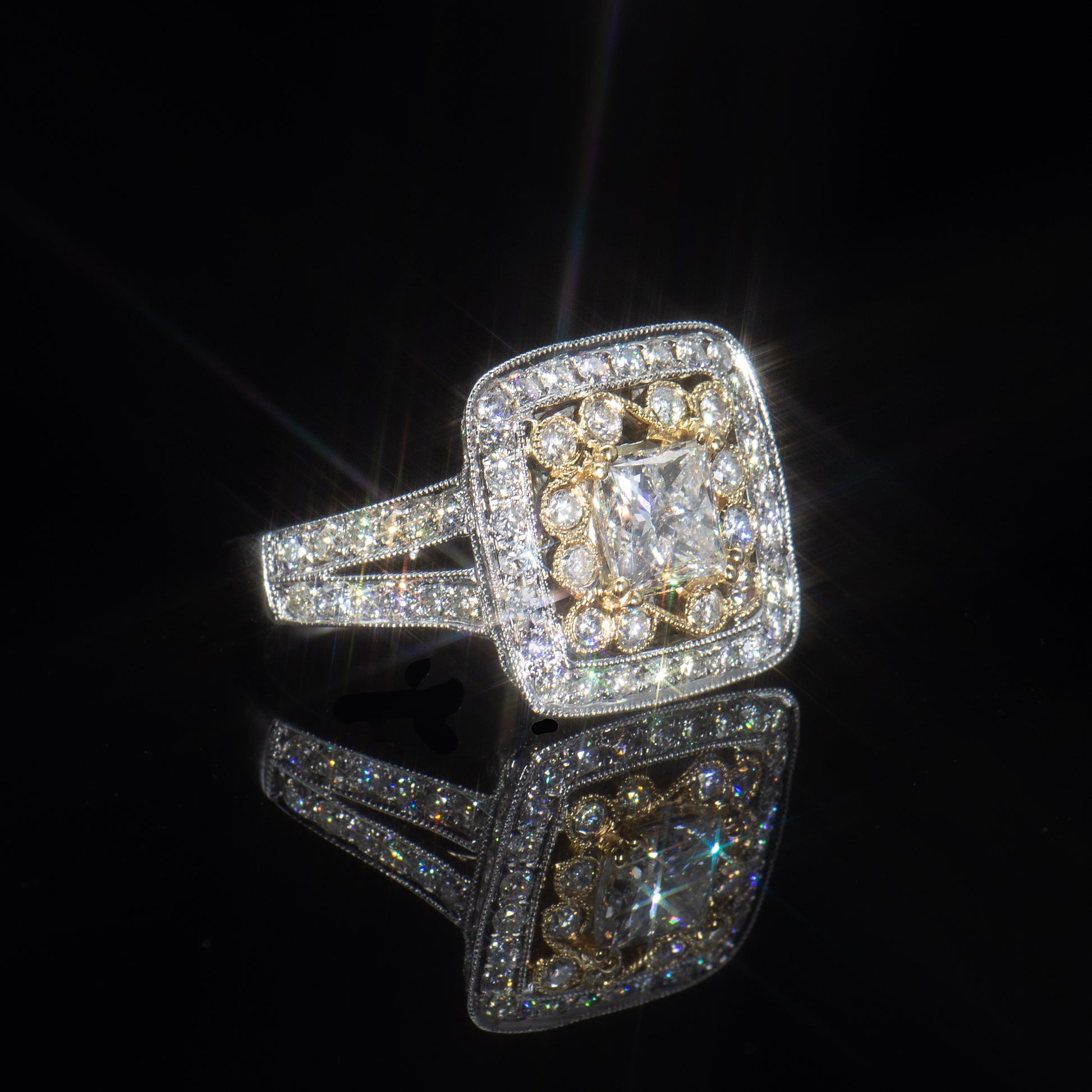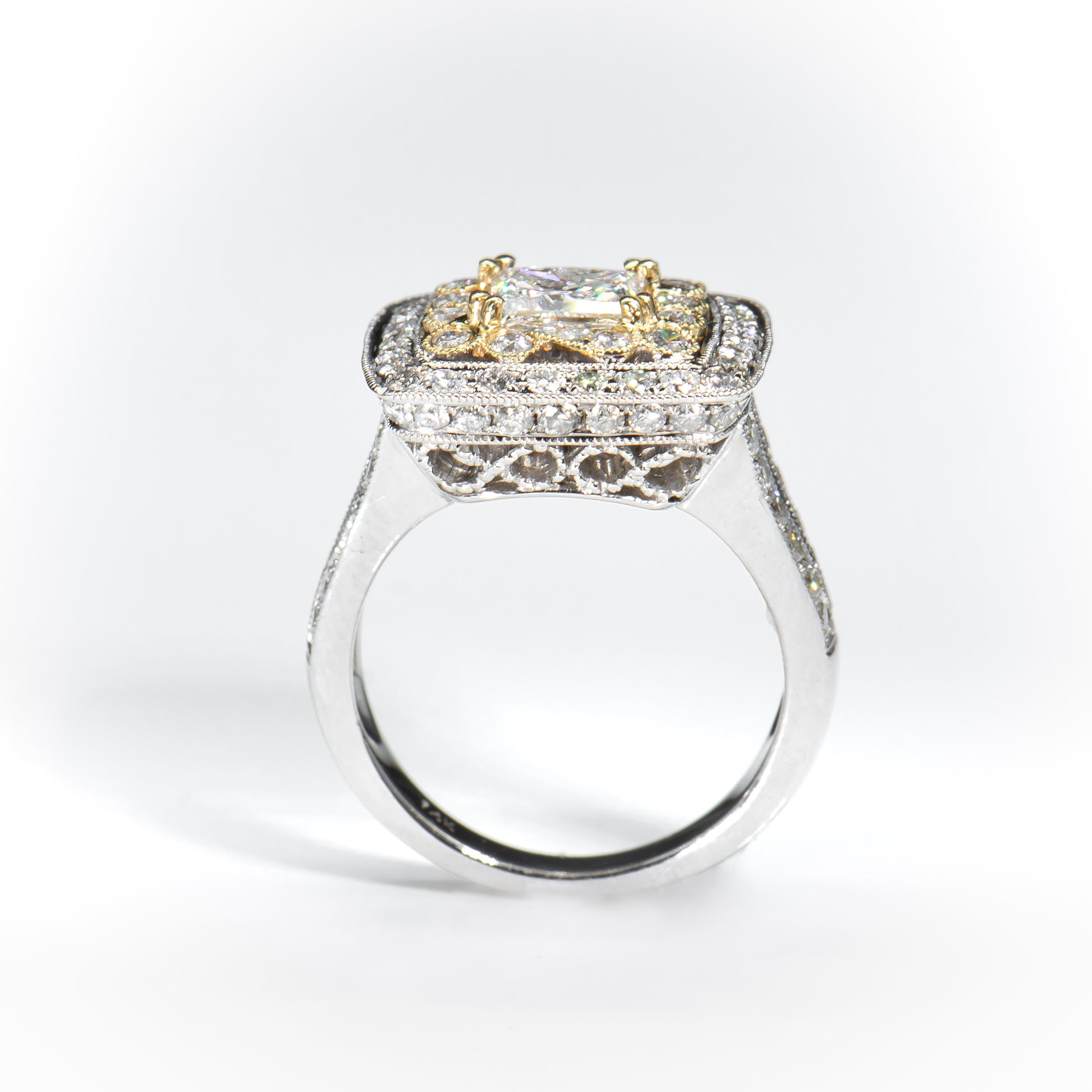 The design features a centered princess shape Earth mined natural diamond, weighing approximately 1.00 carat, bordered by graceful yellow gold swirls, each set with a full cut round diamond. This is surrounded by a glittering diamond halo. The split shank (band) twinkles with additional diamond accents.