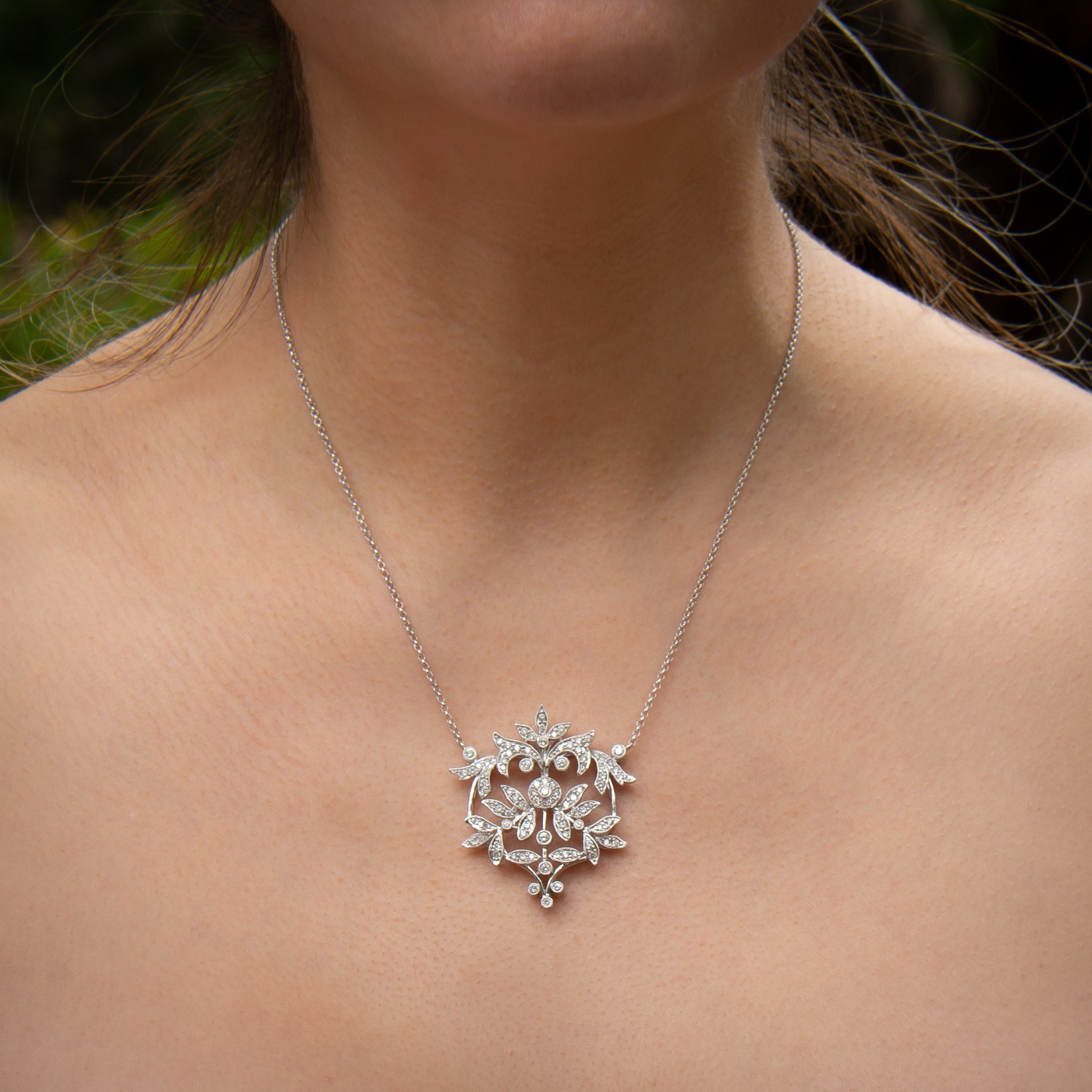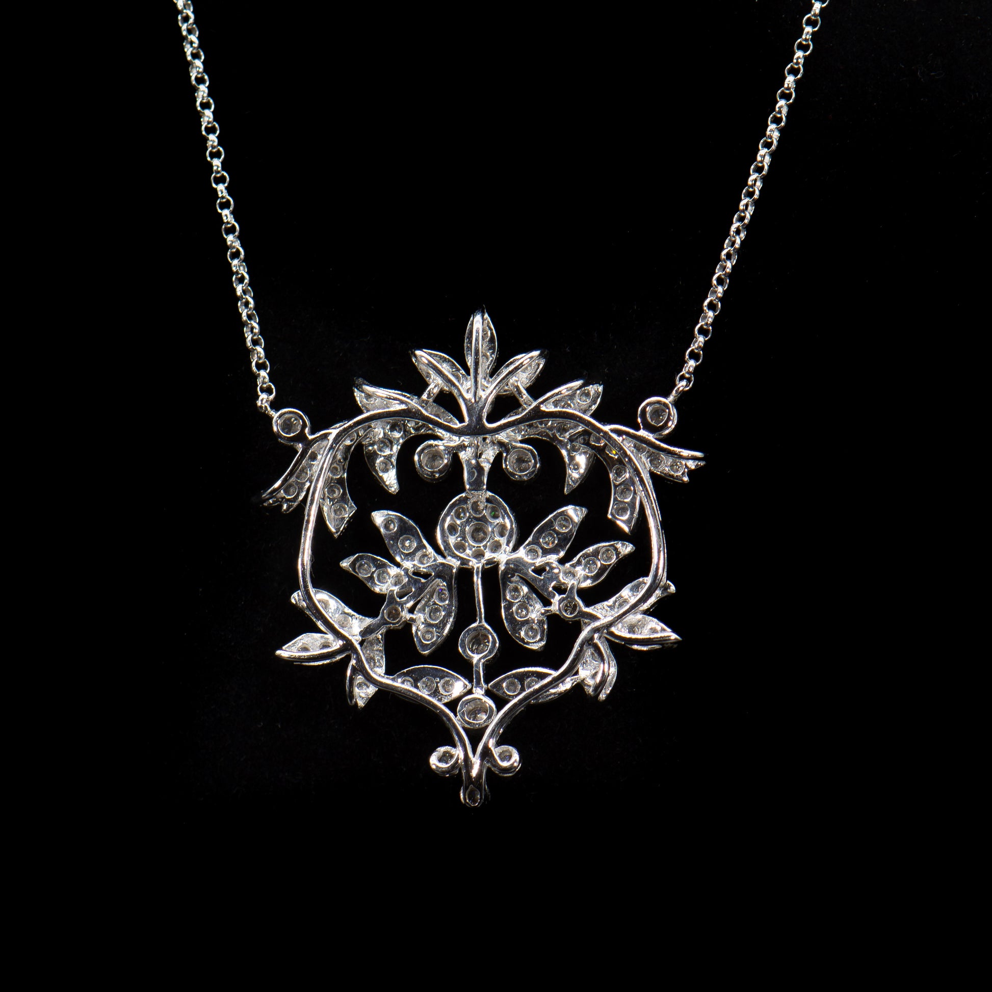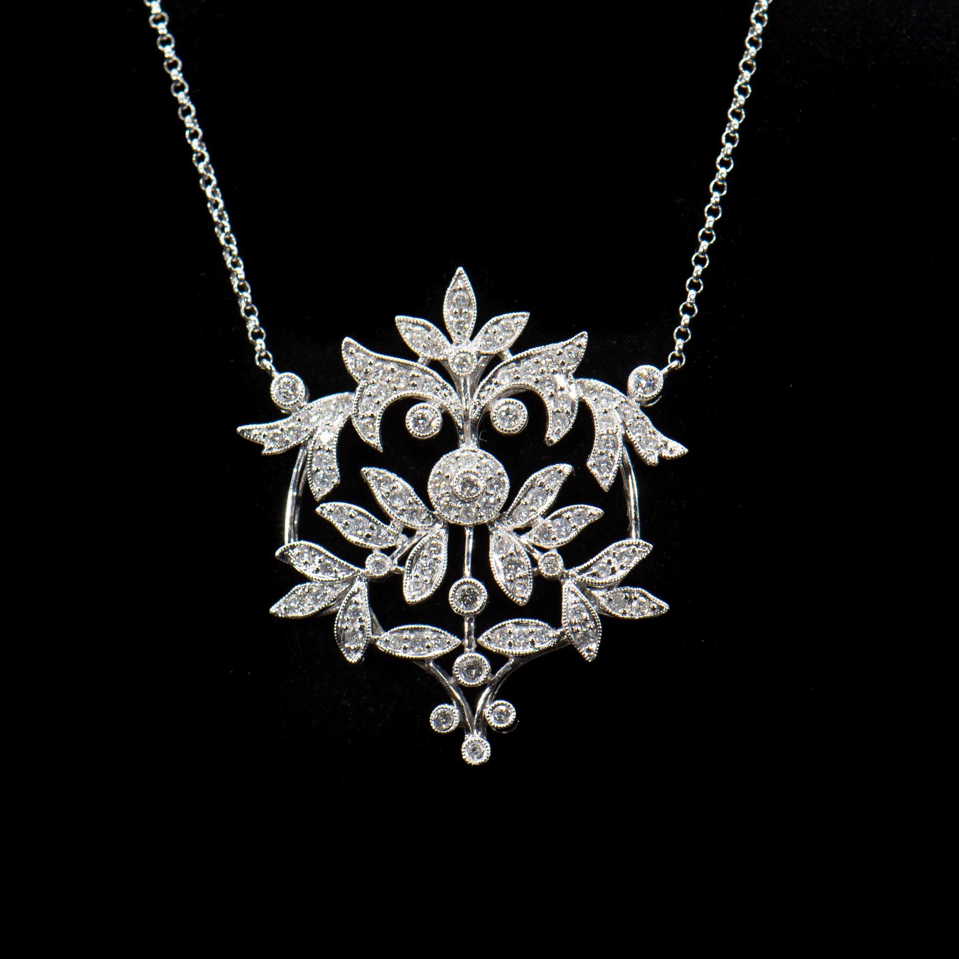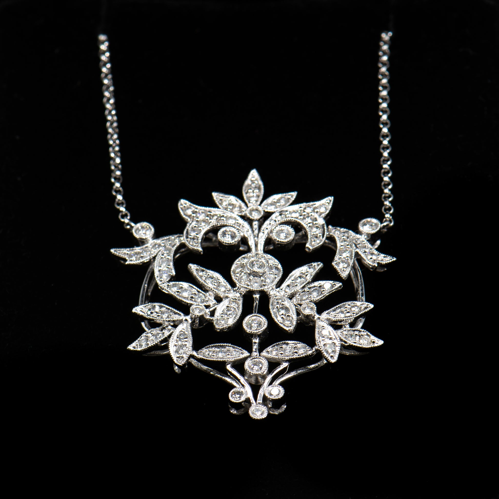 This exquisite Edwardian inspired diamond necklace is composed of sparkling full-cut Earth mined natural colorless white diamonds totaling approximately 2.00 carats set in high polish 14 karat white gold. The beautiful design of glittering vines, leaves and flowers is romantic, timeless and a perfect piece of jewelry for the bride.